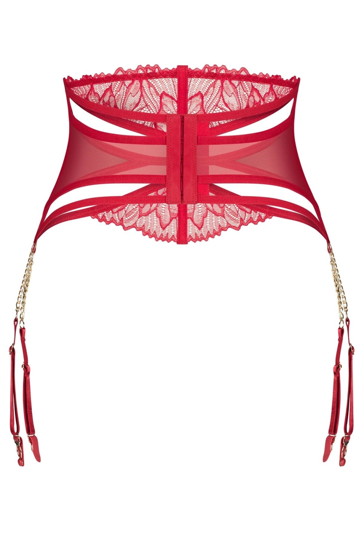 Jeho precizně navržený střih s jemnými kosticemi krásně tvaruje siluetu a zvýrazňuje pas. Kombinace krajky a elastických pásků dodává modelu moderní, svůdný charakter. Zlaté řetízky, které spojují pás s uchycením na punčochy, působí luxusně a zároveň zůstávají smyslným detailem, který upoutá pohled. Díky nastavitelným popruhům a víceúrovňovému zapínání se dokonale přizpůsobí postavě.
