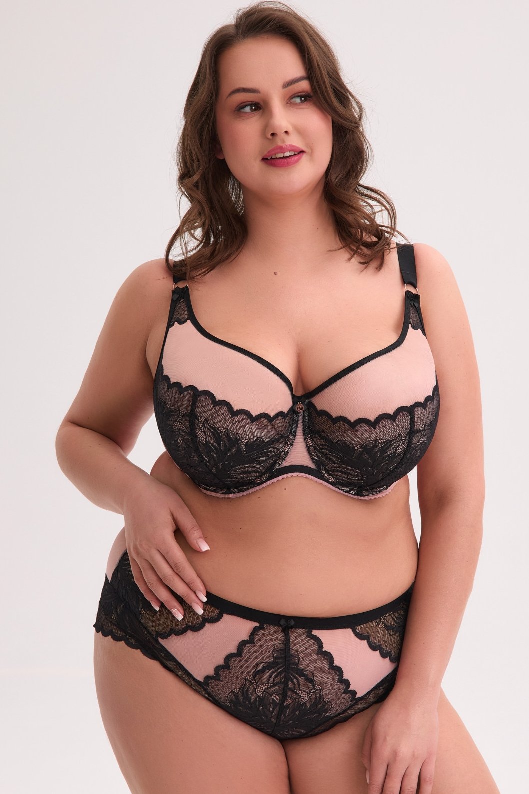 Spodní část košíčků je z jemné pěny, horní část z průsvitné síťoviny působící lehce a svůdně. Plynule nastavitelná ramínka a pečlivě navržený střih zajišťují dokonalé přizpůsobení každé postavě. Střed i ramínka zdobí koketní mašličky. Obvod podprsenky je hladký bez bočních výztuh, zapínání řeší dva až tři háčky s třístupňovou regulací.