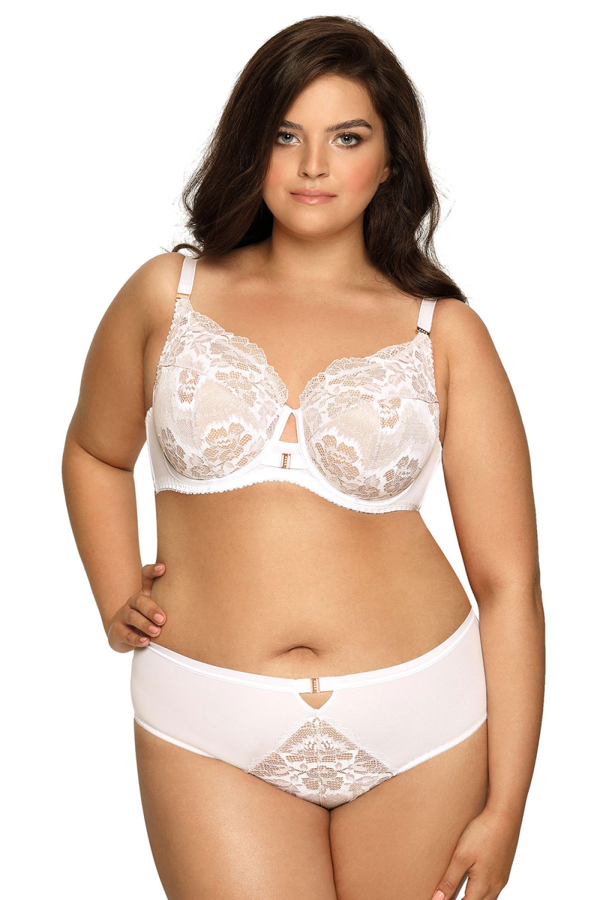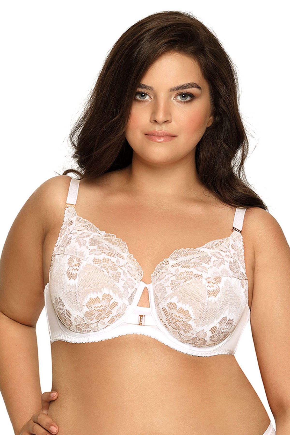 Jste fanynkou elegantního, nestárnoucího prádla? Tak to by vám neměla uniknout tato bílá kráska! Podprsenka ve verzi semi-soft. Tedy polovyztužené košíčky, které mají výztuhu jen ve spodní části. Košíčky zvýrazňuje krajka s motivem květin. Mezi košíčky vyniká ozdoba, košíčky jsou podšity béžovou bavlnou. Ramínka můžete dle libosti regulovat, ne však odepnout. Obvod dobře přiléhá k tělu, poskytuje komfort a pohodlí. Luxusní kousek, se kterým si budete užívat každou chvilku dne.