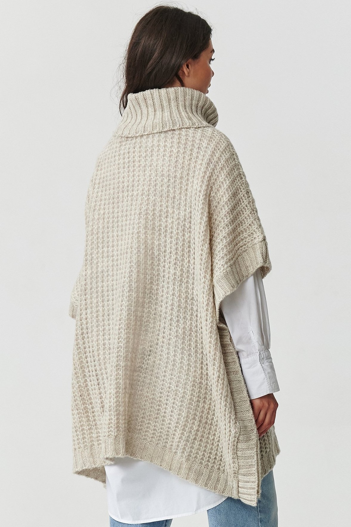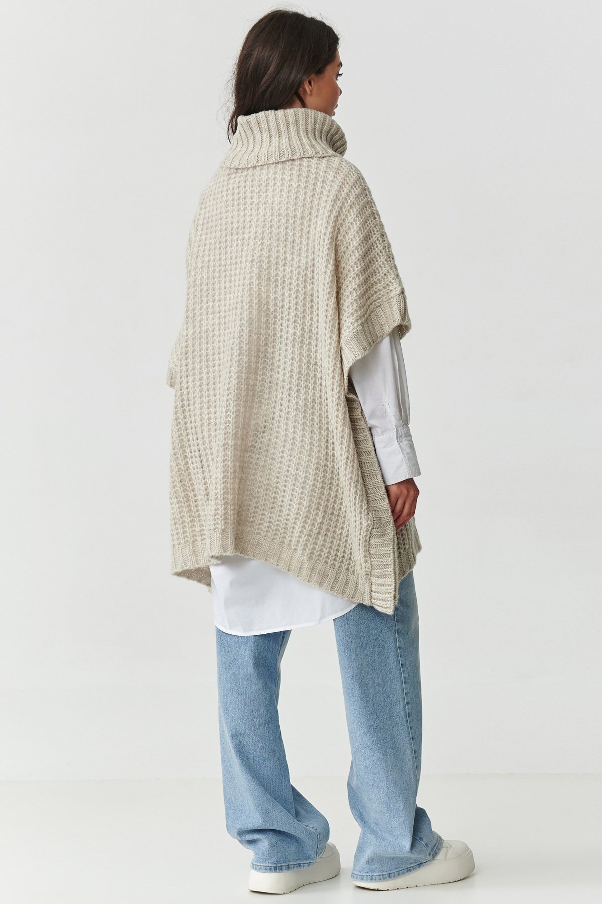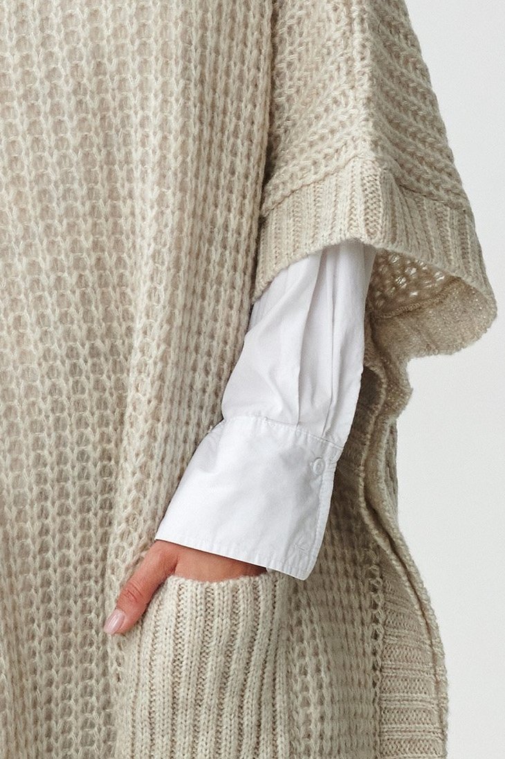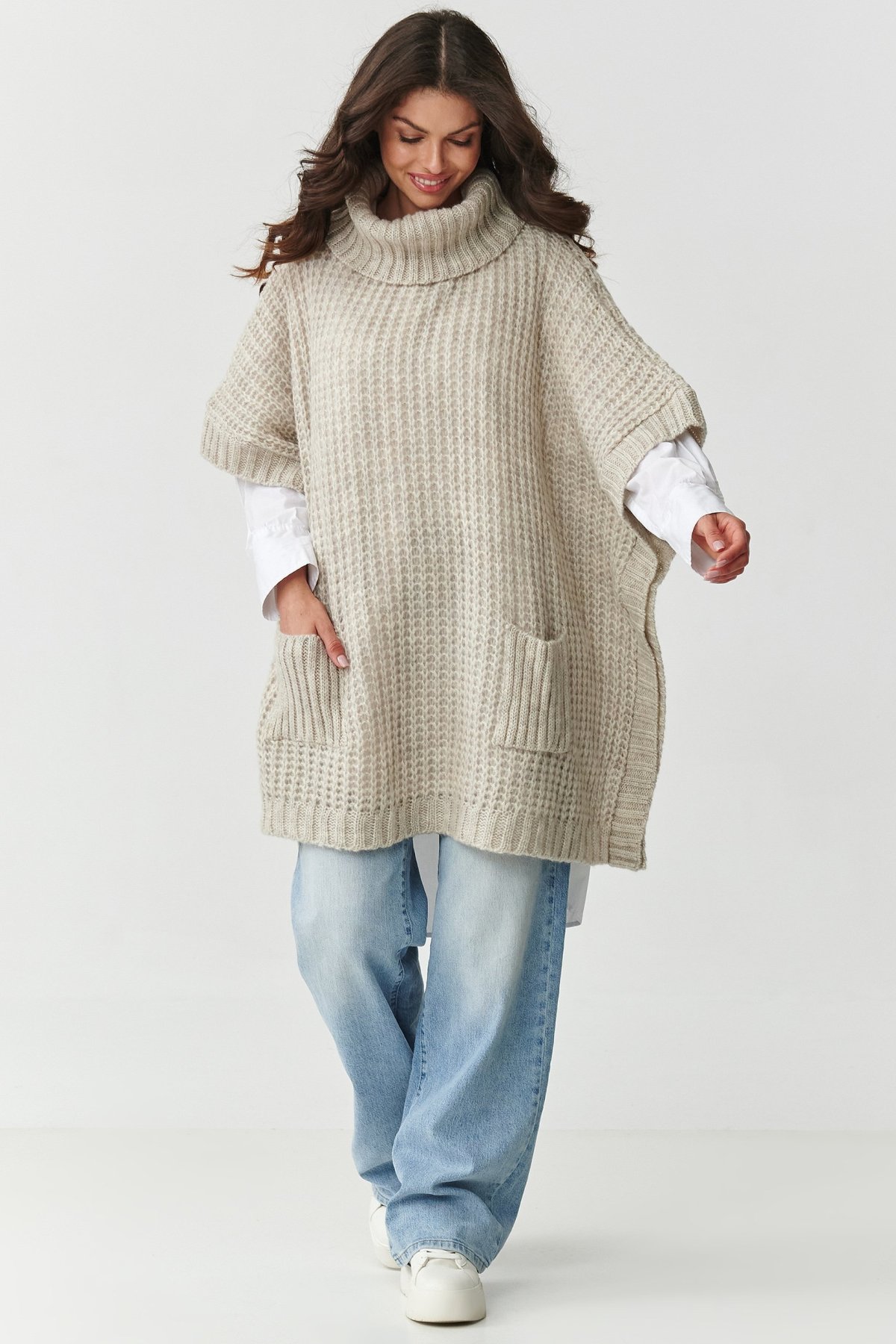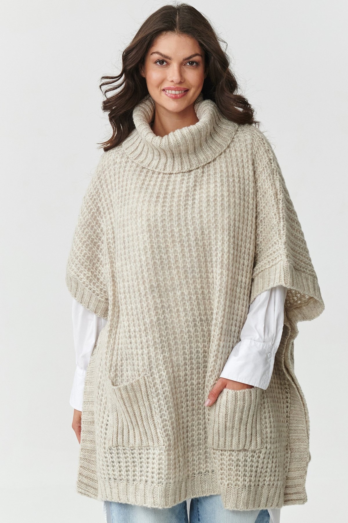 Odhalte tento výjimečný dámský svetr v podobě ponča, které v sobě spojuje módní design a neobvykle komfortní střih. Volný oversize střih s rukávy dlouhými k loktům a vysokým, volným límcem, krásně zahalí postavu a dodá ji nejen příjemné teplo, ale i žádoucí šmrnc. Praktické ,velké kapsy na přední straně svetru dodávají celku casual charakter a zaručují, že se tento kousek bude hodit pro každodenní nošení, ale doplní i elegantnější outfity. Rukávy i spodní lem jsou zakončeny úzkou manžetou. Pončo je vyrobeno ze směsice vláken akrylu, polyestru, vlny a polyamidu. Díky tomu je perfektně měkké, příjemné na dotek a zároveň pevné a odolné proti vytahání. Tlustý úplet dodává celku speciální charakter, což z něj tvoří stylový doplněk pro podzimní i zimní outfity. Nadčasové, moderní barvy se hodí ke všemu. Světle béžová představuje klasiku hodící se ke všemu, tmavě zelená je výrazná a elegantní, hnědá zase příjemně teplá a smyslná a grafitová moderní i univerzální. Pokud hledáte svetřík, který bude praktický i stylový zároveň - tohle je trefa do černého! Krásně vynikne s džínami, leginami nebo i klasickou košilí jako efektní, vrstvená stylizace. Vsaďte na teplo, pohodlí a nadčasovou eleganci - vyberte si tento kousek s rolákem a kapsami, který se rychle stane jedním z nejoblíbenějších prvků vašeho šatníku.