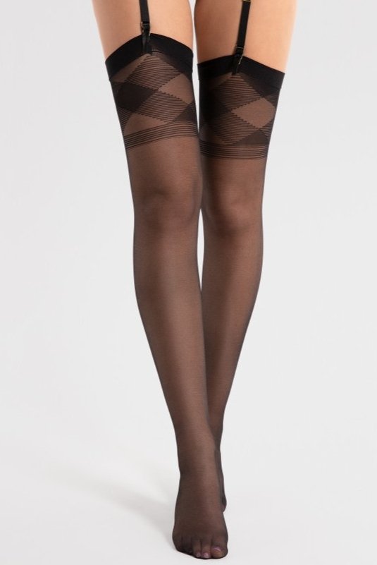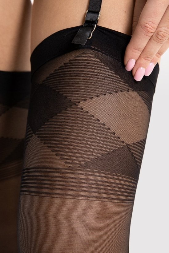 Tyto punčochy do podvazkového pásu zaujmou čistým minimalismem a zároveň detailním geometrickým vzorem na horním lemu. Právě kontrast mezi hladkou, jemnou základnou a výraznějším „topem“ vytváří efekt, který působí elegantně a smyslně bez přehánění. Černá barva se snadno kombinuje s krajkou, saténem i jednoduchým prádlem a hodí se jak na výjimečné večery, tak i na dny, kdy chcete mít pod oblečením něco extra. Geometrické struktury přitahují pohled a opticky dodávají nohám šmrnc, zatímco celkové provedení zůstává nadčasové a uhlazené.