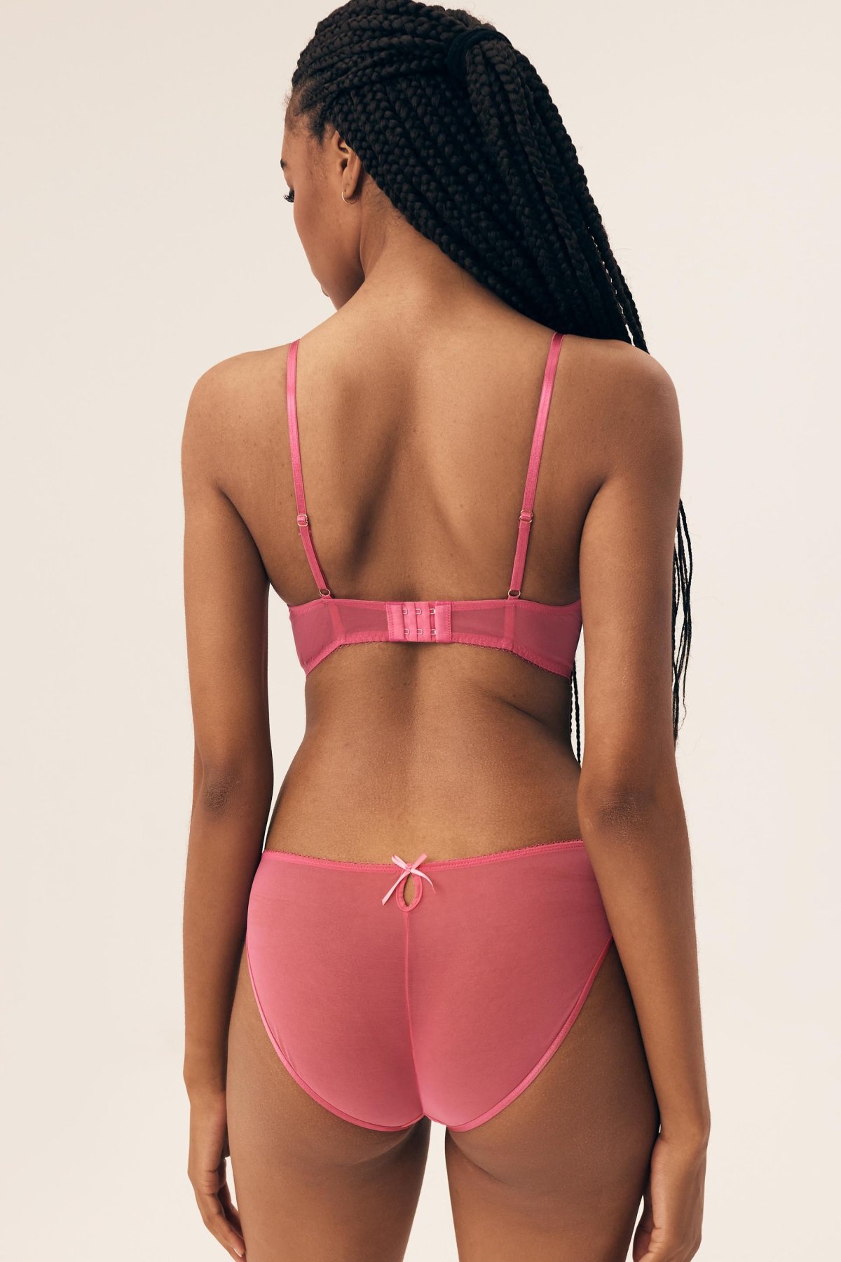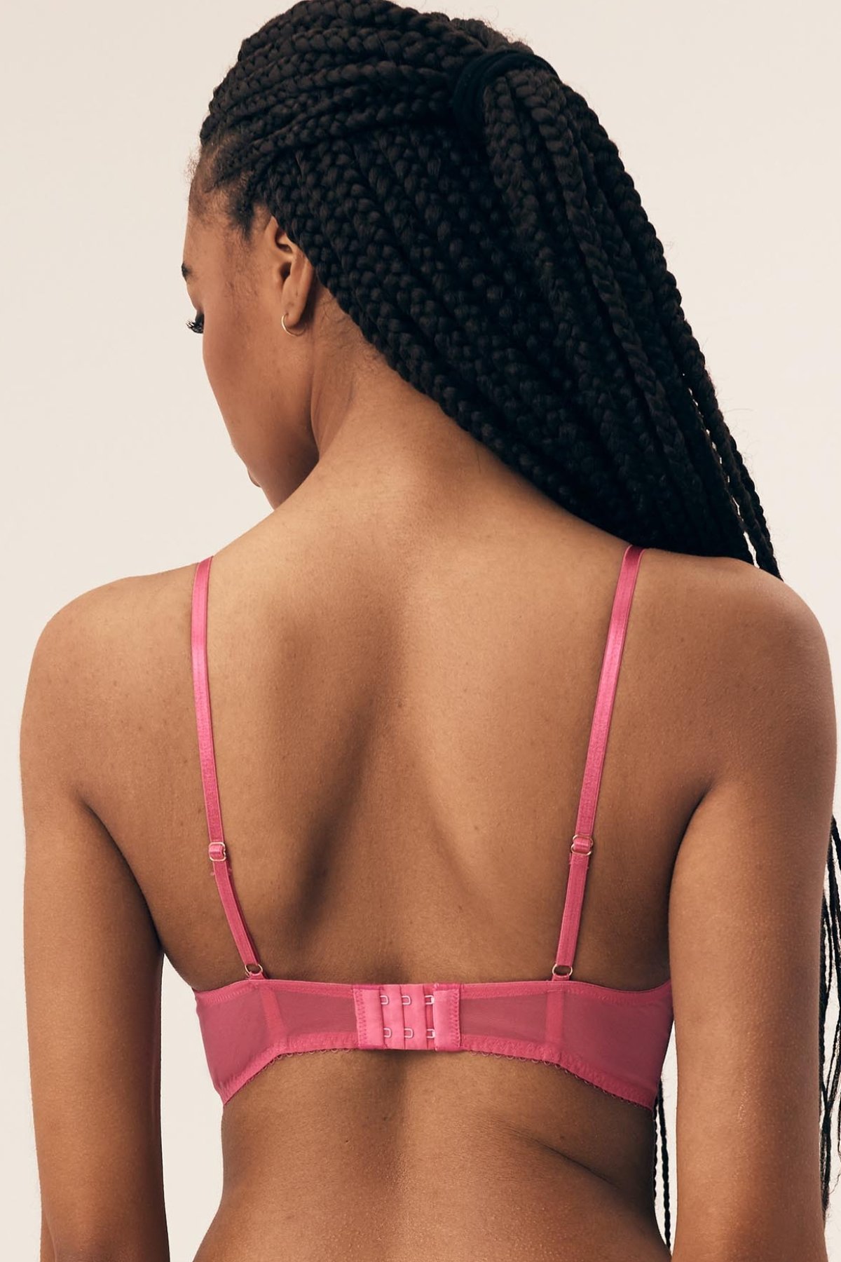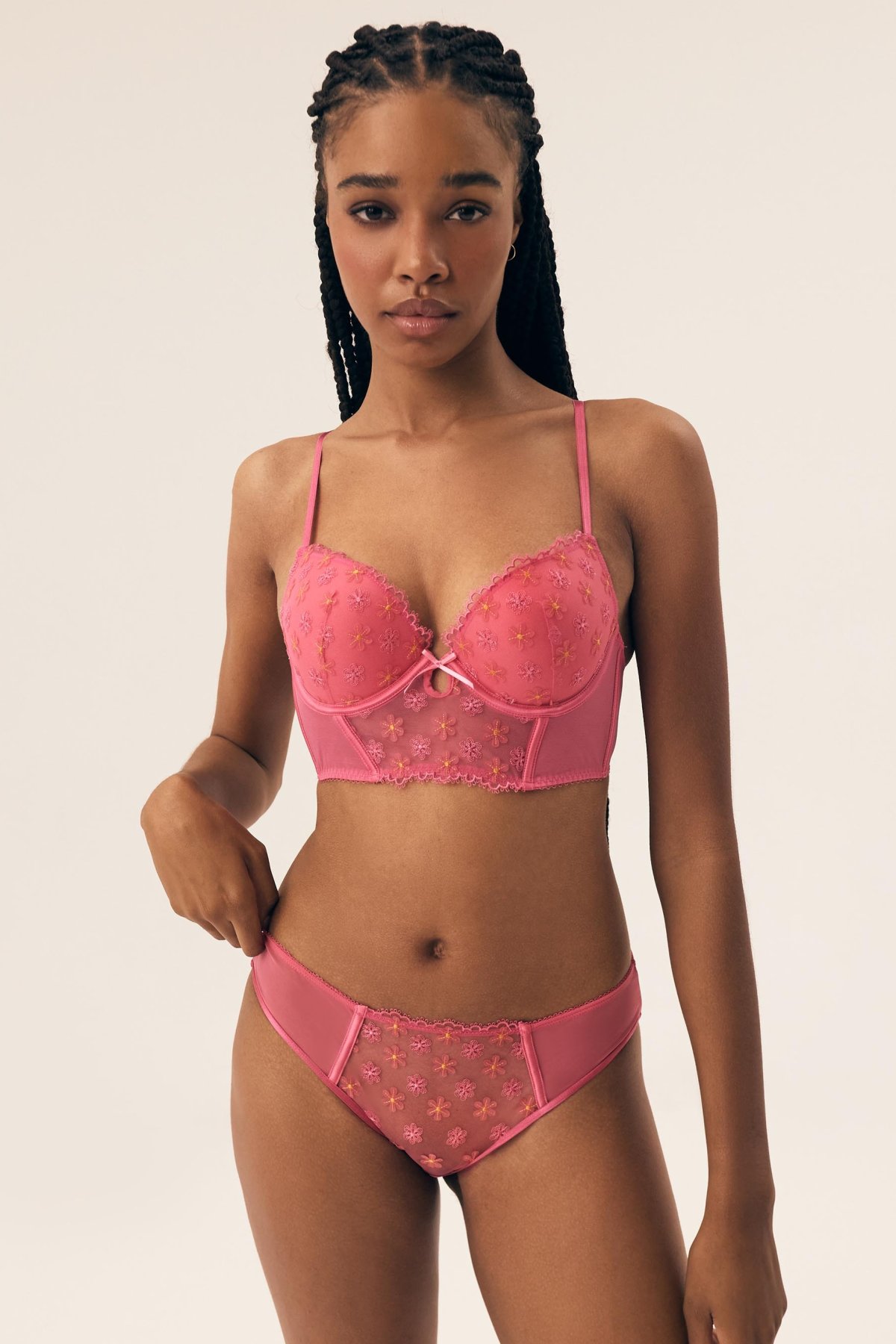 Push-up podprsenka Bloomy v růžovém odstínu spojuje romantický vzhled s výraznějším tvarováním dekoltu. Vyztužené košíčky s kosticemi pomáhají prsa nadzvednout a lépe vytvarovat, zatímco prodloužený spodní díl v polokorzetovém stylu dodává modelu nápadnější siluetu a zároveň působí stabilněji na těle. Přední část zdobí květinová výšivka a drobná dekorativní mašlička, které podtrhují jemnější charakter modelu. Spodní linie přechází do transparentní síťoviny, takže podprsenka nepůsobí těžce a zachovává si lehkost i přes výraznější střih. Nastavitelná ramínka usnadňují správné usazení a podporují pohodlné nošení během dne. Samozřejmostí je i klasické zapínání na háčky.