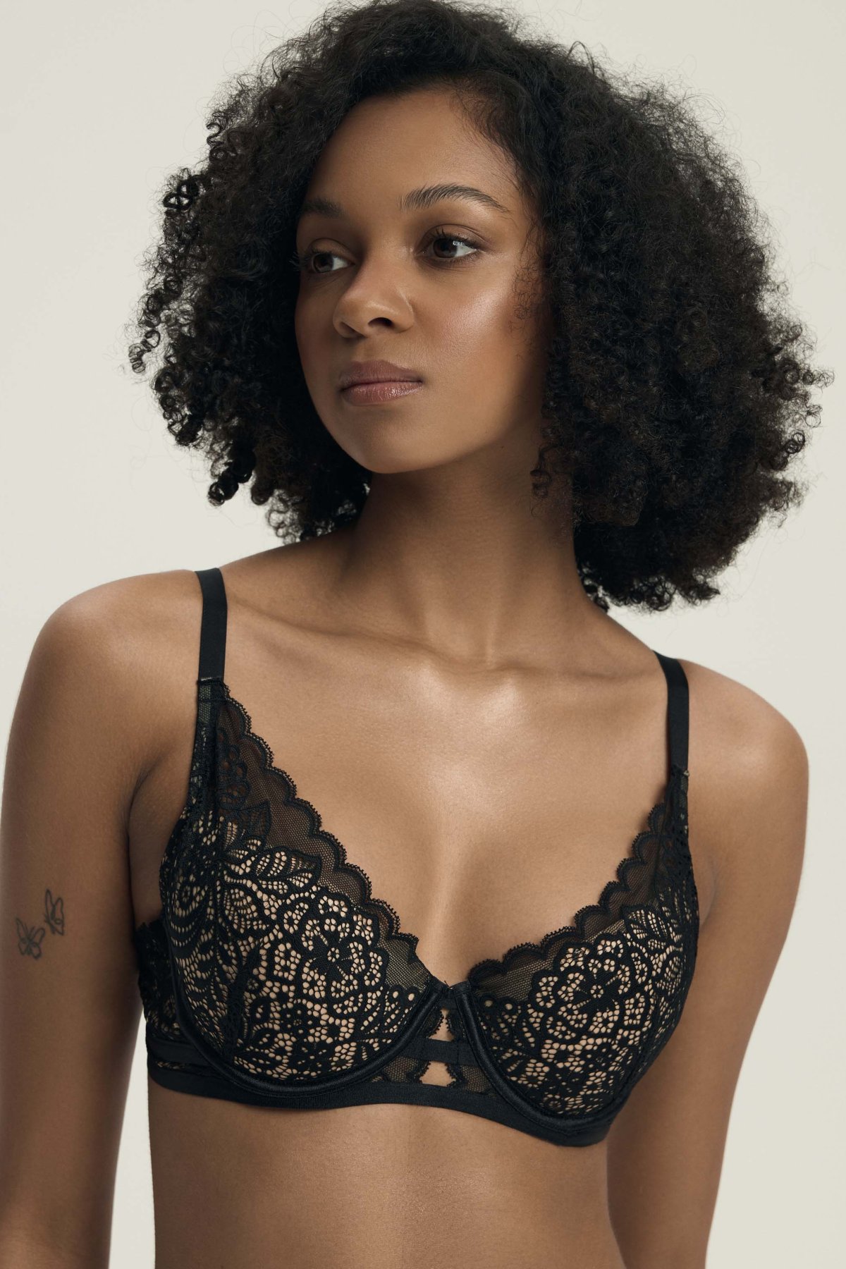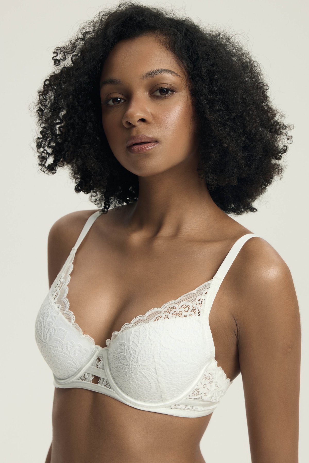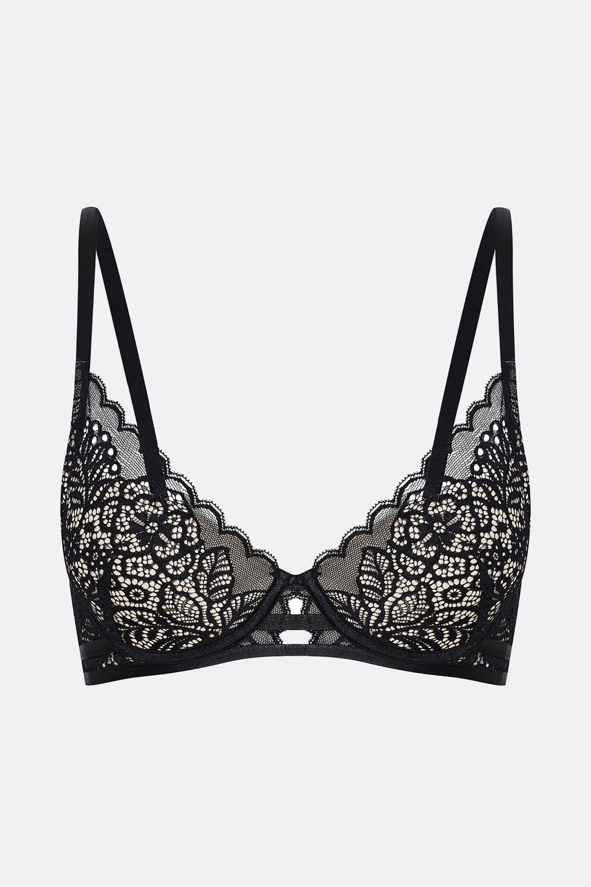 Vyztužené košíčky spolu s kosticemi zajišťují pevnou oporu a přirozené pozvednutí prsou. Střih tvaruje poprsí směrem ke středu a zvýrazňuje linii do V, což oceníte zejména u hlubších výstřihů. Střed mezi košíčky je nízký a plynule navazuje na dekorativní pásky ve spodní části, které dodávají modelu romantický nádech. Krajka je jemná, prodyšná a zakončená lehce zvlněným okrajem, který působí elegantně a žensky. Ramínka jsou plně nastavitelná. Zadní část je vybavena klasickým zapínáním na háčky s možností úpravy obvodu, díky čemuž si podprsenku snadno přizpůsobíte své postavě.