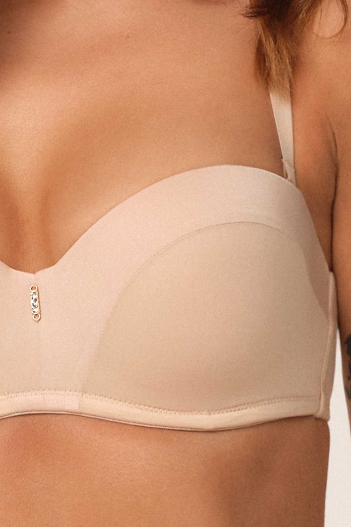 Balkonetový střih krásně modeluje horní linii prsou a vytváří plnější efekt díky integrované push-up výztuži. Střed mezi košíčky je středně vysoký a zdobený jemným bižuterním detailem, který dodává modelu ženský akcent. Hladké provedení působí elegantně. Ramínka jsou odepínatelná a plně nastavitelná, takže podprsenku lze nosit i pod šaty či topy s odhalenými rameny. Silikonové prvky na vnitřní straně pomáhají udržet model na místě i bez ramínek. Zadní zapínání je řešeno háčky s možností úpravy obvodu pro přesné přizpůsobení postavě.