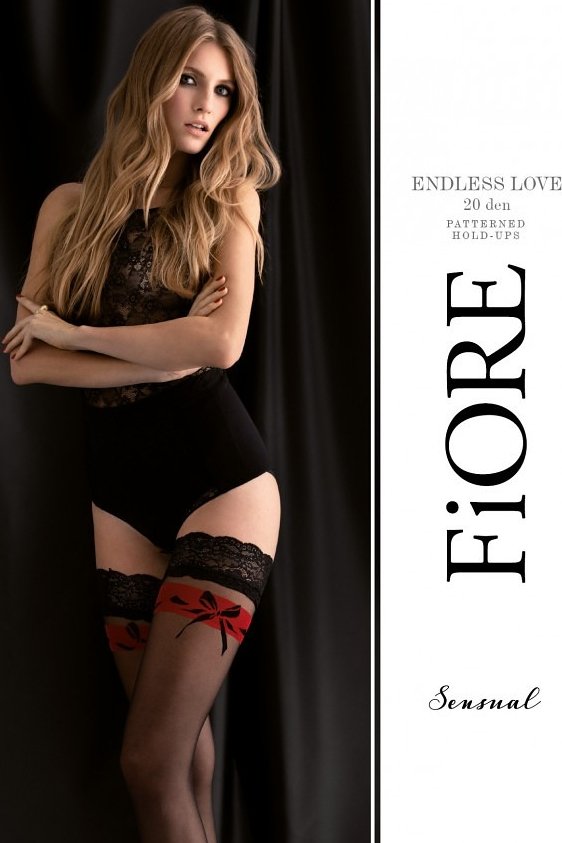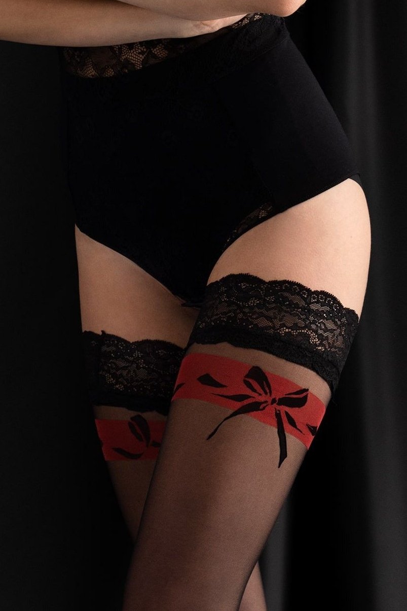 Samodržící punčochy Endless Love v sobě spojují ženskost, svůdnost a eleganci. Jemný mašličkový motiv doplněný kontrastem černé a červené barvy vytváří neodolatelně sexy efekt. Krajkové zakončení dodává punčochám romantický nádech, zatímco silikonový lem zajišťuje pohodlné nošení bez sklouzávání. Model Endless Love je ideální pro speciální příležitosti i večery, kdy chcete zaujmout jemnou rafinovaností.