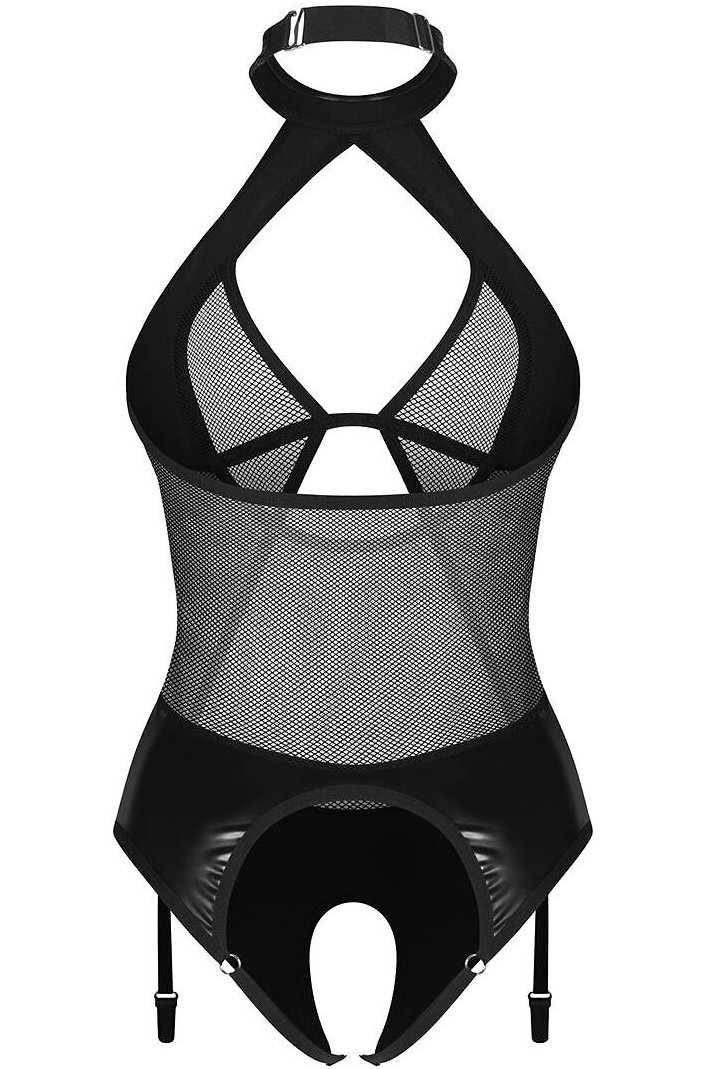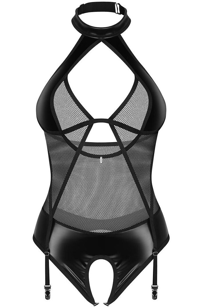 Tento svůdný model z kolekce Dominna spojuje lesklou eleganci s odvážným designem. Body z imitace kůže a průhledné síťoviny působí jako magnet na pohledy – smyslně obepíná postavu, zvýrazňuje ženské křivky a přidává na sebevědomí. Provokativní otevřený rozkrok a hluboký výstřih s pásky přitahují pozornost, zatímco chokers límeček kolem krku dodává celku dráždivý nádech dominance. Nastavitelné podvazkové pásky umožňují doplnit outfit oblíbenými punčochami a vytvořit tak kompletní, dokonale svůdný look. Ideální volba pro odvážné ženy, které chtějí prožít nezapomenutelné okamžiky plné vášně a elegance.