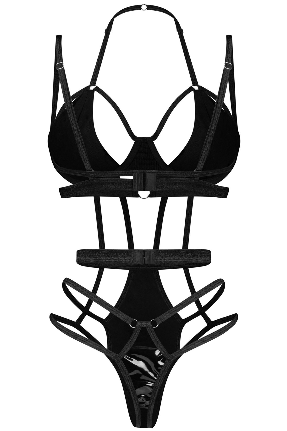 Lesklý materiál přiléhá k tělu a zvýrazňuje ženské křivky. Strategicky umístěné pásky podtrhují linii pasu a boků. Nastavitelná ramínka i pásek kolem krku umožňují dokonalé přizpůsobení postavě. Oválný přívěsek mezi košíčky a kovové prvky přidávají modelu moderní a odvážný vzhled. Tento kousek je ideální pro ženy, které milují kombinaci sebevědomí, smyslnosti a stylu.