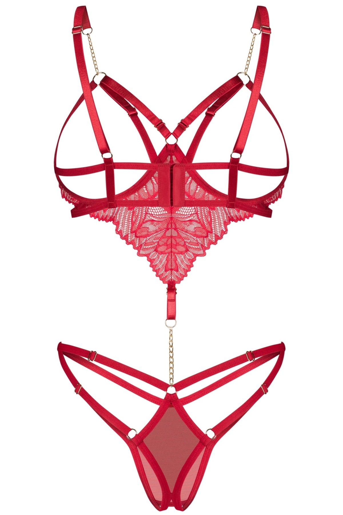 Jeho otevřený střih s kosticemi smyslně nadzvedává poprsí, zatímco průsvitná krajka a jemná síťovina lákají pohledy. Zlatý řetízek, který se táhne po těle, rafinovaně propojuje horní a dolní část, čímž vytváří dojem luxusu i provokace. Nastavitelná ramínka a pásky po bocích umožňují dokonalé přizpůsobení, aby body sedělo jako druhá kůže. Otevřený rozkrok dodává modelu neodolatelně odvážný charakter, který nenechá žádného partnera chladným.
