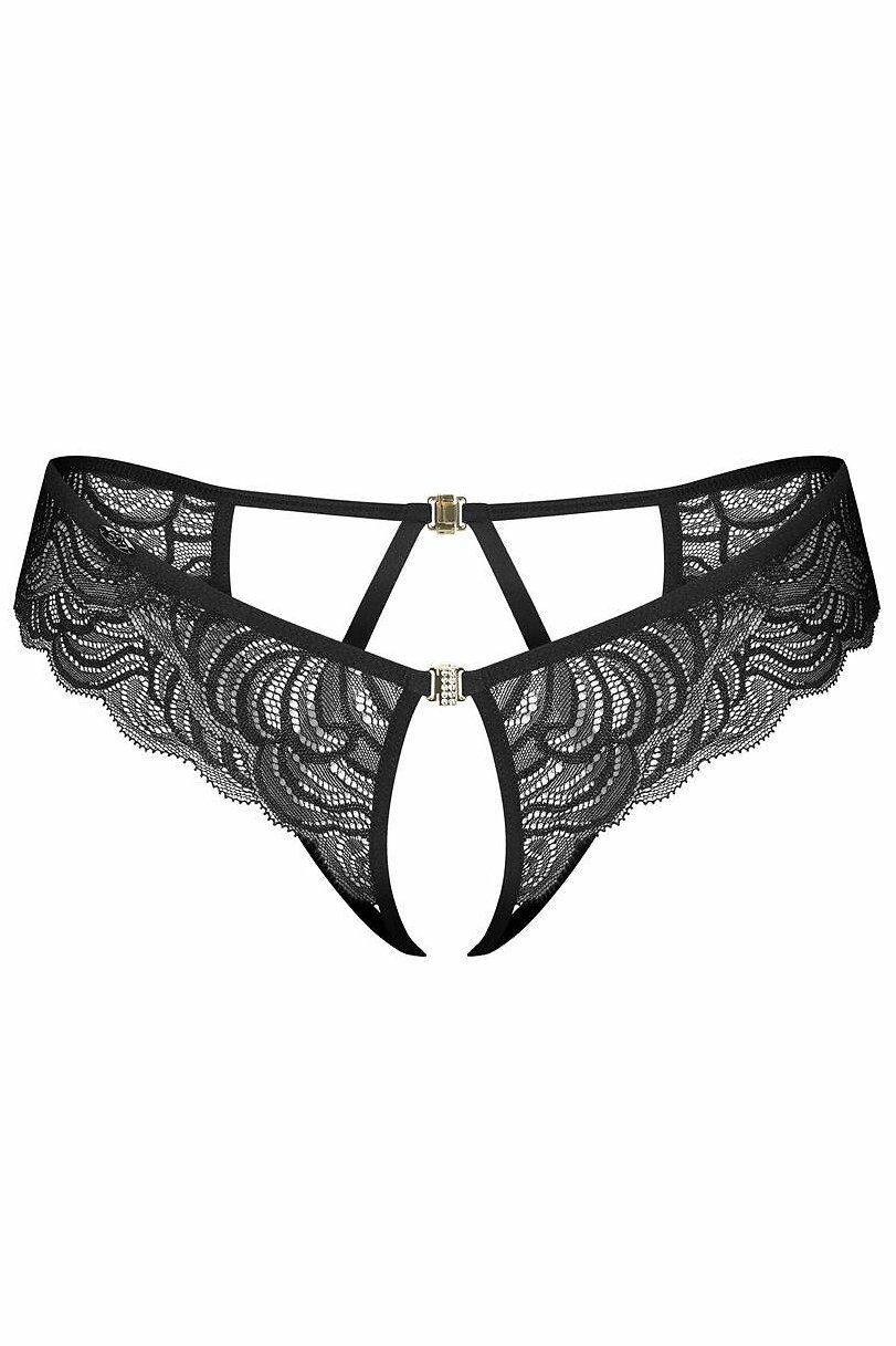 Tanga Divienne spojují jemnou krajku s výrazným střihem, který podtrhne ženské křivky a dodá celku svůdný charakter. Krajkové provedení krásně zvýrazňuje boky, zatímco zadní pásky vytvářejí nápaditý geometrický efekt a přitahují pozornost k siluetě. Luxusní akcent dodává ozdobný detail ve zlatém tónu, který elegantně doplňuje celý design. Pružný materiál se dobře přizpůsobí tělu a přispívá k pohodlnému nošení. Tento model je ideální pro chvíle, kdy hledáte spodní prádlo s výrazným stylem, které kombinuje jemnost, odvážné detaily a propracovaný vzhled.