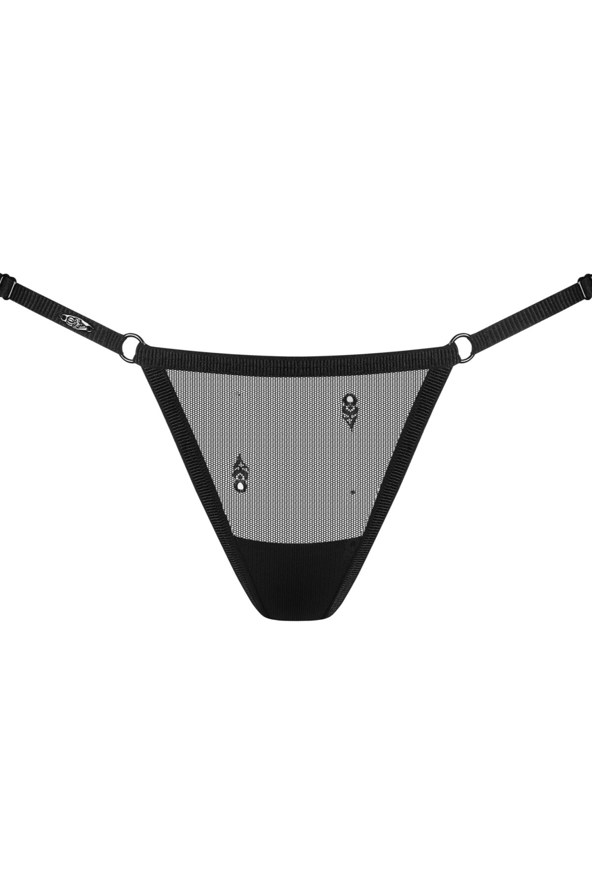 Kalhotky typu jockstrap staví na čisté eleganci a provokativním střihu. Transparentní přední díl z jemné síťoviny s žakárovým emblémem Obsessive působí luxusně a lehce, zatímco žebrované lemování dodává texturu a drží tvar. Zadní část tvoří rafinované nastavitelné pásky, které krásně zvýrazní boky a nechají vyniknout zadeček – přesně tak, jak chcete. Tenké linie se propojují s předním dílem pomocí hladkých černých kovových kroužků, které podtrhují moderní, „upscale“ vzhled. Díky nastavení sedí kalhotky pohodlně a přitom zůstávají maximálně svůdné. Černé akcenty a ikonické logo dodají finální, prémiový dojem – ideální k setům z kolekce i jako výrazný solitér.