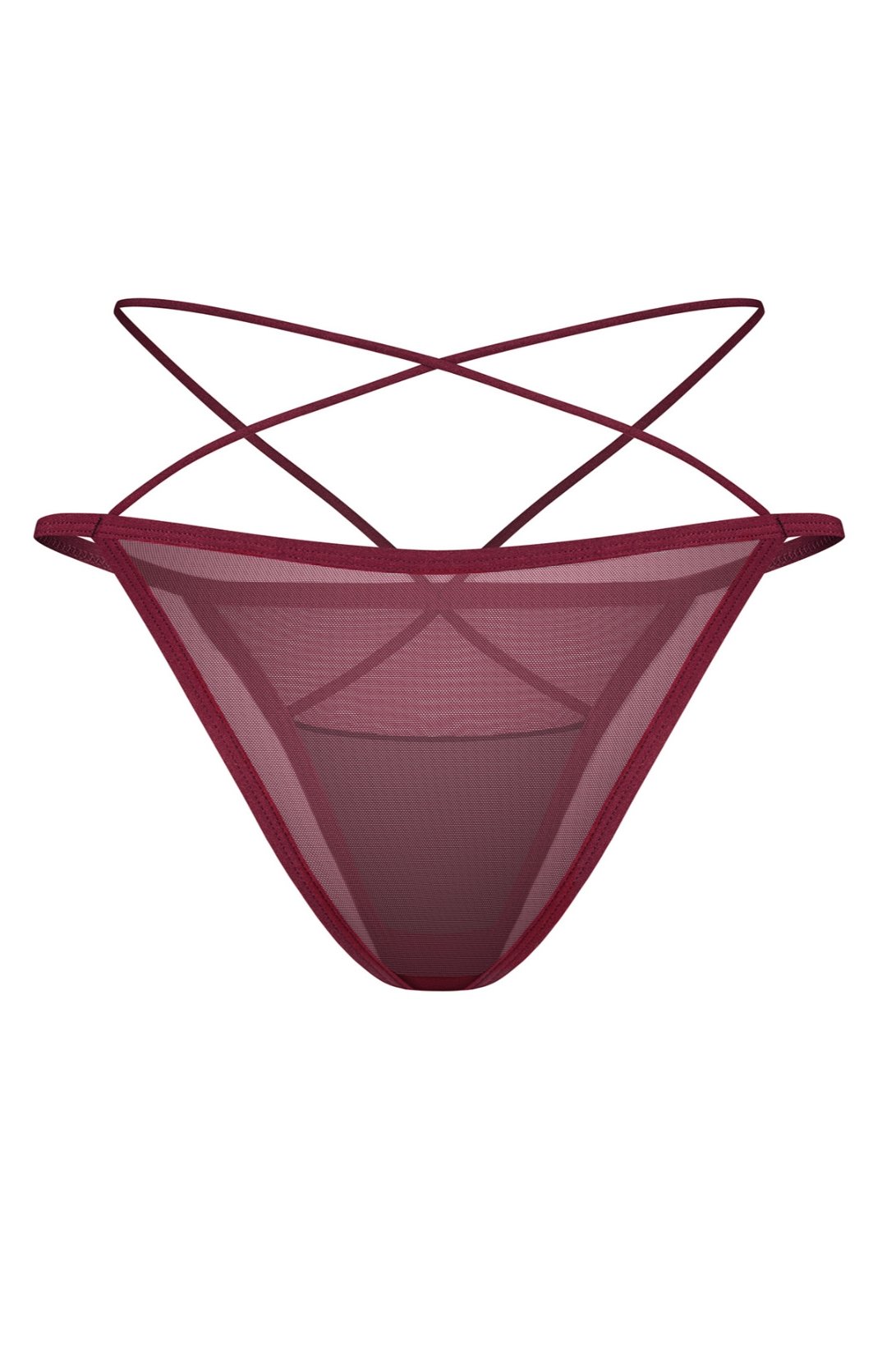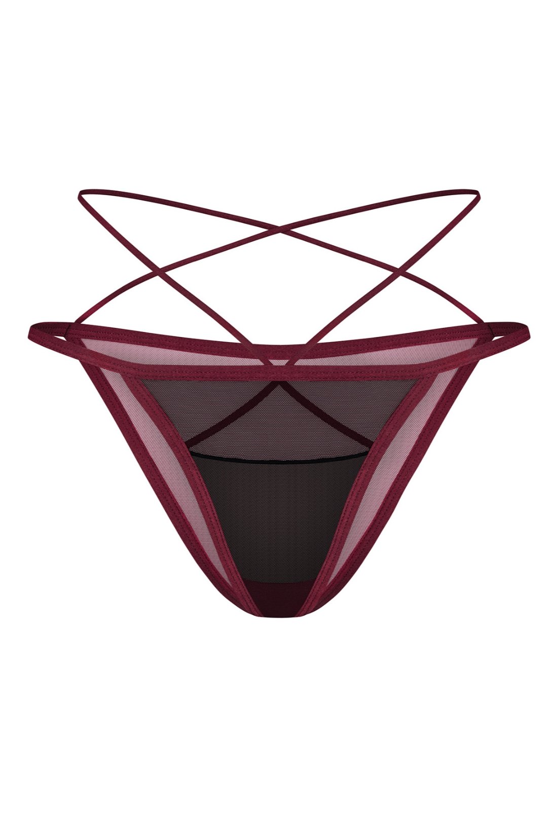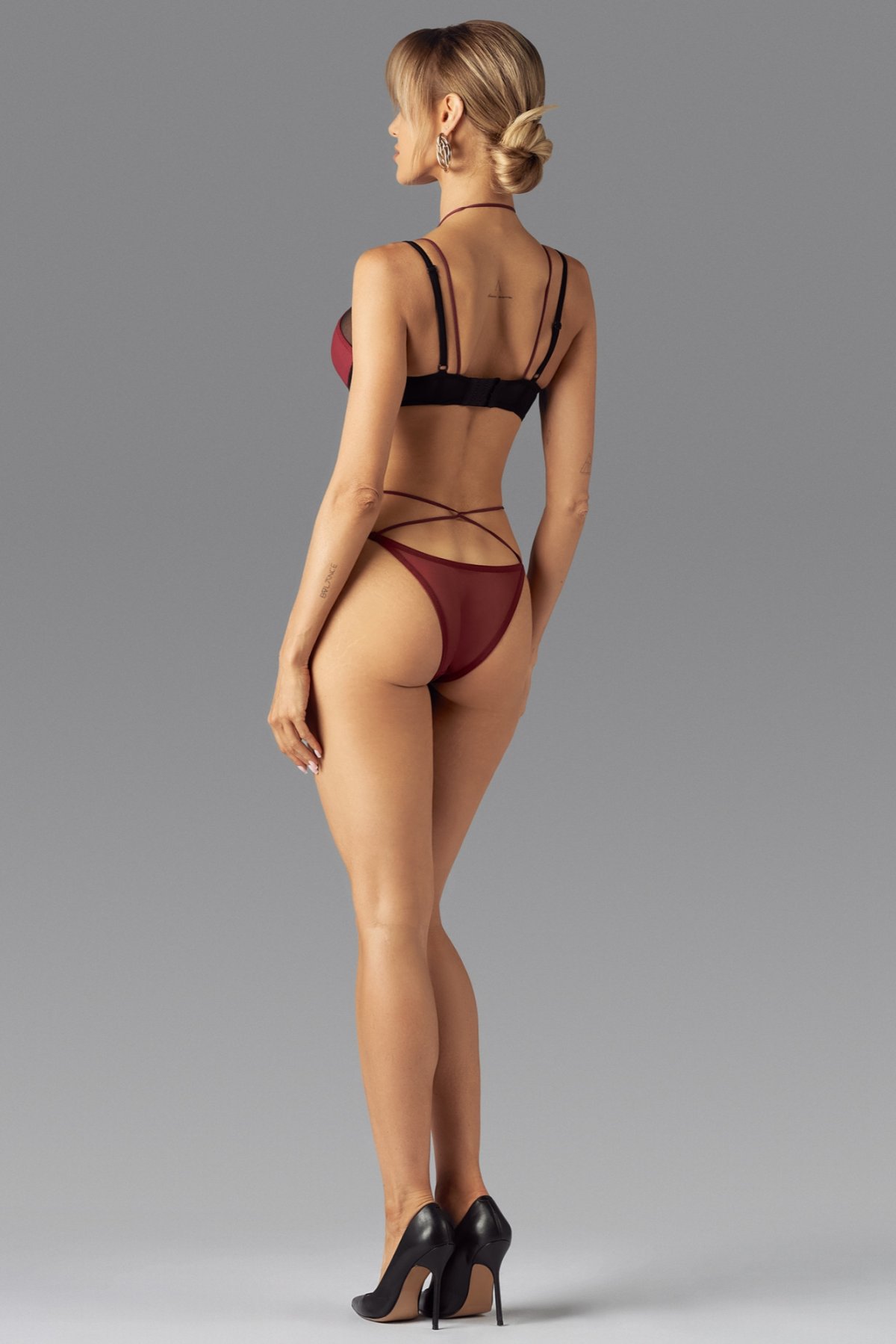 Mini kalhotky Parisel jsou nenápadné, ale přitom výrazně svůdné. Bordó odstín s černými akcenty působí luxusně a vytváří kontrast, který krásně vynikne na pokožce. Transparentní mesh dodává lehkost a ženský nádech, zatímco precizní lemování na linii boků zajišťuje upravený vzhled. Křížící se pásky vpředu i vzadu přitáhnou pohled, dodají modelu originalitu a zároveň jemně zdůrazní boky. Pružný materiál se pohodlně přizpůsobí tělu, takže se budete cítit dobře i při delším nošení. Skvěle doplní podprsenku či korzet z kolekce Parisel a vytvoří sladěný komplet s výrazným, moderním charakterem.