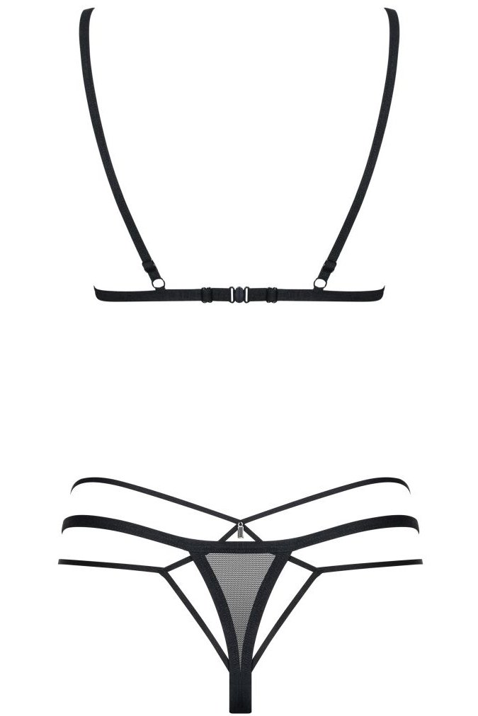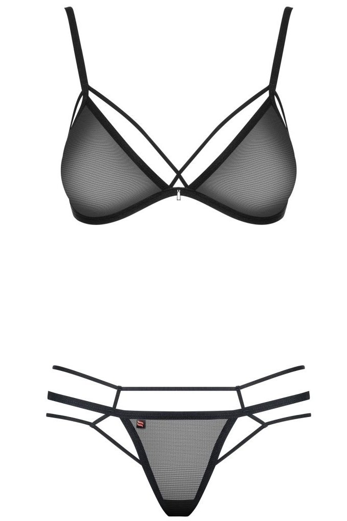 Svůdný komplet je ztělesněním elegance a smyslnosti. Průhledná síťovina lehce poodhaluje tělo, zatímco rafinované pásky vytvářejí podmanivý design, který zvýrazní ženské křivky a dodá vám sebevědomí. Podprsenka s kosticemi krásně tvaruje poprsí a díky nastavitelným ramínkům perfektně padne každé postavě. Minimalistická tanga s trojitým páskováním v bocích doplňují celý komplet a vytvářejí neodolatelný, moderní look. Měkký a elastický materiál se příjemně přizpůsobí pokožce a zaručí pohodlí při nošení. Ideální volba pro ženy, které chtějí spojit jemnost s odvážnou smyslností.