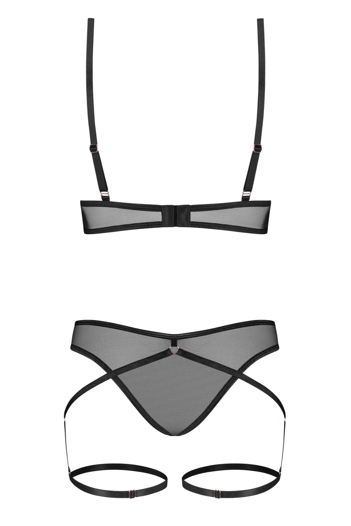 Smyslný komplet Euridia je ztělesněním ženské síly, elegance a neodolatelné přitažlivosti. Průhledná síťovina v černém odstínu svůdně odhaluje tělo, zatímco sofistikované pásky vytvářejí moderní, geometrický efekt. Otevřený střih podprsenky zvýrazňuje poprsí a dodává modelu odvahu, zatímco kalhotky s elastickými pásky na stehnech působí mimořádně sexy. Detaily v barvě růžového zlata přinášejí luxusní akcent a kontrast k minimalistickému designu. Díky plně nastavitelným prvkům se komplet dokonale přizpůsobí postavě a zaručí komfort při nošení. Tento model je ideální volbou pro výjimečné chvíle, kdy chcete vyzařovat sebevědomí a smyslnost.