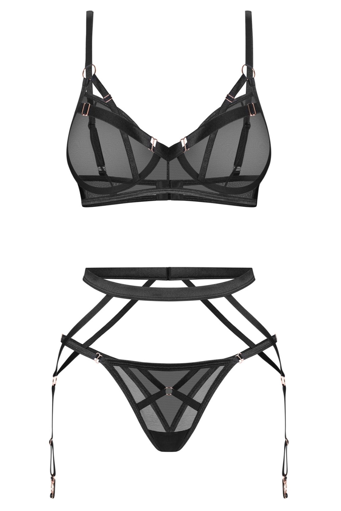 Celý komplet je vyroben z příjemného, pružného materiálu, jenž dokonale přiléhá k tělu a poskytuje komfort při nošení. Detaily v odstínu růžového zlata dodávají soupravě luxusní vzhled a zároveň neobsahují nikl, takže jsou šetrné i k citlivé pokožce. Nastavitelná ramínka a zapínání umožňují přizpůsobení postavě, aby každý detail dokonale ladil.