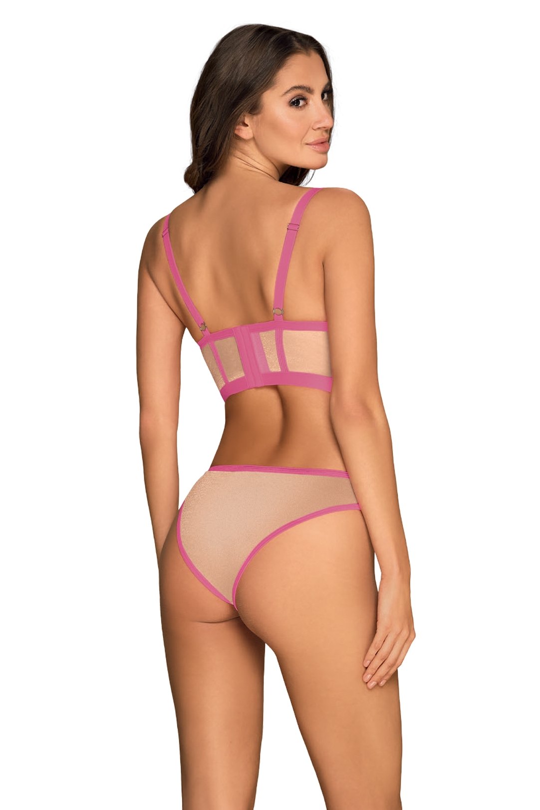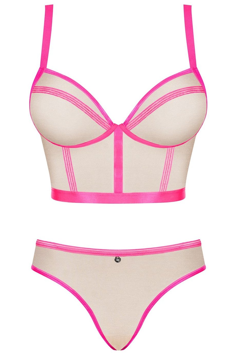 Dámský komplet vyniká odvážným, přesto elegantním designem, který přitáhne pozornost na první pohled. Kombinuje jemnou průsvitnou síťovinu s neonově růžovými lemy, které krásně zvýrazňují ženské křivky. Dlouhý střih topu s kosticemi dodává dekoltu přirozenou oporu a tvar, zatímco elastické materiály zaručují pohodlí při nošení. Kalhotky s vysokým výstřihem opticky prodlužují nohy a doplňují celkový svůdný vzhled. Ideální volba pro ženy, které chtějí propojit hravost s rafinovaností a cítit se výjimečně sebevědomě.