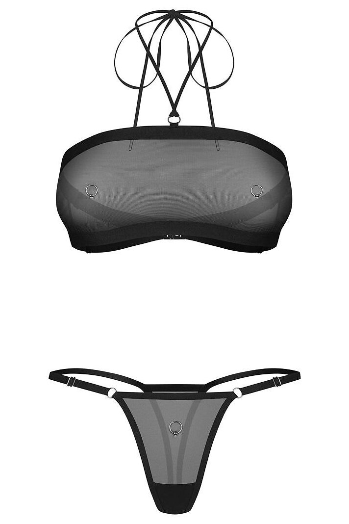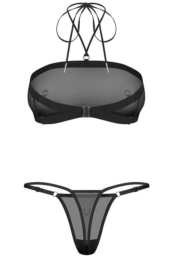Set topu a tang z transparentní síťoviny zaujme čistým, moderním vzhledem a lehce odvážným charakterem. Jemně průsvitný materiál se přizpůsobí tělu, příjemně obepne siluetu a podtrhne její linie. Top je doplněný pružným pásem pod prsy, který zajišťuje lepší stabilitu a zároveň zvýrazňuje pas. Nastavitelná ramínka a zavazování za krkem umožňují upravit padnutí podle potřeby. Celý model oživují stříbrné kroužky na přední straně, které dodávají kompletu výraznější a lehce provokativní akcent. Díky minimalistickému střihu a transparentnímu efektu působí set sebevědomě, moderně a nepřehlédnutelně.