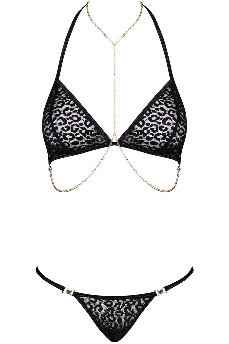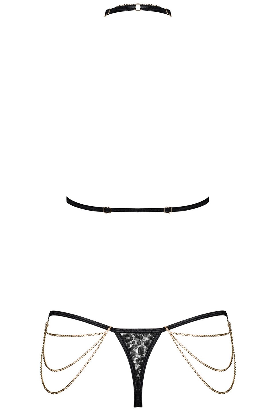 Set Pantheria od značky Obsessive přináší do ložnice dravou eleganci a neodolatelnou smyslnost. Kombinace průhledné síťoviny s leopardím vzorem, zlatých řetízků a minimalistického střihu tvoří model, který podtrhne každou křivku. Podprsenka s trojúhelníkovými košíčky a jemným zdobením zvýrazní dekolt, zatímco tanga s efektními kovovými detaily dokonale doplní celý look. Díky nastavitelným popruhům se set přizpůsobí postavě a zajistí maximální pohodlí při nošení. Ideální volba pro výjimečné chvíle, kdy chcete být nezkrotně svůdná.