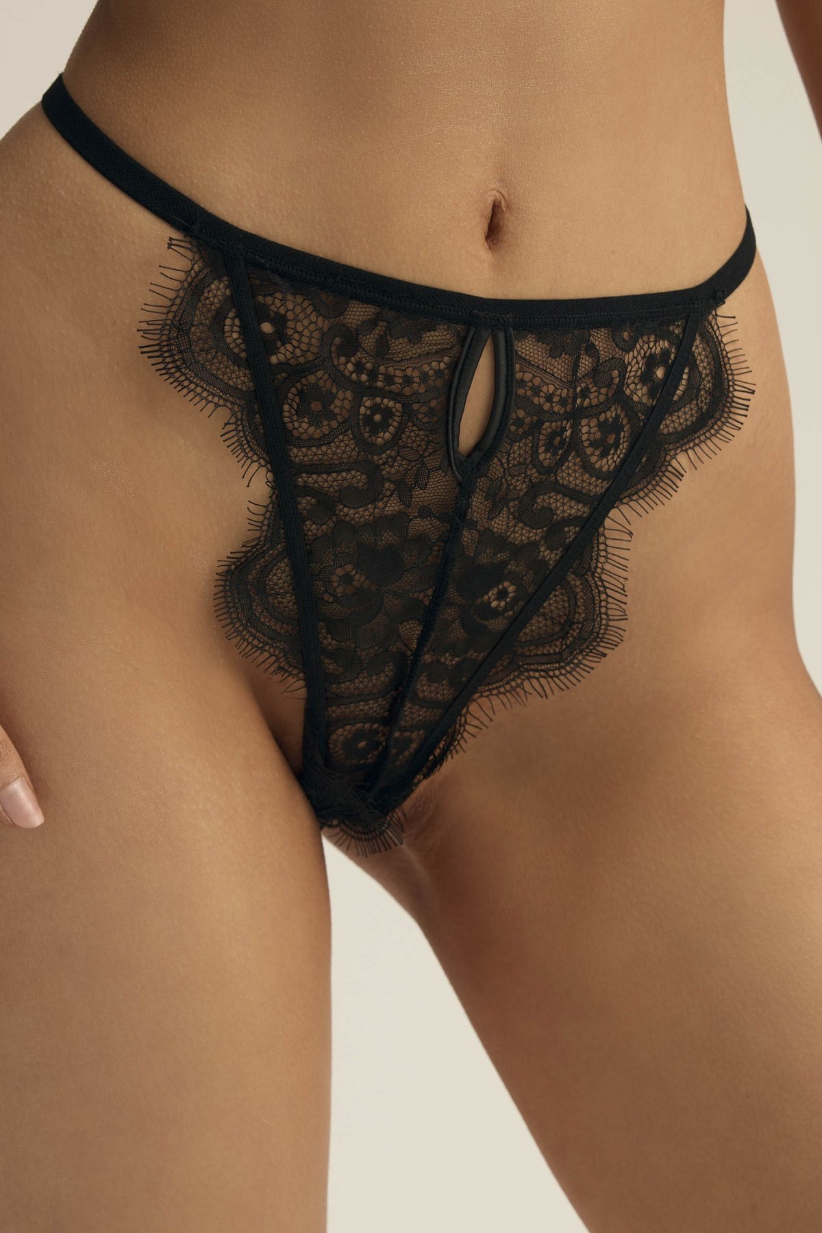 průhledná krajka s bohatým květinovým motivem střih zvýrazňující zadeček perlový řetízek vedený středem zadního dílu …