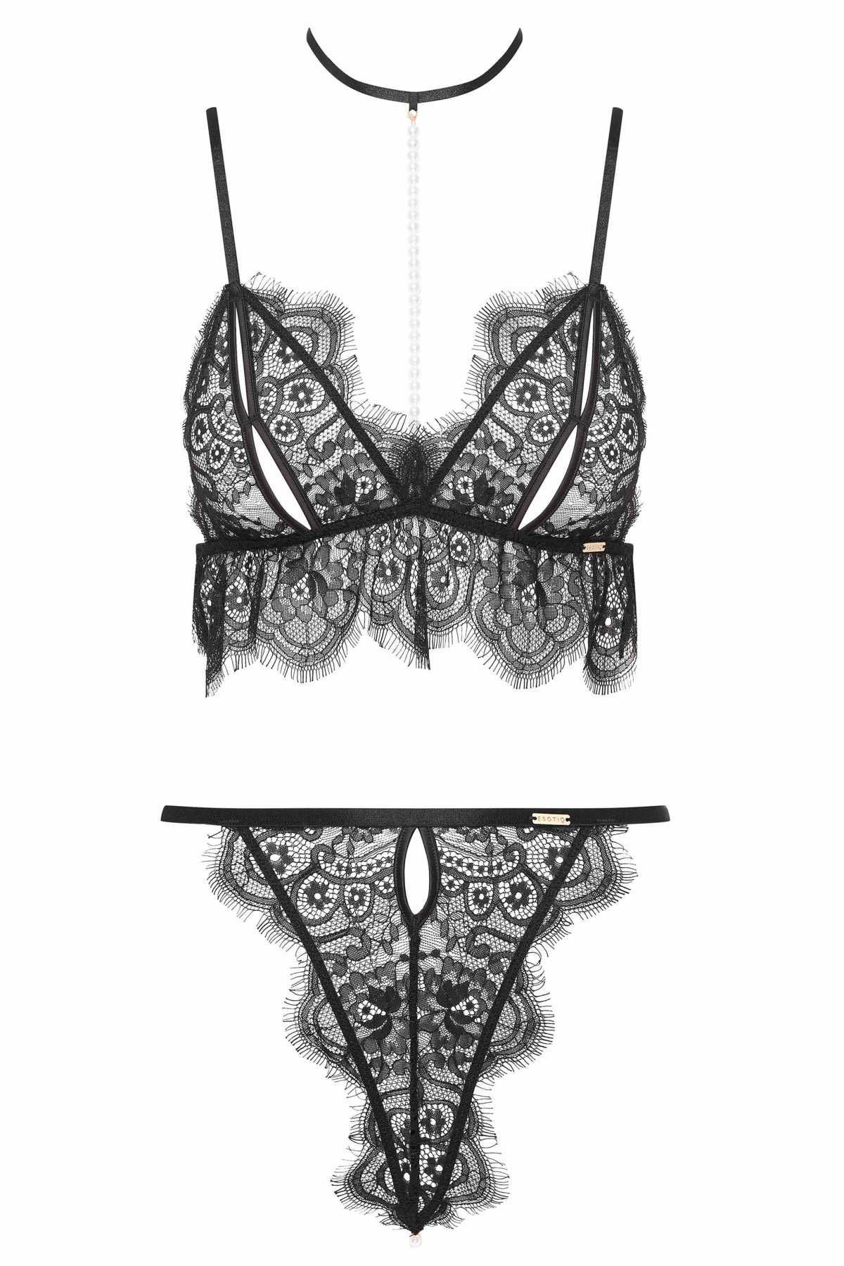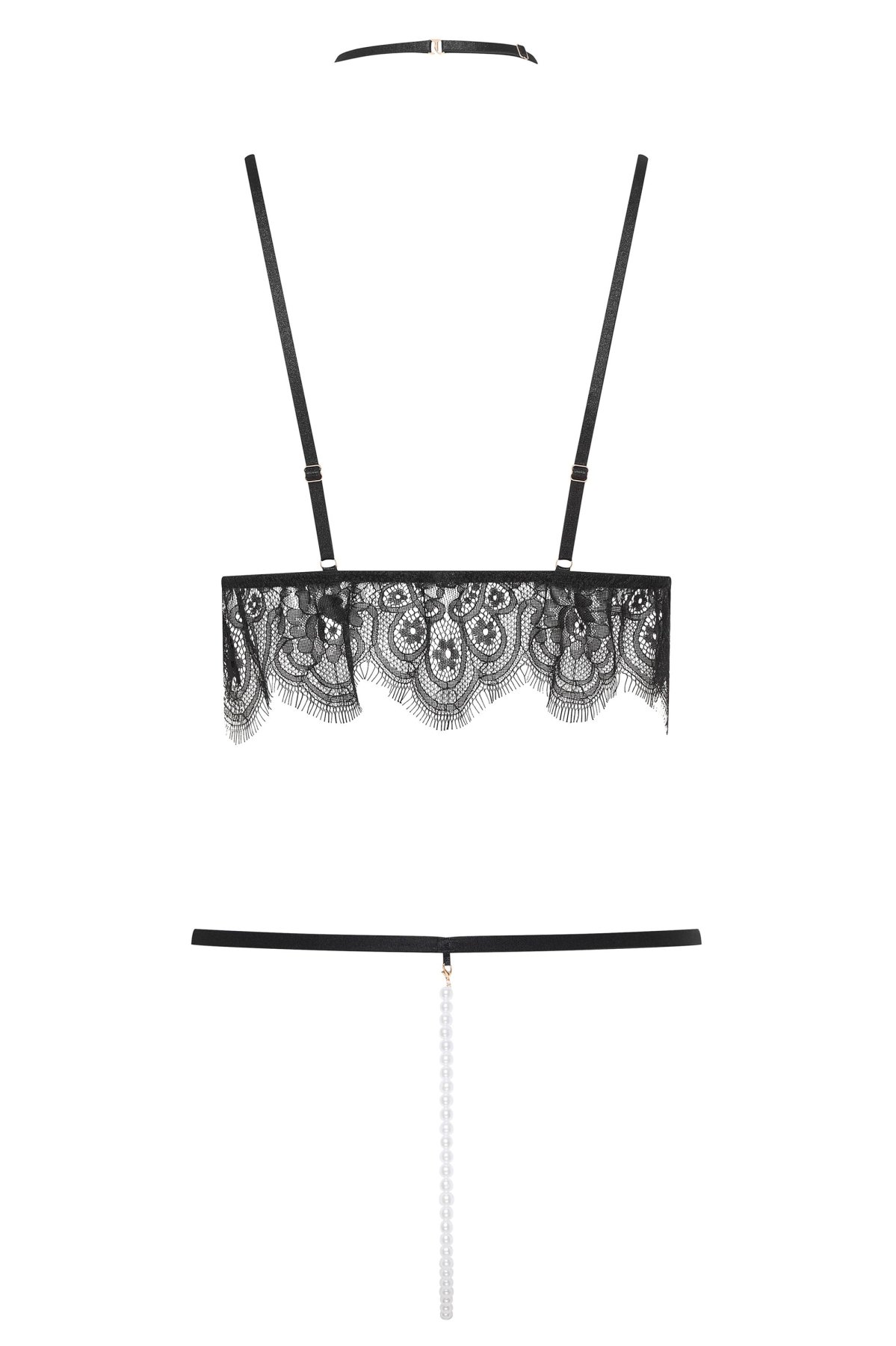 Měkká podprsenka z jemné krajky s odvážnými výřezy krásně zvýrazňuje dekolt, perlová aplikace vedená od chokeru dodává celku luxusní a svůdný nádech. Tanga s lesklými perlami na zadním díle jsou sofistikovaným detailem, který proměňuje klasickou siluetu ve smyslný zážitek. Celý komplet působí lehce a rafinovaně, přesto dokonale zvýrazní ženské křivky. Ideální pro výjimečné chvíle, kdy se chcete cítit sebevědomě, přitažlivě a nezapomenutelně.