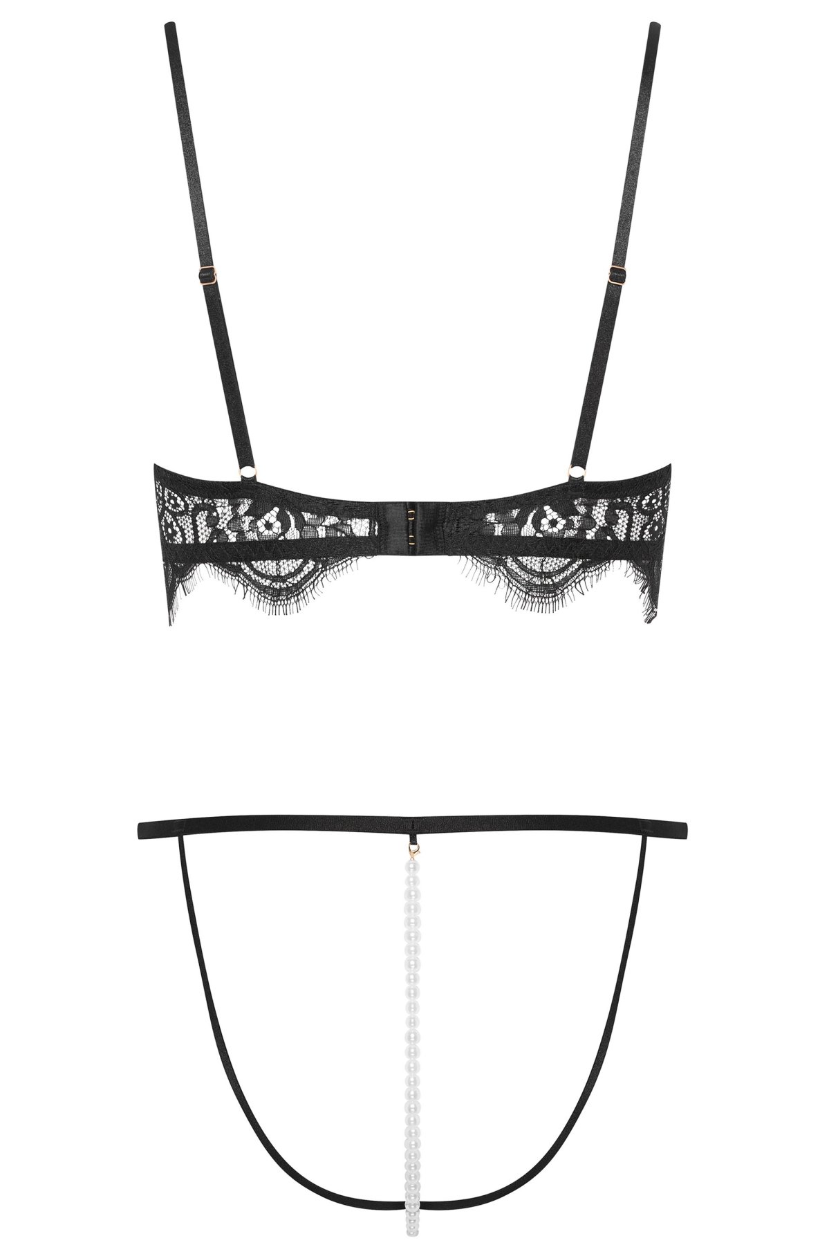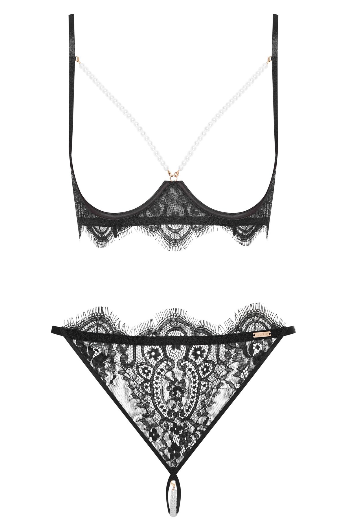 Erotický komplet Posse je stvořen pro ženy, které se nebojí propojit eleganci s odvahou. Podprsenka s otevřenými košíčky smyslně zvýrazňuje poprsí, perlové řetízky procházející přes dekolt dodávají celku sofistikovanou jiskru. Kalhotky doplňuje taktéž perlový prvek, který lze snadno odepnout podle nálady a příležitosti. Jemná krajka se dokonale přizpůsobí tělu, zdůrazní jeho linie a zanechá prostor fantazii.