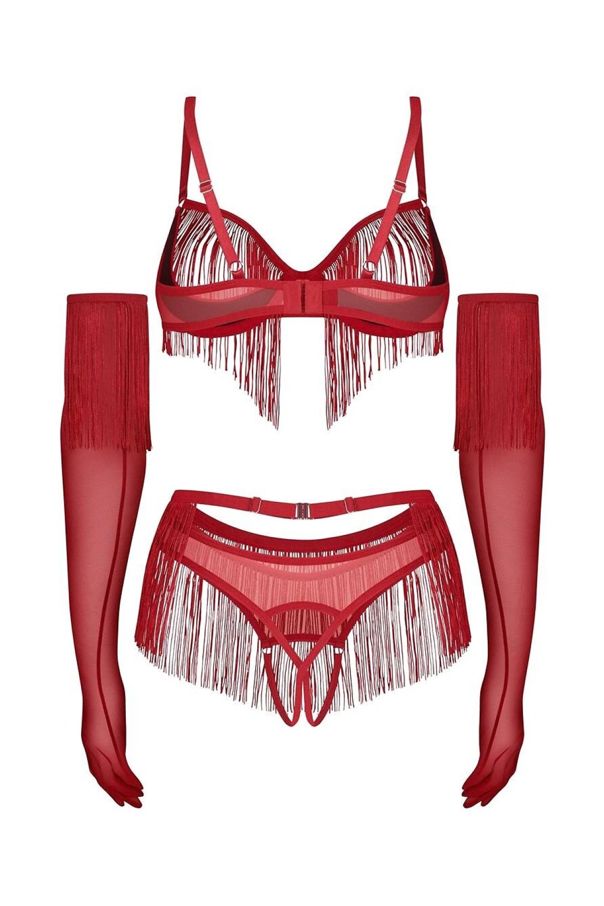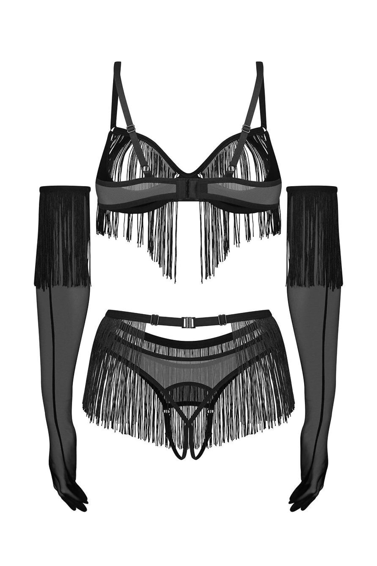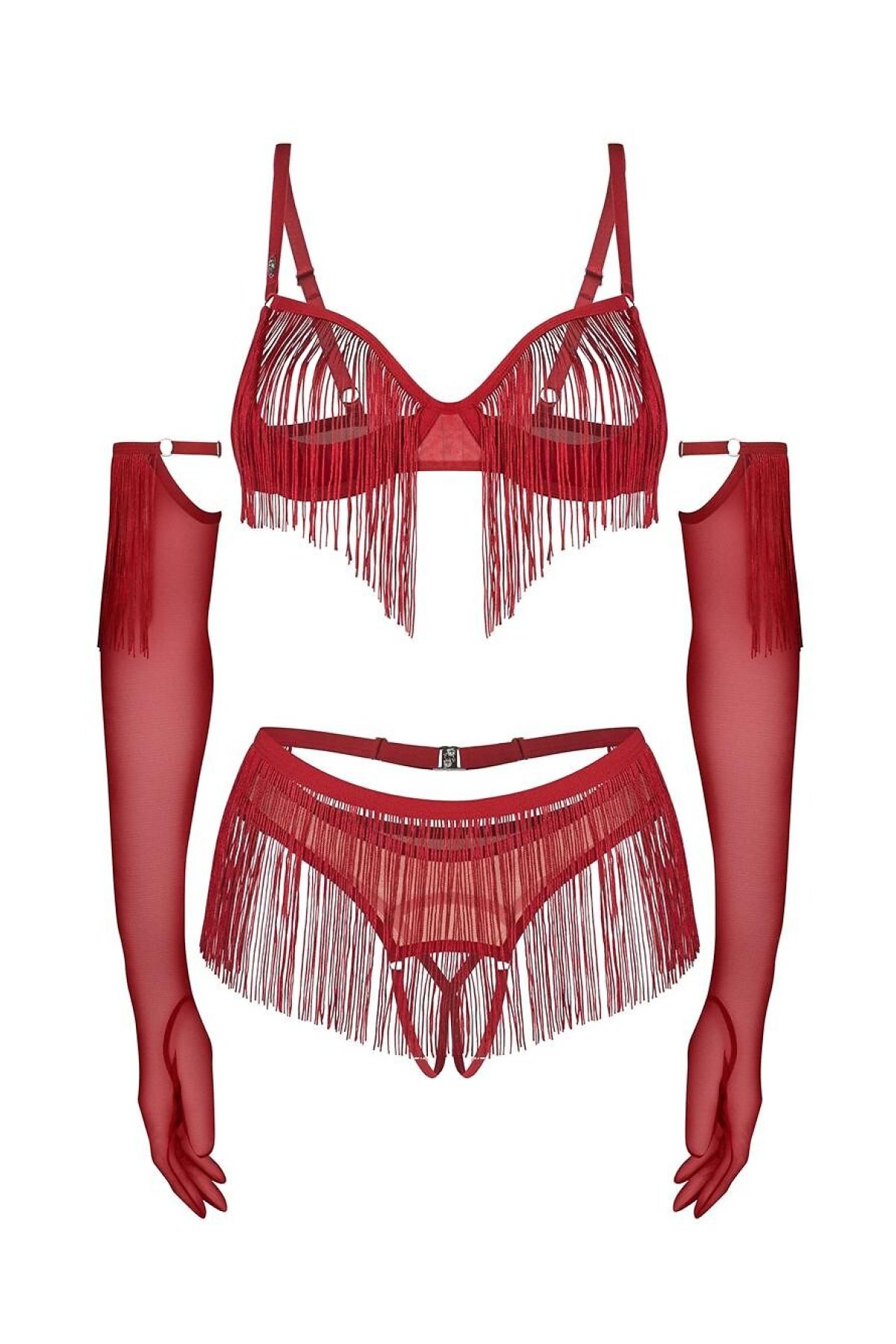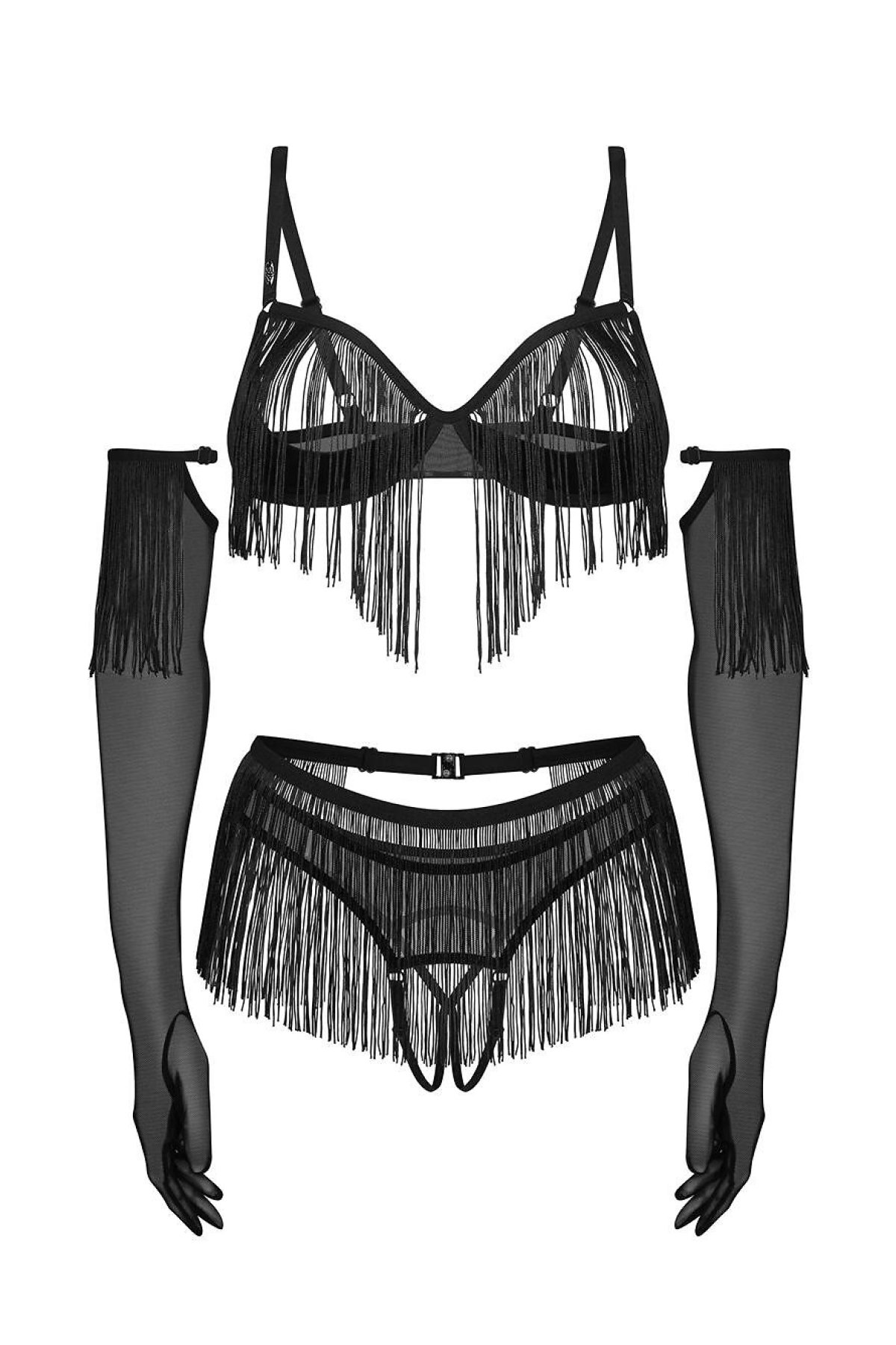 Set Obsessive Rossay tvoří výrazný čtyřdílný komplet, který kombinuje otevřenou podprsenku s kosticemi, tanga, pás a dlouhé rukavice z jemně průsvitného materiálu. Ozdobné třásně dodávají modelu pohyb a nápadný detail, který zvýrazňuje celkový vzhled. Díky nastavitelným prvkům se jednotlivé části lépe přizpůsobí postavě. Provedení působí výrazně a čistě, zatímco kombinace elastických materiálů podporuje pohodlné nošení. Set je vhodný pro ženy, které hledají odvážnější komplet s propracovanými detaily.