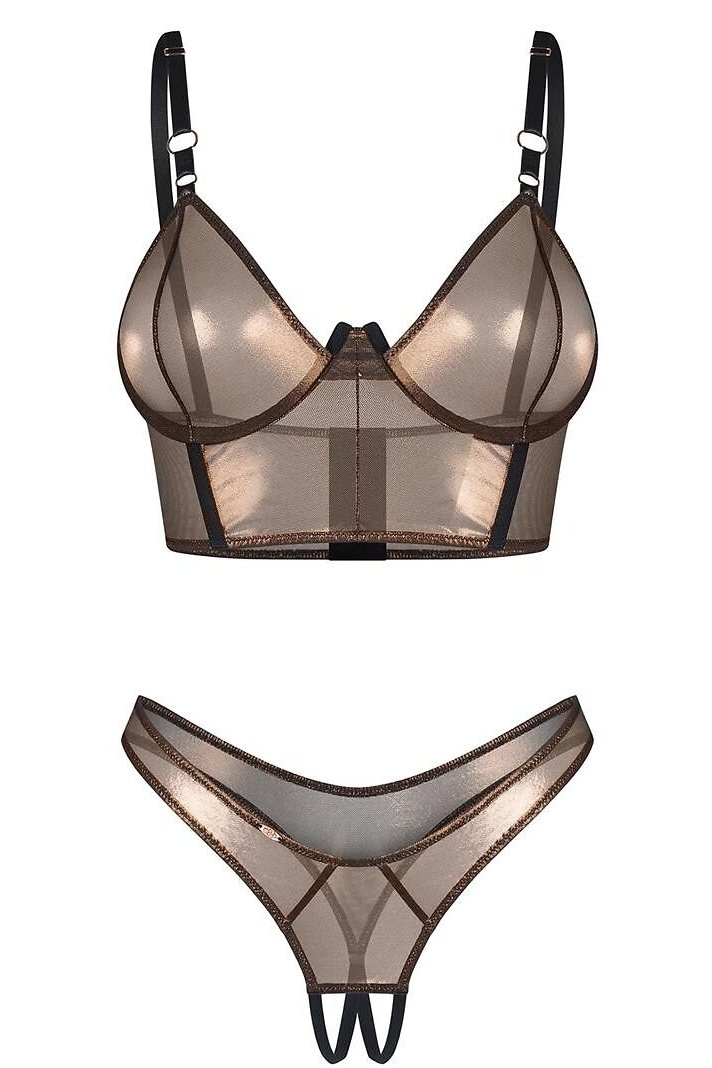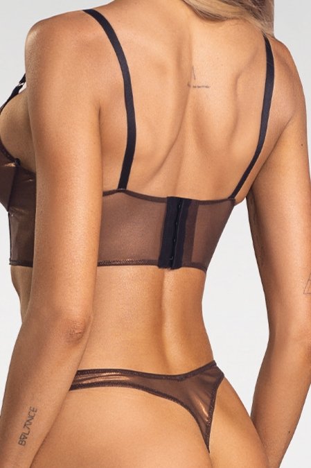 Smyslný komplet Soranna je stvořen pro ženy, které milují luxusní svůdnost a jiskřivý detail. Průsvitná síťovina se zlatým leskem decentně odhaluje tělo a hraje si se světlem, zatímco kostice a svislé výztuhy dokonale modelují postavu. Top se zapínáním na zádech a nastavitelnými ramínky zajistí perfektní padnutí, zatímco tanga s otevřeným klínem dodávají celku neodolatelně dráždivý charakter.