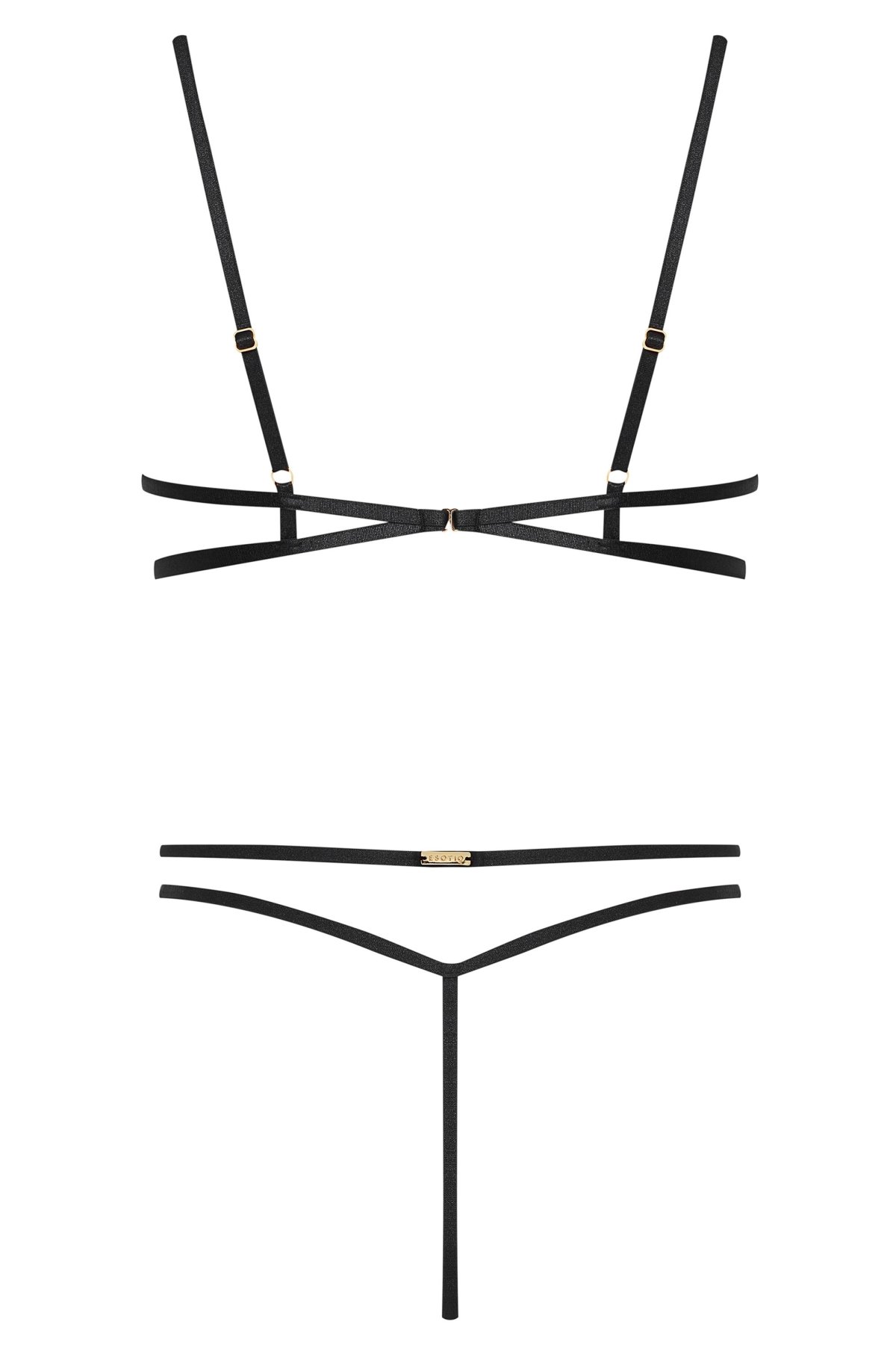 Smyslná podprsenka s kosticemi a jemnou krajkou působí sofistikovaně, zatímco křížící se pásky nad dekoltem vytvářejí svůdný rám pro poprsí. Zapínání řeší drobné háčky na zadní straně. Tanga s vysokým pasem doplňují celý look průsvitnými vsadkami a rafinovanými pásky, které opticky prodlužují linii pasu a zvýrazňují siluetu.