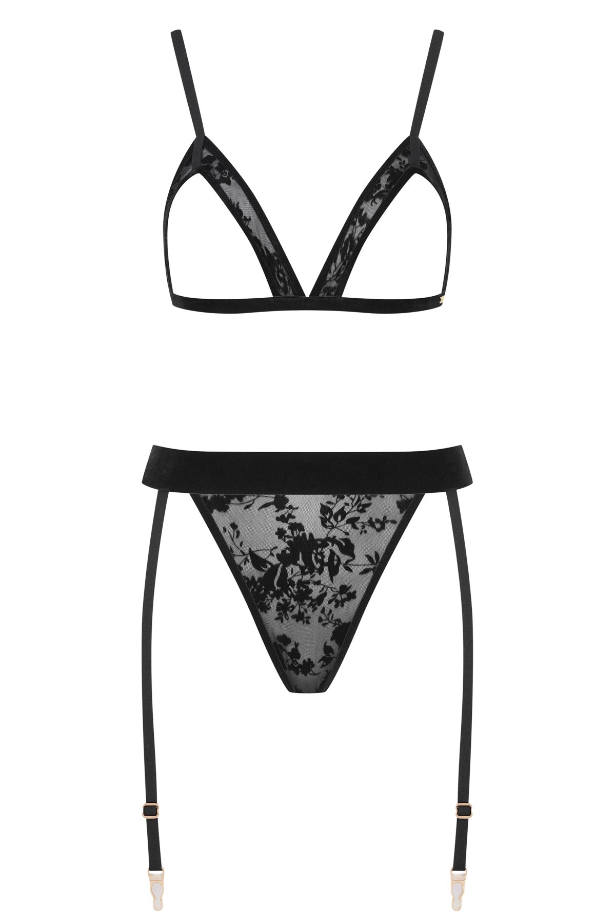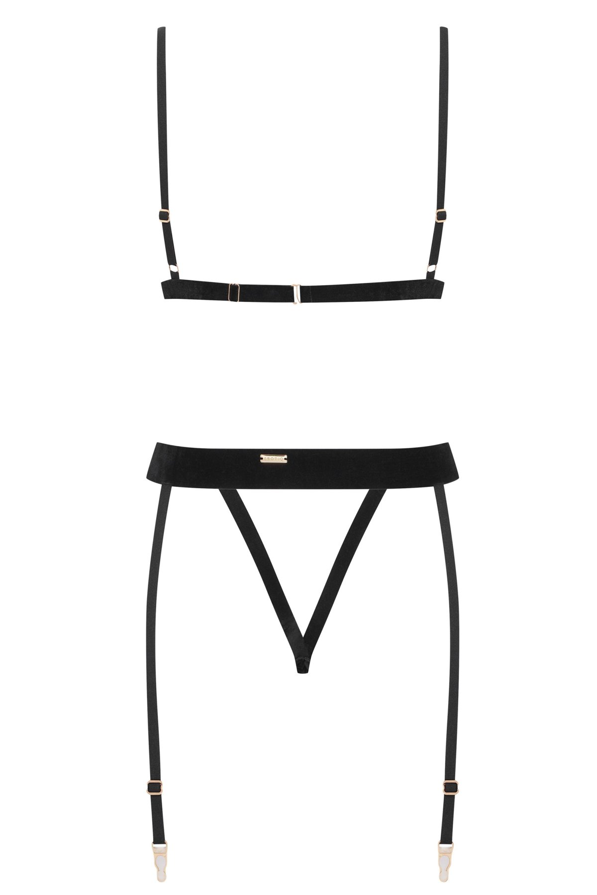 Erotický komplet Zeal ztělesňuje dokonalou rovnováhu mezi elegancí a odvahou. Jemná, průsvitná tkanina s lesklými akcenty se ladně přizpůsobí tělu a zvýrazní jeho křivky. Podprsenka s kosticemi působí subtilně, ale jistě zdůrazňuje dekolt, zatímco páskové detaily kalhotek a podvazkového pasu dodávají celku dráždivý, moderní charakter. Zlaté doplňky vnášejí do vzhledu špetku luxusu. Tento komplet je navržen pro ženy, které chtějí vyzařovat sebedůvěru a zanechat nezapomenutelný dojem.