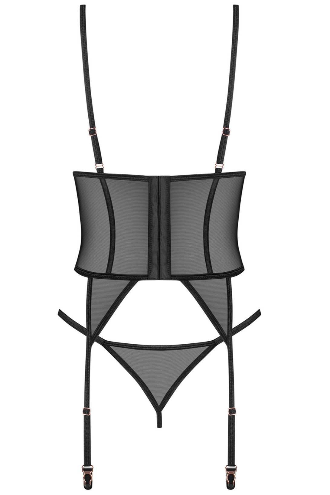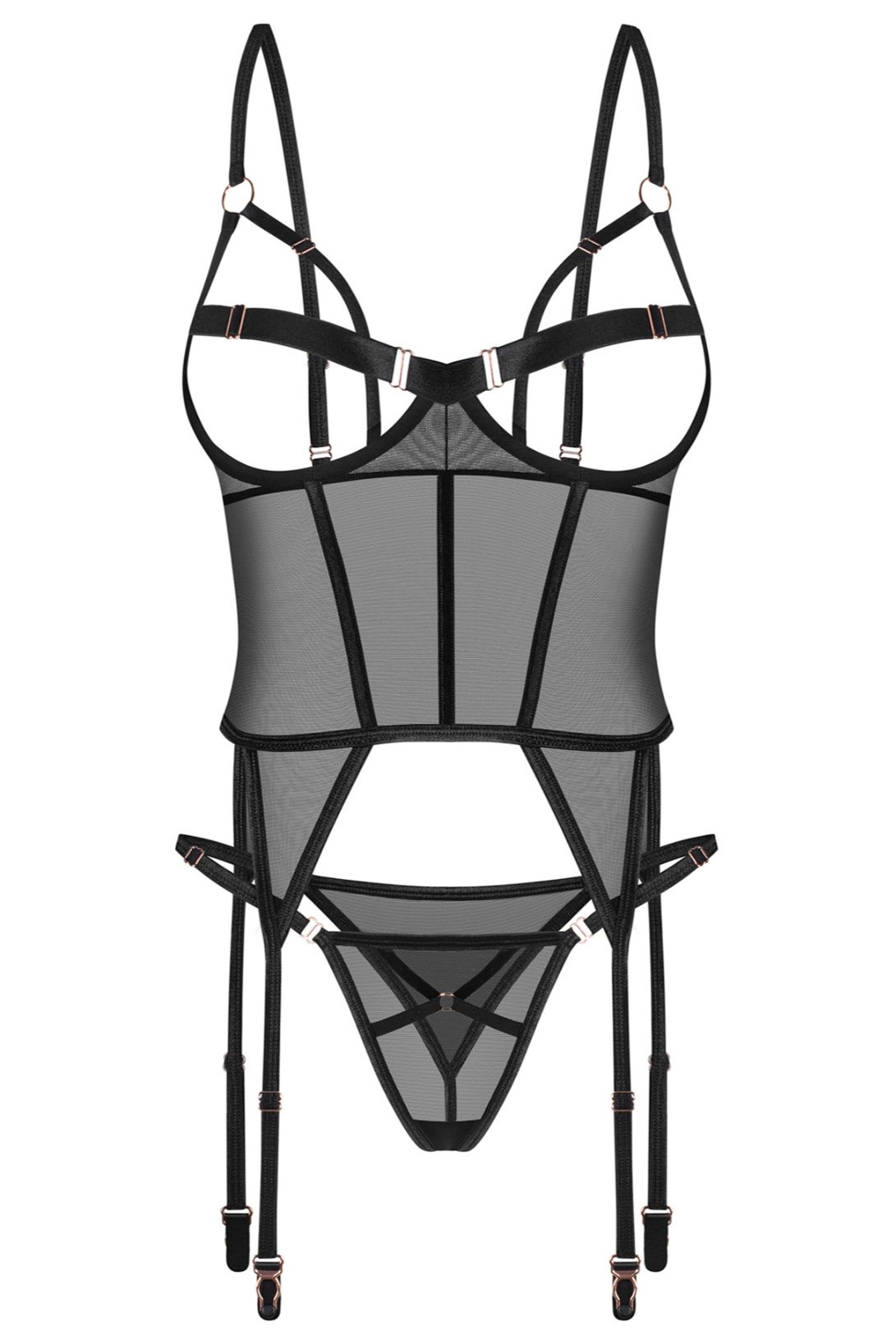 Korzet Euridia ztělesňuje spojení elegance, sebevědomí a neodolatelné přitažlivosti. Průsvitný černý materiál smyslně obepíná postavu a zvýrazňuje ženské linie, zatímco otevřené košíčky svádějí pohled svou odvahou. Nastavitelné ramínka i podvazkové pásky umožňují dokonalé přizpůsobení tělu, díky čemuž se budete cítit pohodlně i výjimečně sexy. Kovové detaily v barvě růžového zlata dodávají celku punc luxusu a vytvářejí harmonický kontrast s jemnou průhlednou síťovinou. Součástí je i ladící tanga, která dotváří celý look. Tento model je ideální pro ženy, které chtějí vyzařovat smyslnost a eleganci v každém detailu.