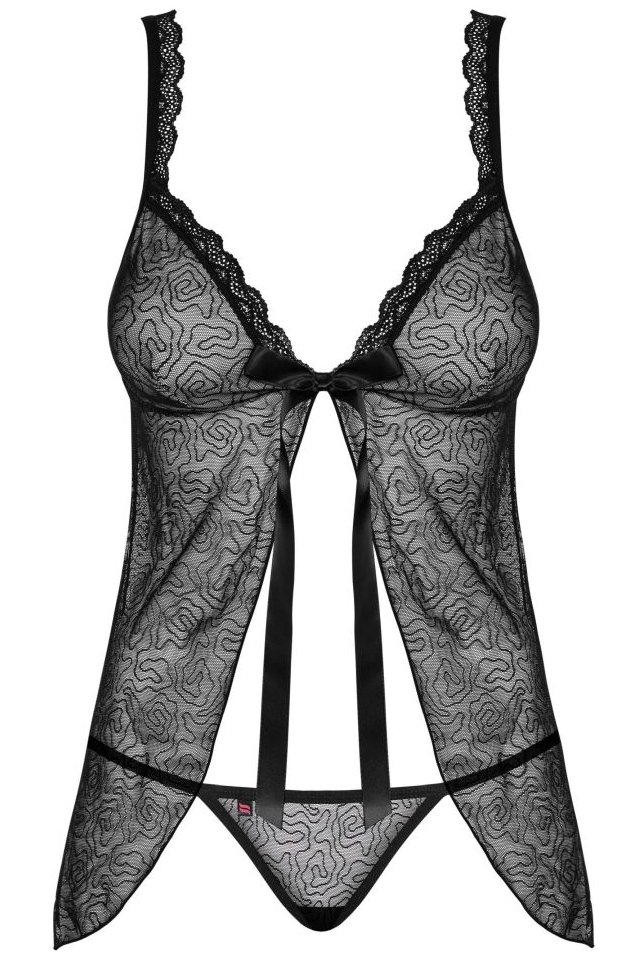 Tato noční košilka je ztělesněním jemné elegance a svůdnosti. Je vyrobena z lehkého, elastického materiálu, který se přizpůsobí tělu a smyslně zvýrazní ženské křivky. Košíčky jsou lemovány decentní krajkou a spojuje je ozdobná mašle, která přitahuje pozornost k dekoltu. Díky rozparku vpředu působí model mimořádně přitažlivě a zároveň lehce. Součástí kompletu jsou také tanga ve stejném designu, která perfektně doplňují celý look. Elastický materiál je hebký na dotek a poskytuje pohodlí při nošení. Ideální volba pro večery, kdy chcete být neodolatelná.