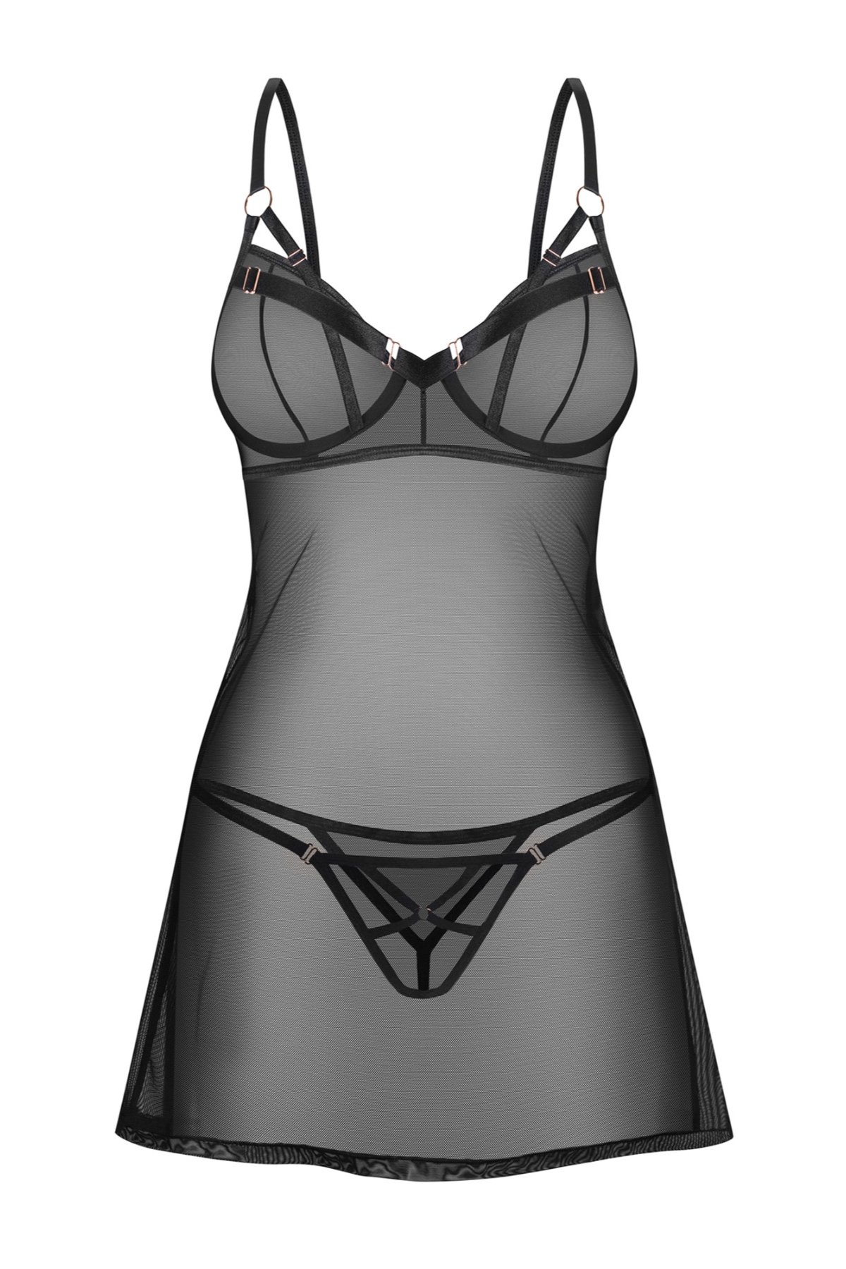 Košilka je vyrobena z jemné, pružné tkaniny, která se příjemně přizpůsobí tělu a zdůrazní jeho křivky. Nastavitelná ramínka a více polohové zapínání umožňují individuální nastavení pro maximální pohodlí. V sadě nechybí ani svůdná tanga, která doplňují celý model a dotvářejí jeho smyslný charakter.