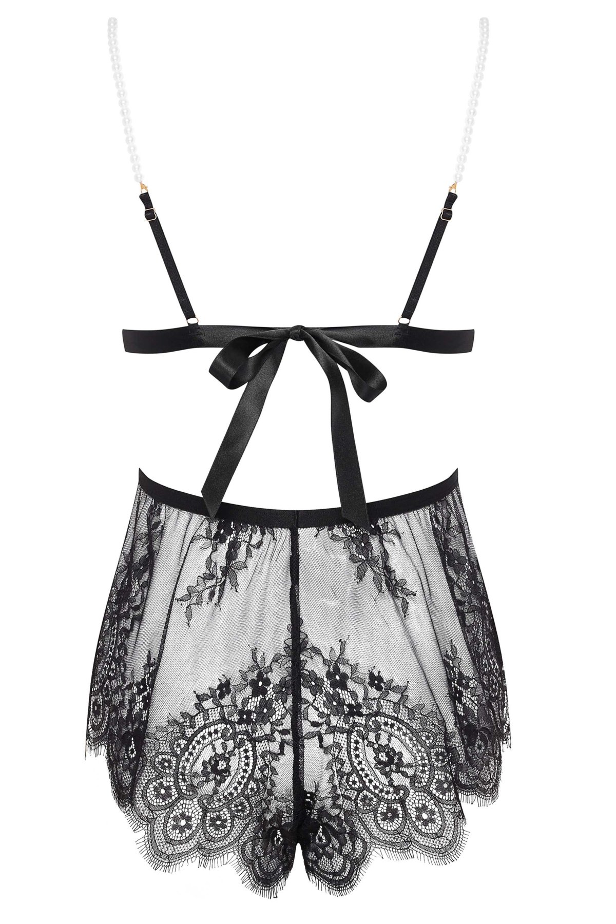 průhledná krajka s bohatým květinovým motivem střih zvýrazňující zadeček perlový řetízek vedený středem zadního dílu …