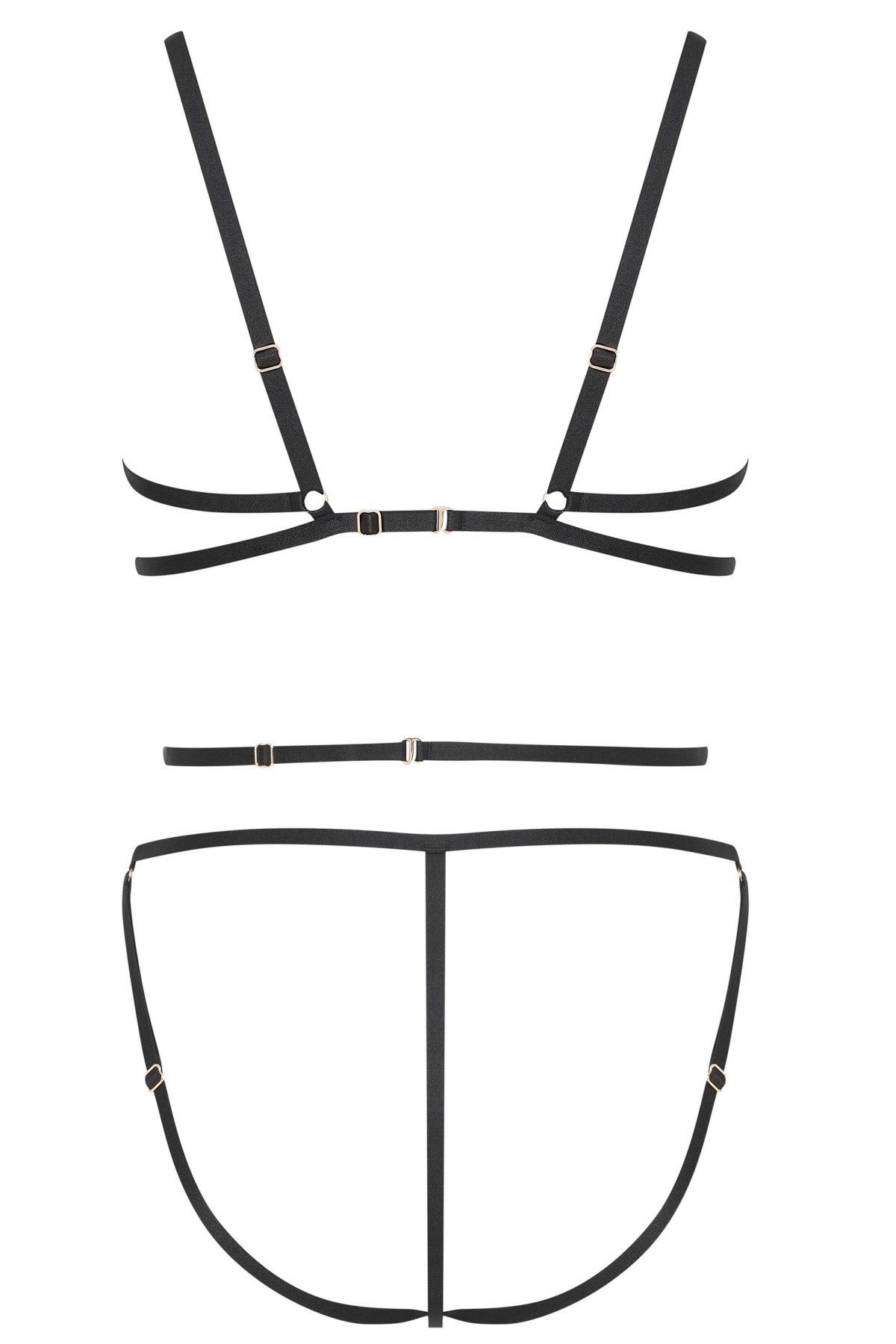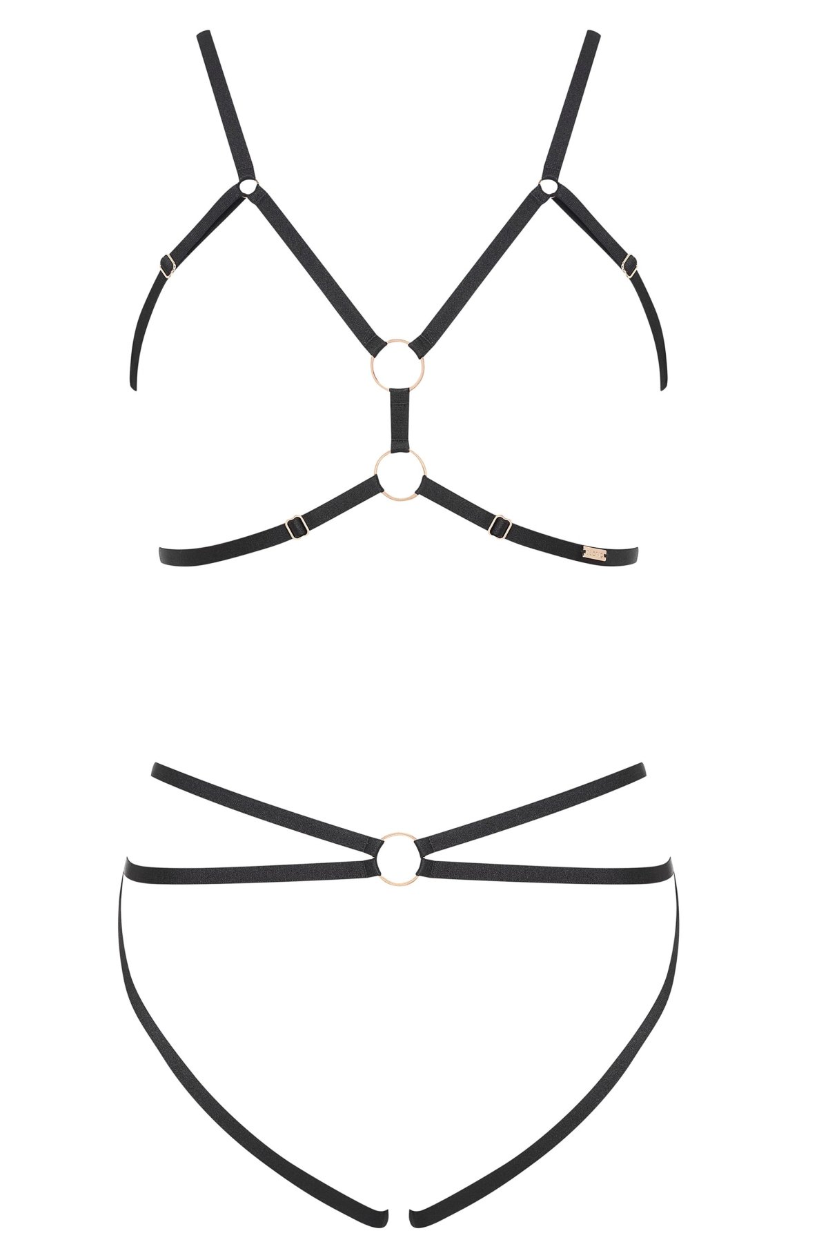 Postroj Honour je určen ženám, které se nebojí vyjádřit svou sílu a svůdnost. Tenké pásky se vinou kolem těla jako jemná síť, zdůrazňují pas, prsa i boky a nechávají vyniknout přirozené křivky. Zlaté kovové detaily dodávají kontrastní, luxusní lesk, zatímco geometrické vedení vzadu smyslně odhaluje záda i zadeček. Díky možnosti regulace se dokonale přizpůsobí postavě a přilne k ní jako druhá kůže. Honour je doplněk, který promění každý pohyb v hru napětí, elegance a erotické jistoty.