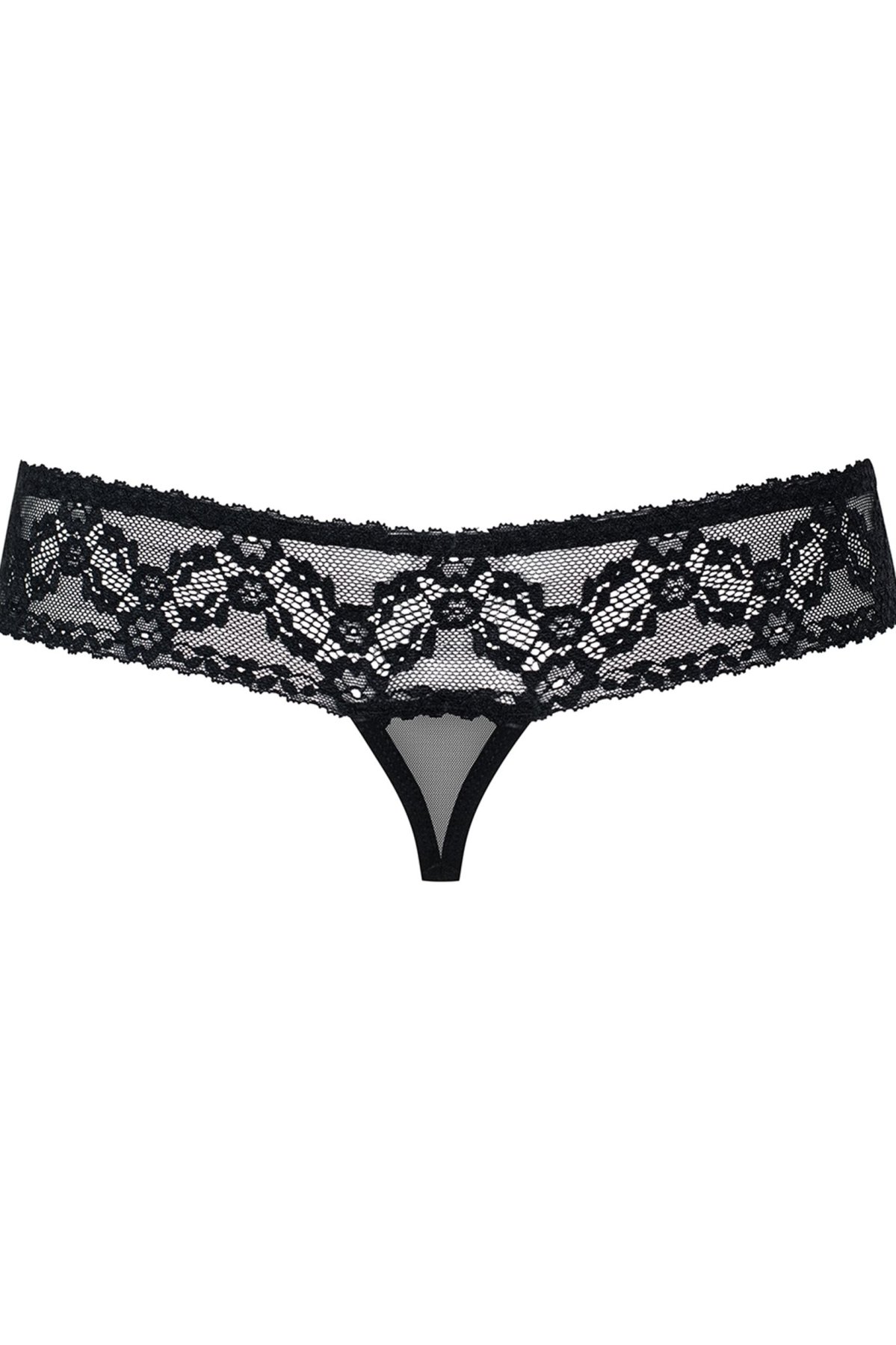 Tahle tanga jsou malý kousek prádla s velkým efektem. Květinová krajka v kombinaci s průsvitnou síťovinou působí něžně, ale střih odhalující zadeček a otevřený rozkrok posune celý dojem do pořádně pikantní roviny. Jemné řasení a mašlička dodají hravost, zatímco lesklý šperk přitáhne pohled přesně tam, kam má. Díky elastickému, na dotek příjemnému materiálu se tanga dobře přizpůsobí tělu, drží na místě a nepůsobí tvrdě ani „kostýmově“. Ideální, když chcete minimalistický střih, ale maximálně svůdný detail.