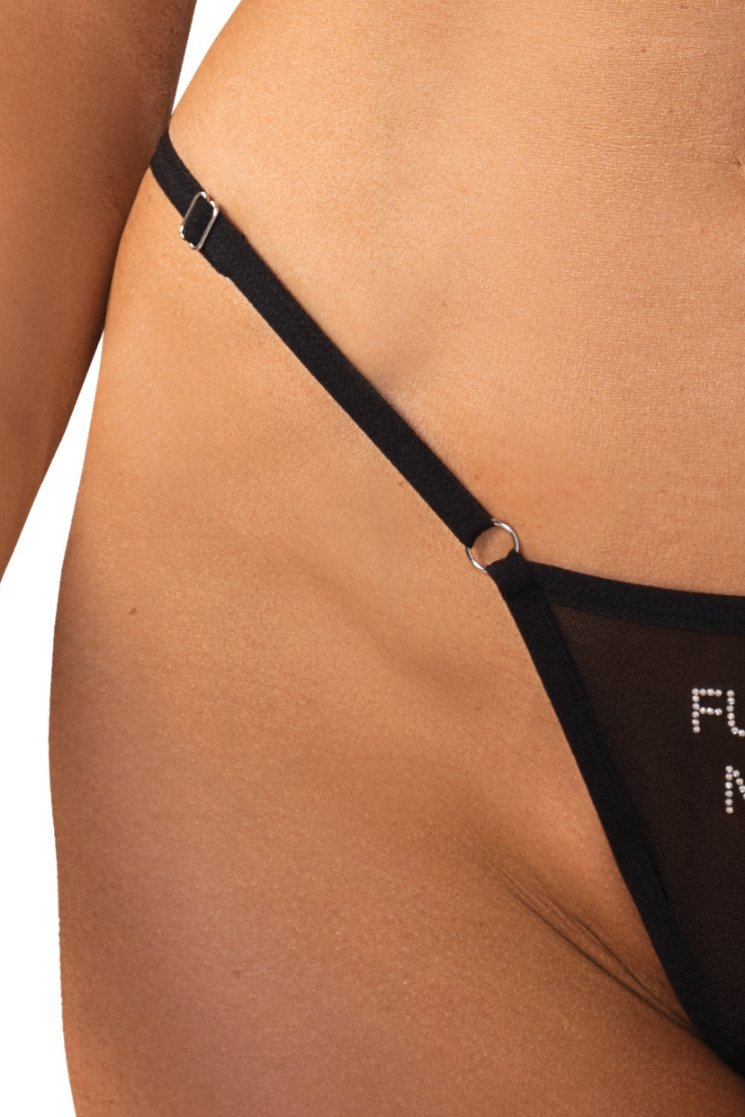 Tanga z transparentní černé síťoviny s třpytivým nápisem z kamínků a nastavitelnými pásky. Lehký, pružný materiál se přizpůsobí postavě, zvýrazní boky a zajistí pohodlí. Výrazný detail na přední straně dodává modelu odvážný charakter a dělá z něj efektní kousek pro speciální příležitosti.