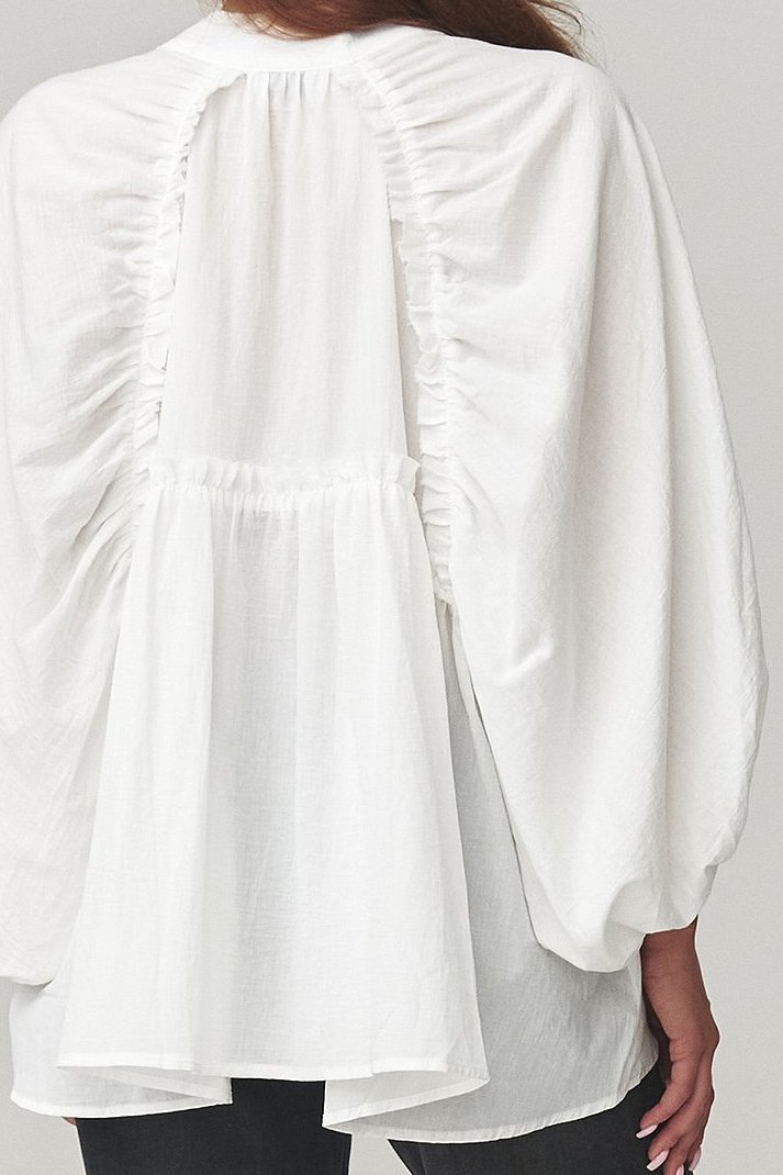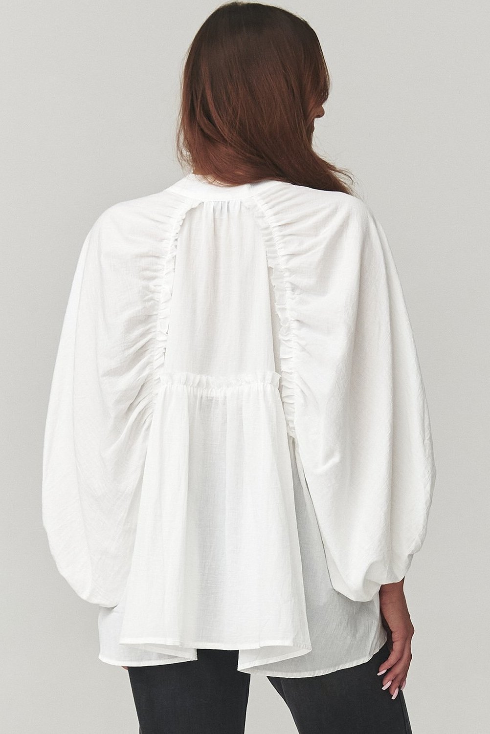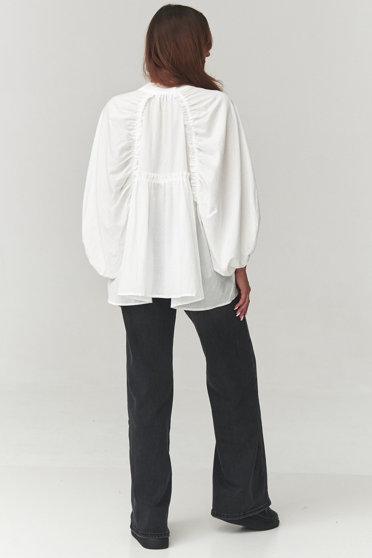 Štýlová a univerzálna dámska oversize blúzka v bielej farbe. Dokonalý základ každého šatníka. Voľný strih zaručí maximum pohodlia a súčasne pôsobí elegantne a žensky. Vďaka klasickému golieru a minimalistickému dizajnu sa hodí ako do kancelárie, tak aj pre ležérne outfity. Dominantou sú výrazne široké rukávy, ktoré dodajú celkovému outfitu šmrnc.