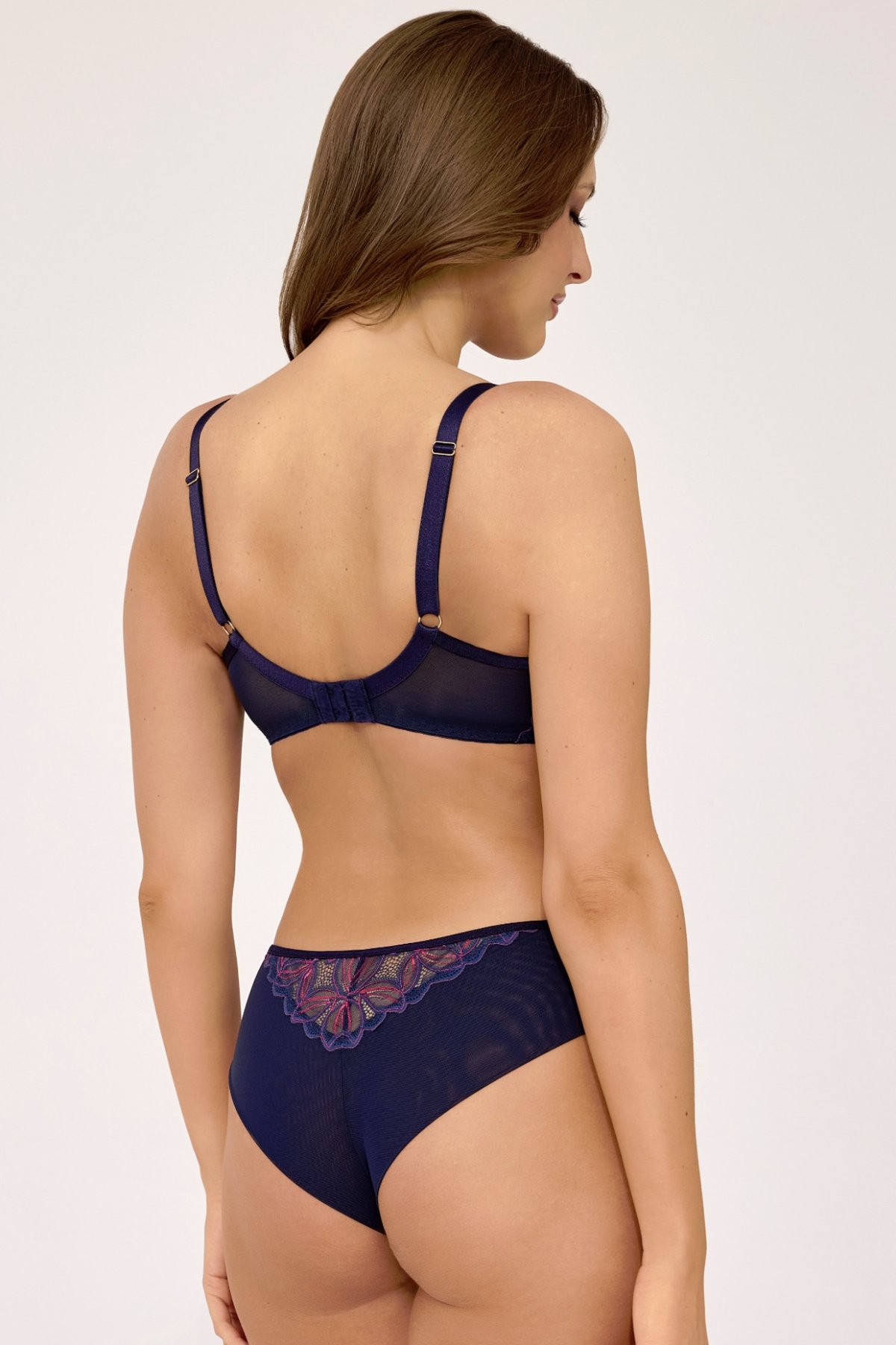 Elegantní brazilky v tmavě modrém odstínu. Kombinují svůdný vzhled s pohodlným nošením. Krajkové detaily v kombinaci s průhlednou síťovinou vytvářejí atraktivní a lehký efekt, který podtrhuje ženské tvary. Zadní část z dvojitého tylu jemně obepíná postavu a zůstává neviditelná pod oblečením, což dělá z tohoto modelu ideální volbu i pro přiléhavé outfity. Plochý pas s decentní ozdobou dodává kalhotkám elegantní charakter. Díky propracovanému střihu a preciznímu zpracování jsou brazilky Navy Blue perfektním doplňkem pro každodenní nošení i speciální příležitosti.