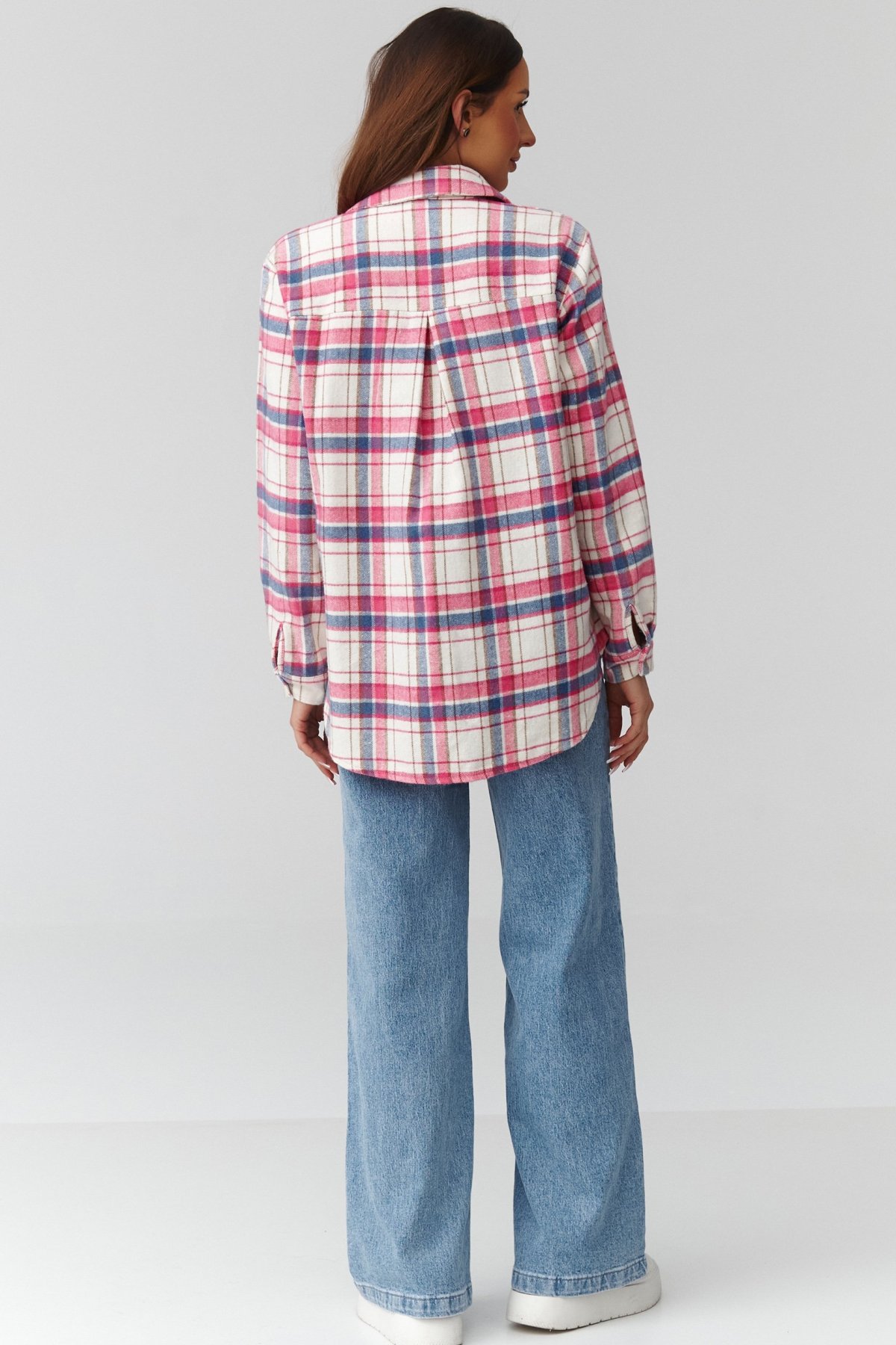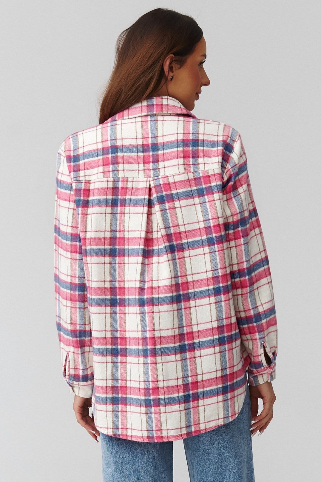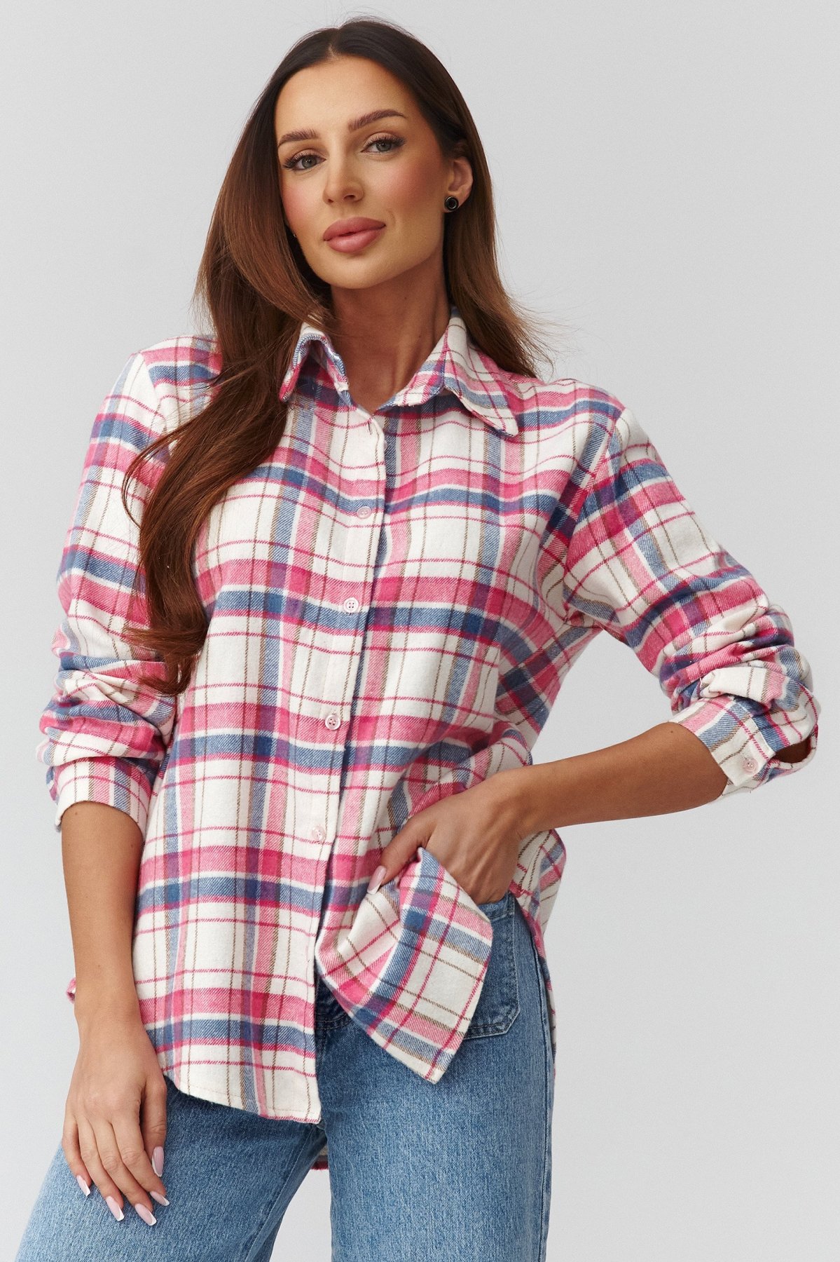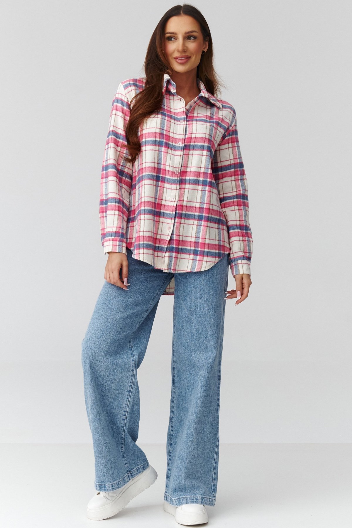 Dámská košile v modrých, bílých a růžových tónech. Je moderní interpretací klasického kostkovaného stylu. Díky uvolněnému střihu a prodlouženému zadnímu dílu působí ležérně, ale zároveň elegantně. Jemná, měkká tkanina příjemně obepíná tělo a poskytuje komfort po celý den. Košile se skvěle hodí k džínům, legínám nebo jako lehká vrchní vrstva přes tričko. Je ideálním základem pro neformální i městské outfity — můžete ji nosit rozepnutou, zapnutou nebo přepásanou páskem v pase. Tento univerzální model spojuje pohodlí, ženský šarm a nadčasový design, díky čemuž se stane oblíbeným kouskem pro celoroční nošení.
