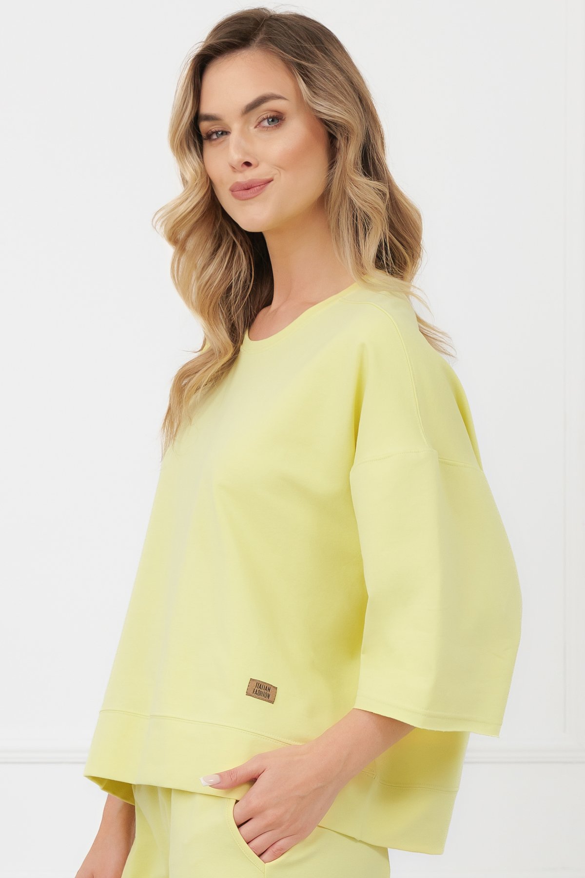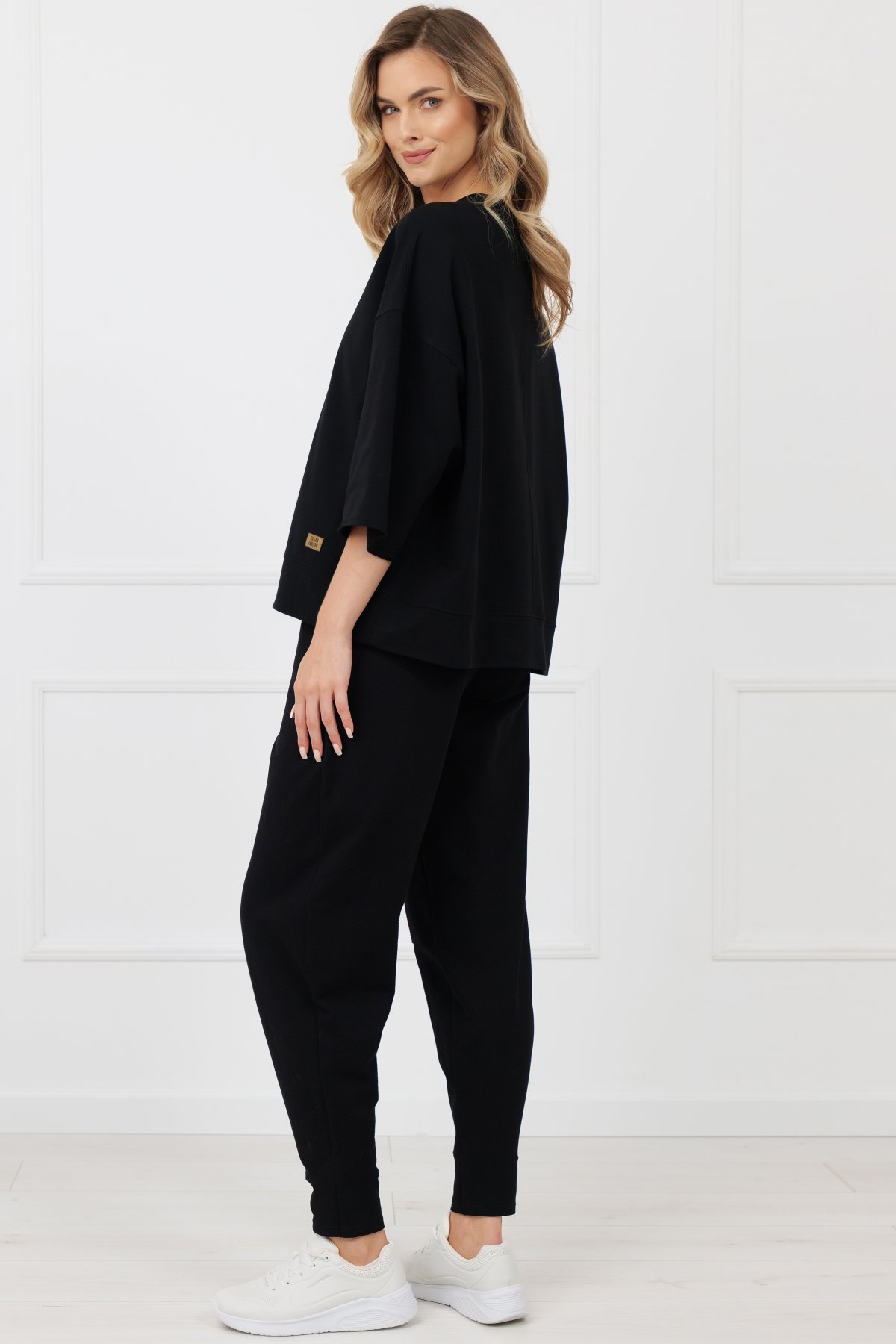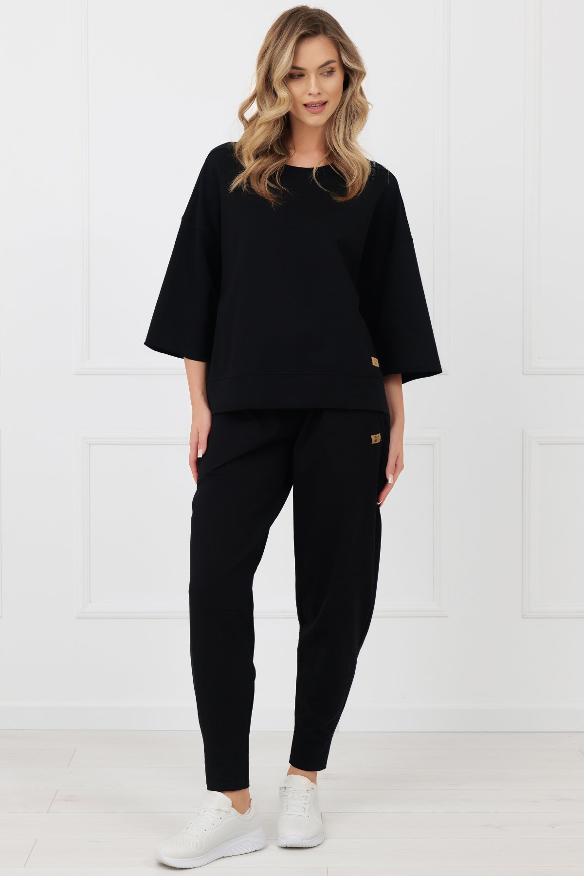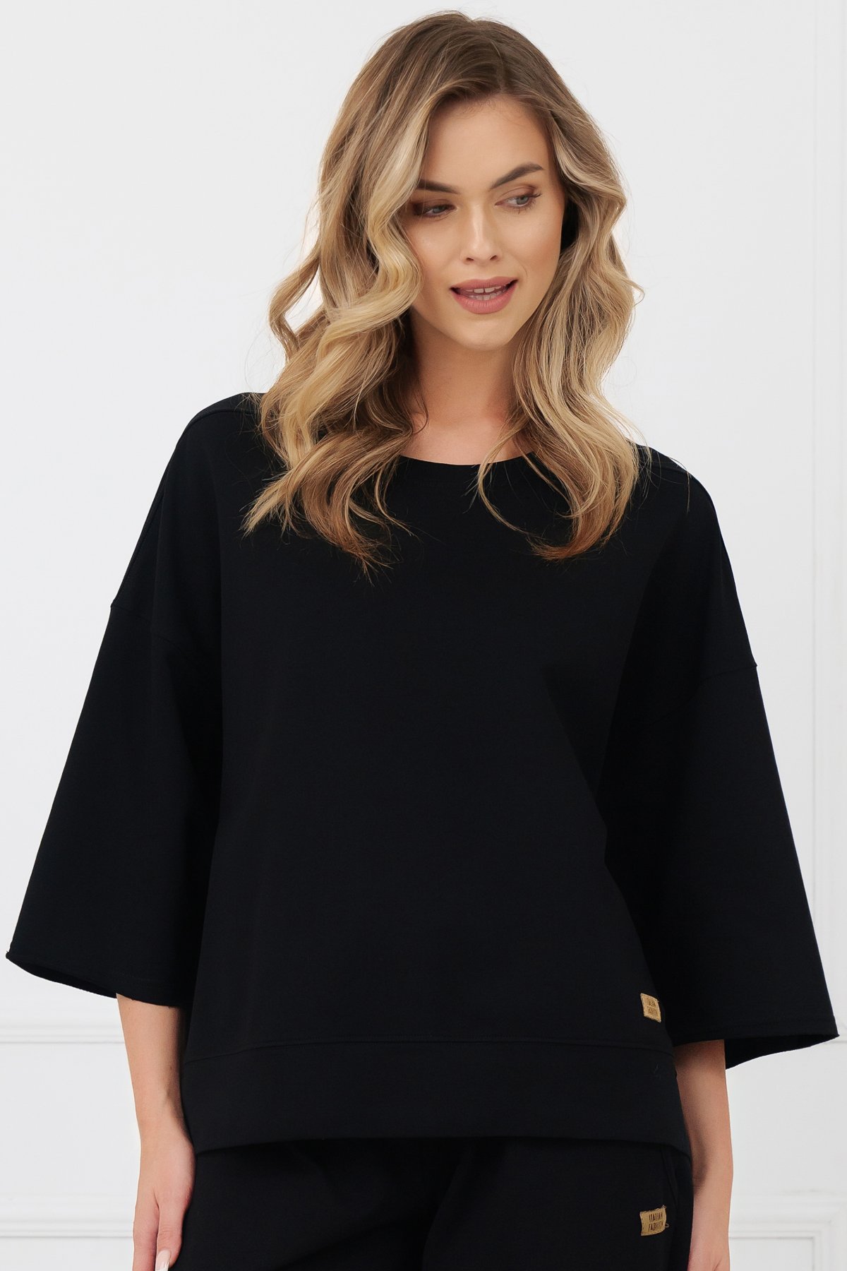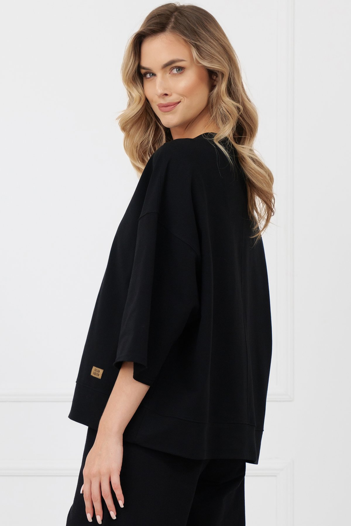 Bavlněný úplet s příměsí elastanu je měkký, pružný a příjemný na těle. Díky vyšší gramáži působí materiál pevněji, dobře drží tvar a zároveň zůstává komfortní po celý den. Volnější střih neomezuje v pohybu a snadno se kombinuje s dalšími kousky. Zajímavým detailem je konstrukce, kdy zadní díl plynule přechází do přední části a vytváří výrazný ozdobný prvek. 3/4 rukávy dodávají modelu lehkost a dělají z něj praktickou volbu na přechodné období.