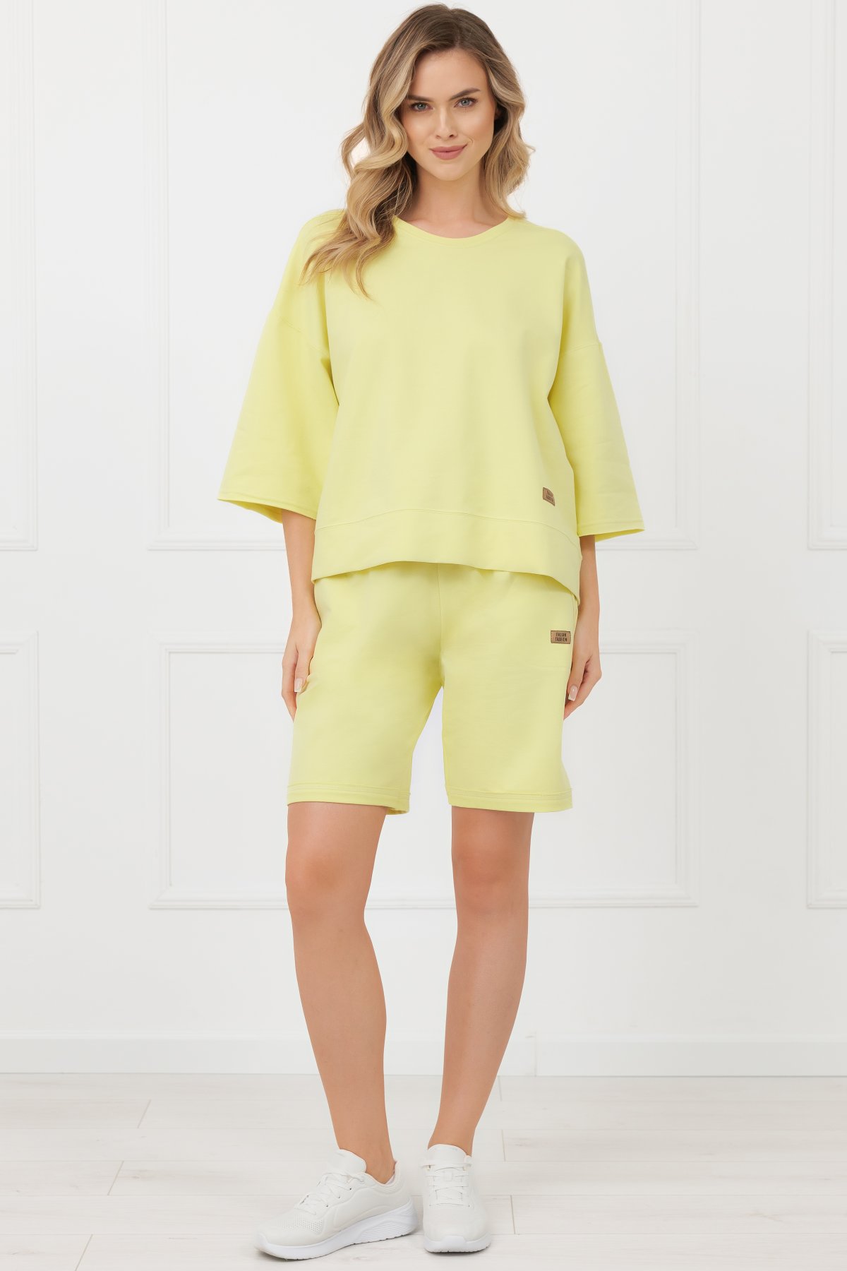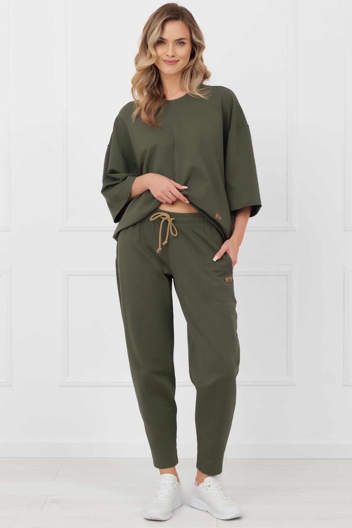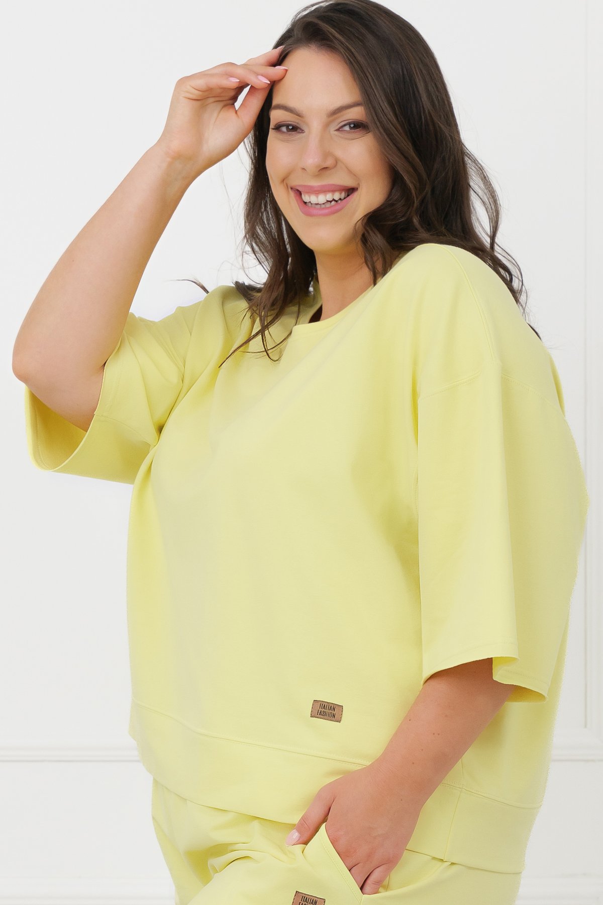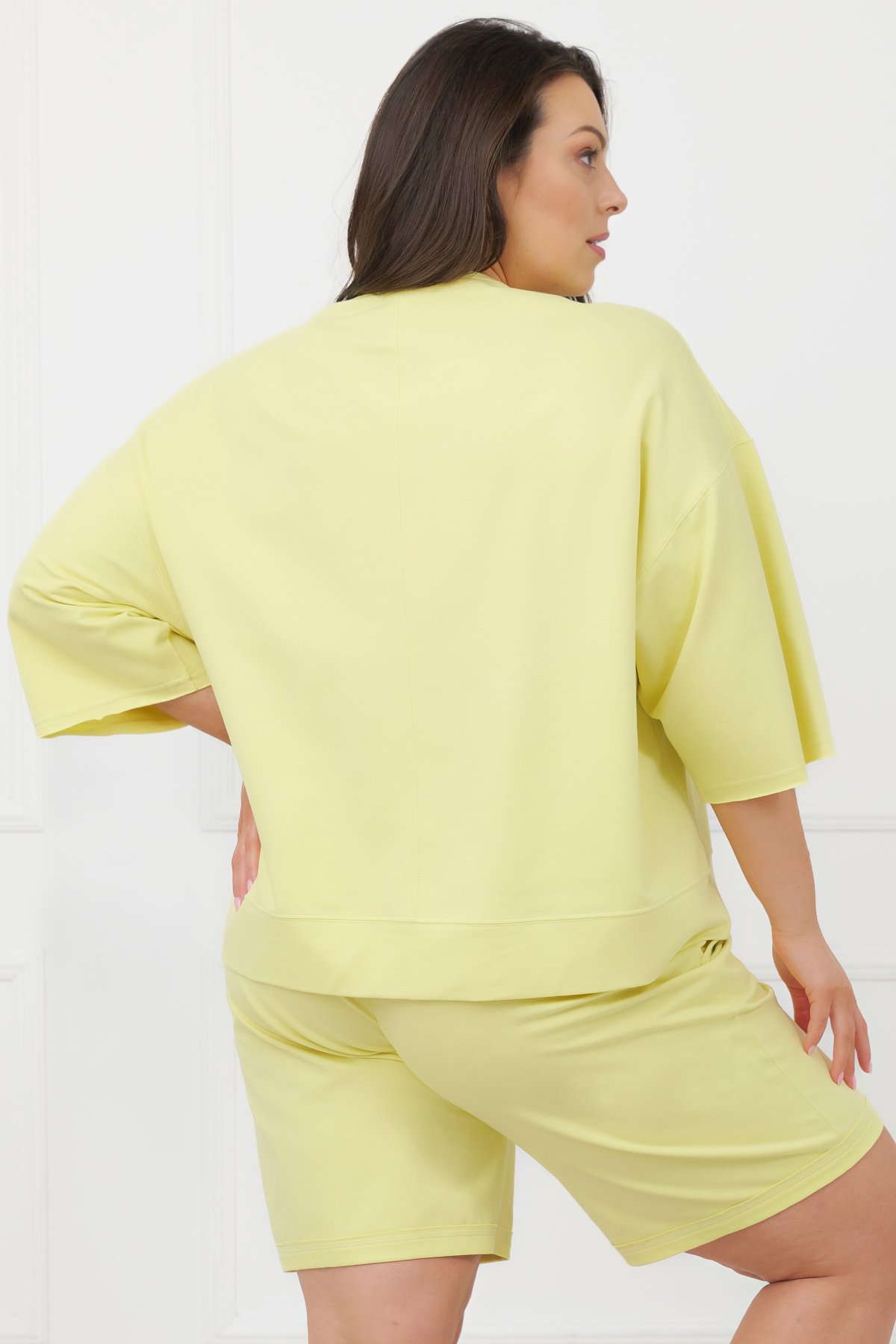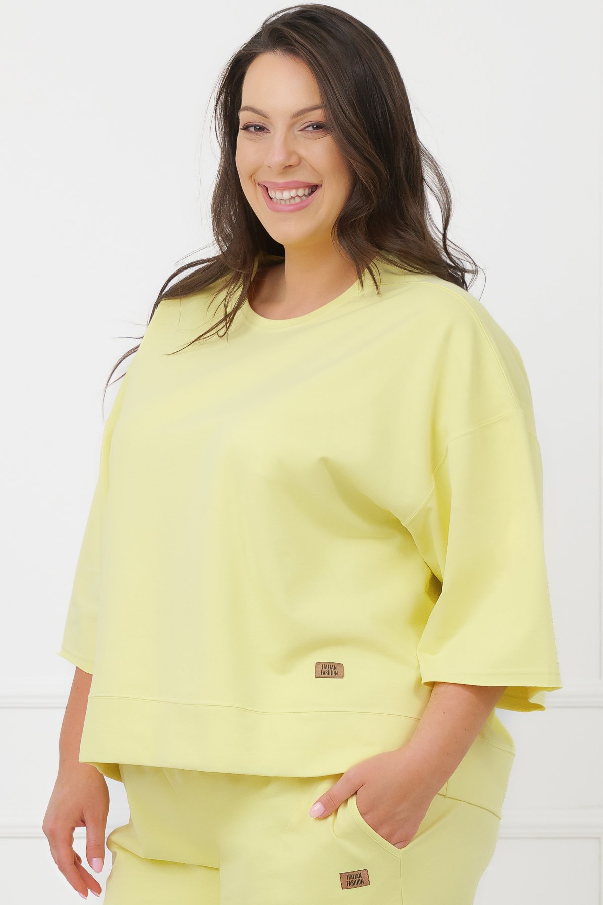Bavlněný úplet s příměsí elastanu je měkký, pružný a příjemný na těle. Díky vyšší gramáži působí materiál pevněji, dobře drží tvar a zároveň zůstává komfortní po celý den. Volnější střih neomezuje v pohybu a snadno se kombinuje s dalšími kousky. Zajímavým detailem je konstrukce, kdy zadní díl plynule přechází do přední části a vytváří výrazný ozdobný prvek. 3/4 rukávy dodávají modelu lehkost a dělají z něj praktickou volbu na přechodné období.