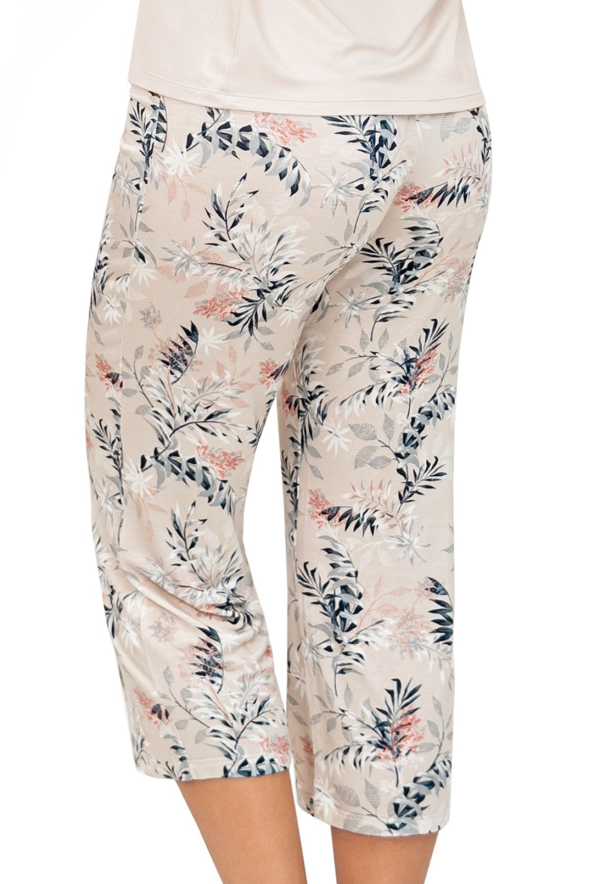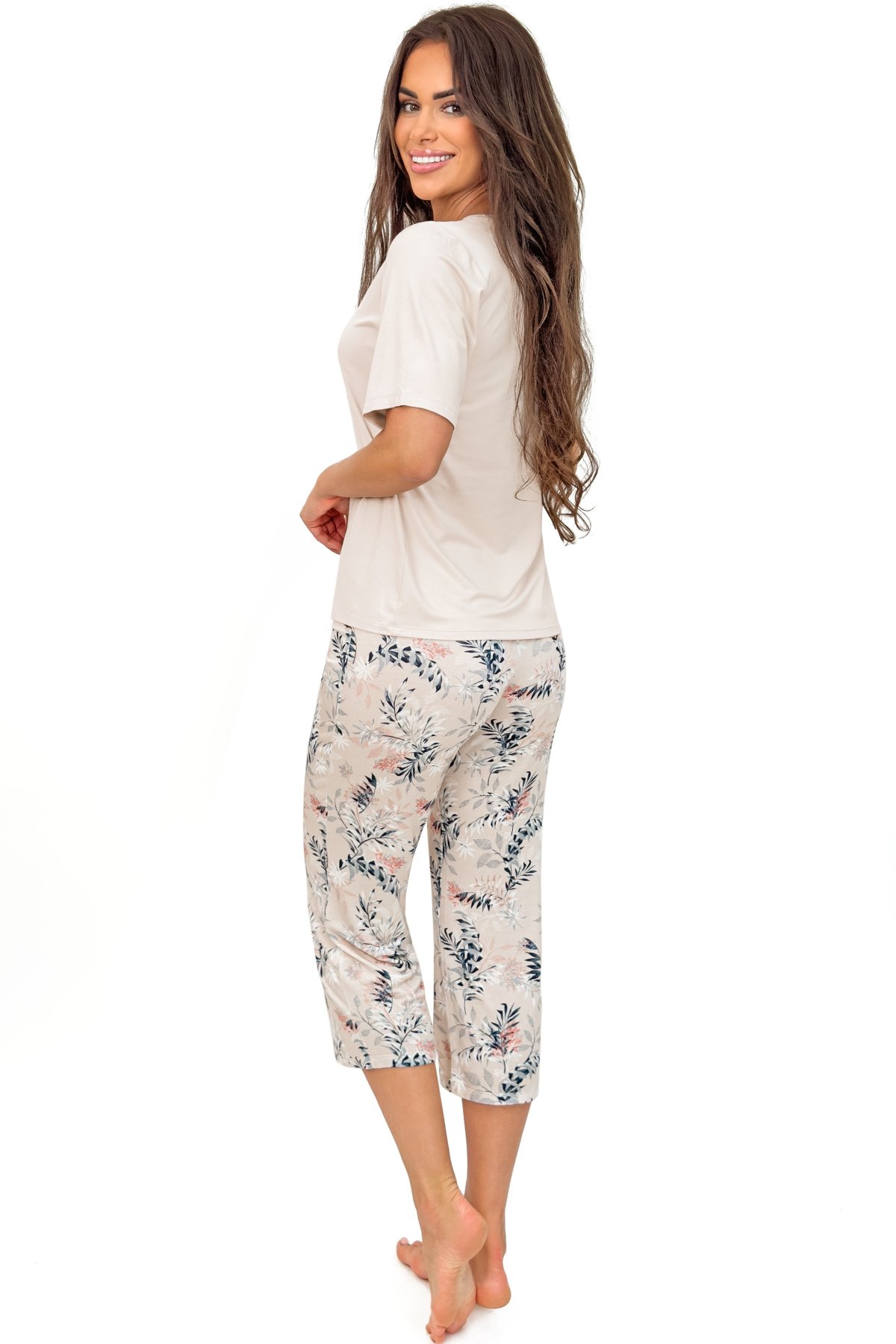 Dámské 3/4 pyžamo Goya spojuje jemnou viskózu s klidným, ženským vzhledem. Béžový horní díl působí velmi čistě a díky krajce u výstřihu získává romantický nádech. Lehce prodloužený rukáv přispívá k příjemnému nošení i mimo teplejší noci. Kalhoty s květinovým vzorem ve 3/4 délce doplňují komplet o výraznější kontrast, přitom si zachovávají klasický a pohodlný střih. Materiál s podílem elastanu se lépe přizpůsobí pohybu. V pase elastická gumička v tunýlku./