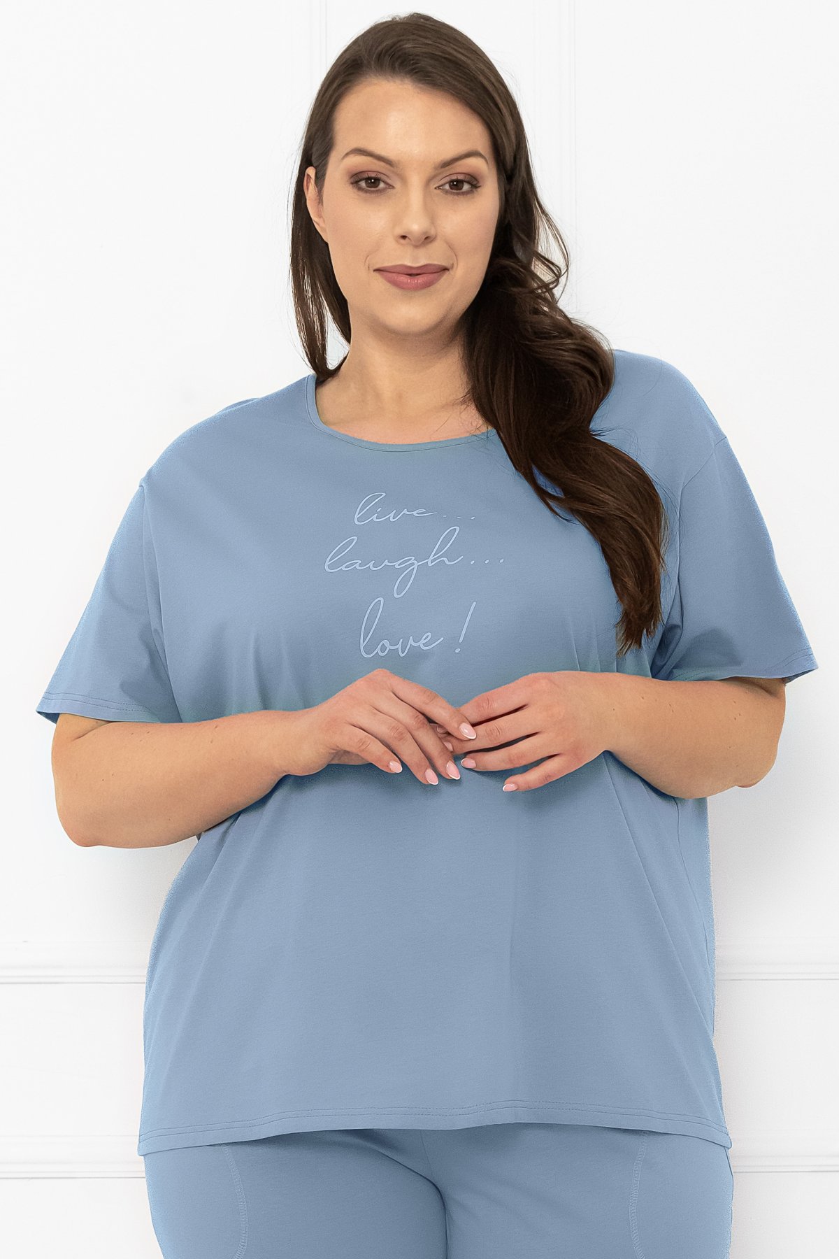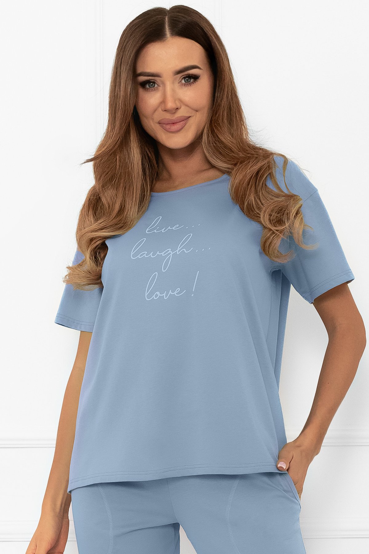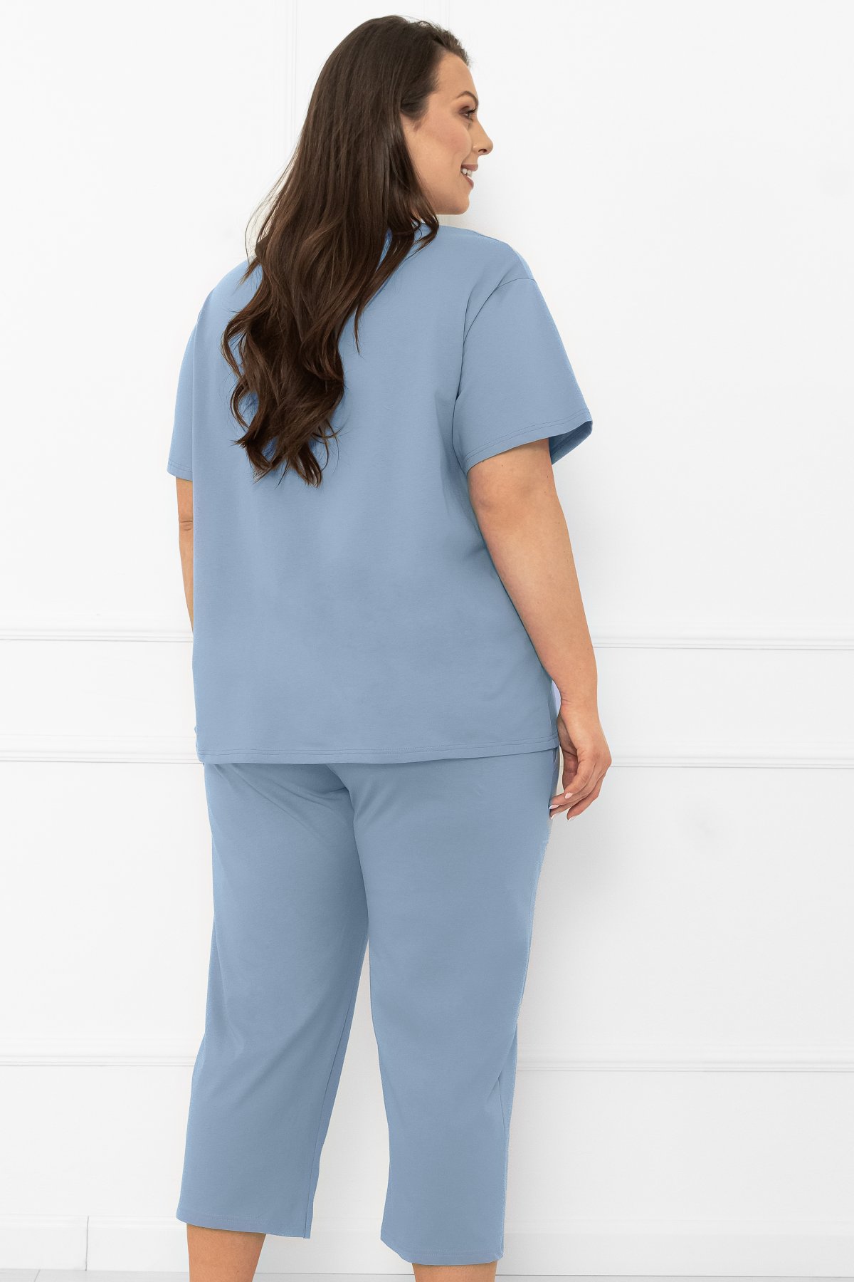Pyžamo Ksara je ideálnou voľbou pre ženy, ktoré hľadajú kombináciu jednoduchosti, pohodlia a prírodných materiálov. Vrchnú časť tvorí tričko s krátkymi rukávmi a okrúhlym výstrihom, ktoré je doplnené decentným nápisom na hrudi, ktorý pôsobí sviežo a mladistvo. Spodnú časť tvoria 3/4 nohavice s voľným strihom a vreckami, ktoré zvyšujú praktickosť a pohodlie. Vďaka elastickému pásu sa pyžamo ľahko prispôsobí telu a poskytuje pocit úplnej voľnosti. Mäkká, priedušná bavlna zaručuje príjemný pocit na pokožke a spoľahlivo vás sprevádza počas spánku a domáceho leňošenia. Tento model je ideálny na teplejšie noci, ale aj na pohodové rána so šálkou kávy.