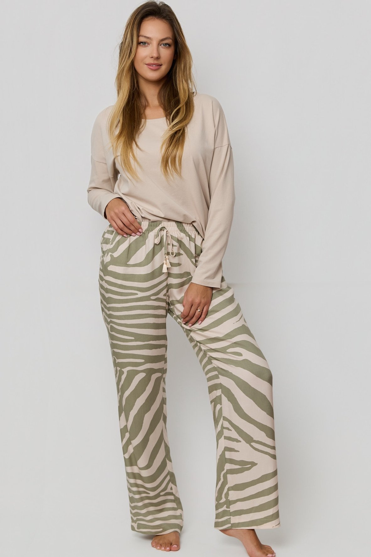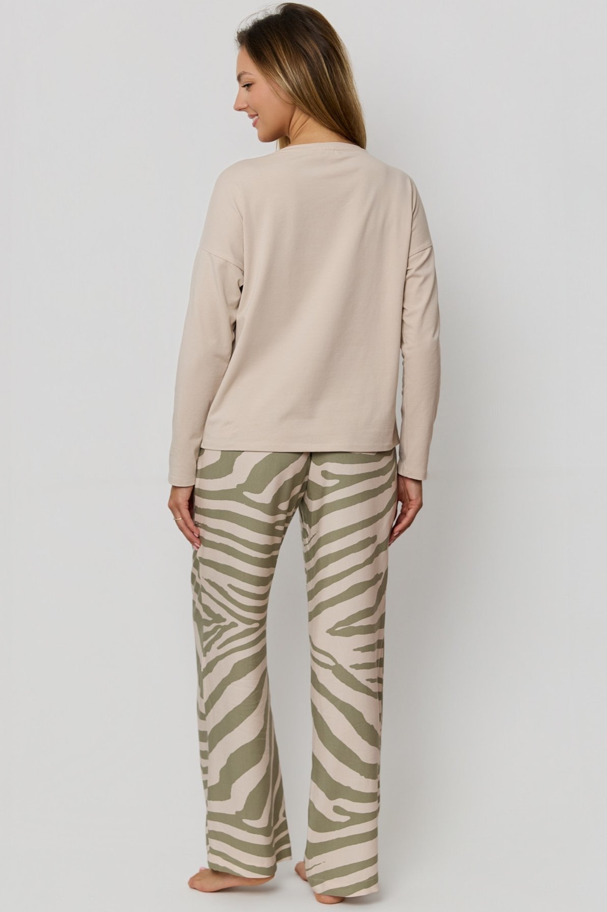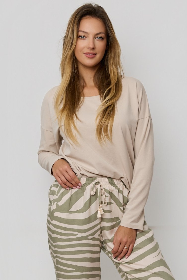 Hladké bavlnené tričko s dlhým rukávom a okrúhlym výstrihom, pôsobí decentne a príjemne sa nosí. Dlhé nohavice so zvieracím vzorom dodávajú súprave moderný vzhľad, praktické vrecká zvyšujú komfort pri nosení a ponúkajú miesto na drobnosti. V páse nechýba sťahovacia šnúrka pre dokonalé prispôsobenie. Voľný strih zaisťuje voľnosť pohybu a maximálne pohodlie po celý deň aj noc. Ideálne pre ženy, ktoré si cenia kvalitu, štýl a mäkký dotyk látky.
