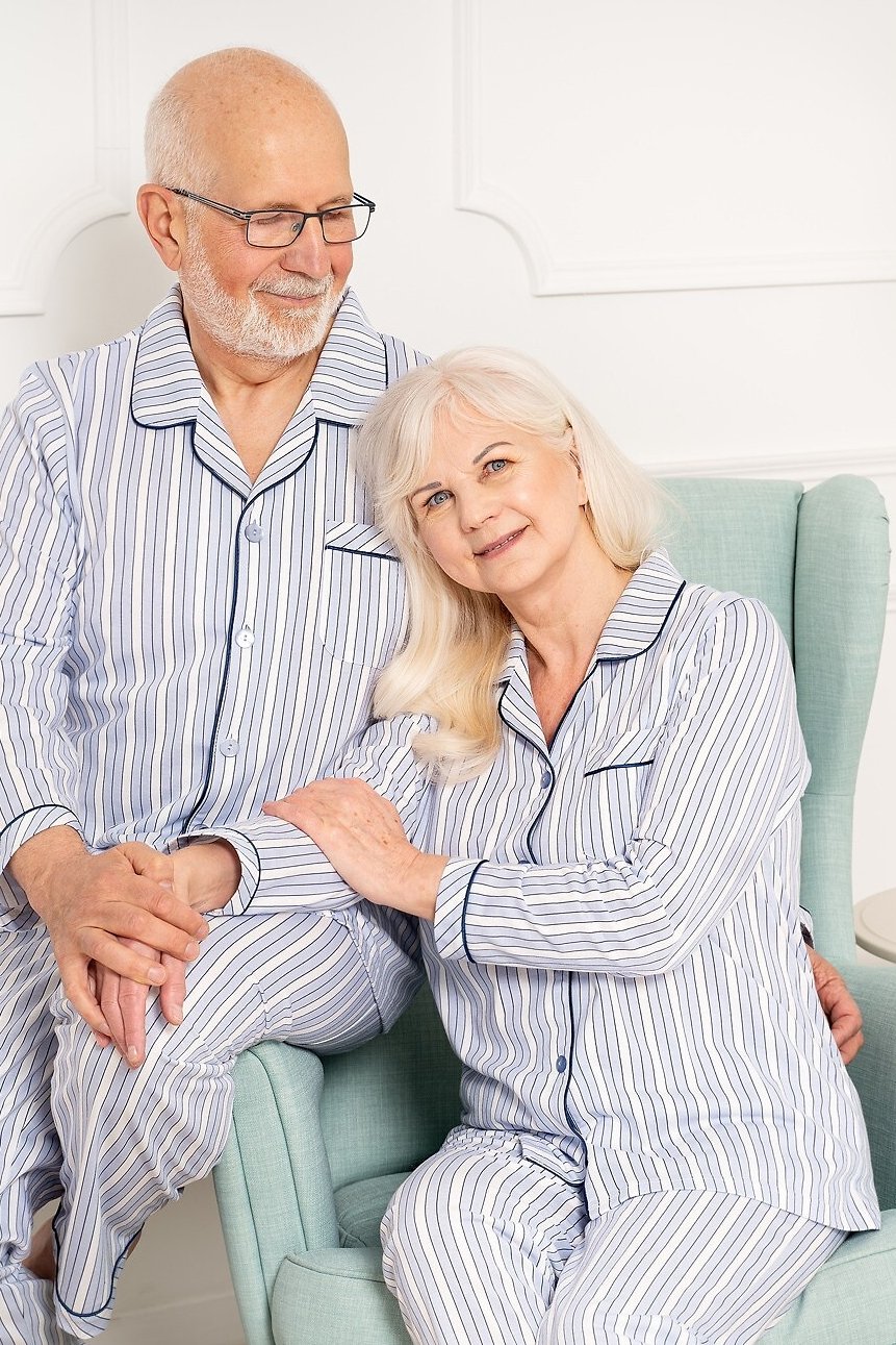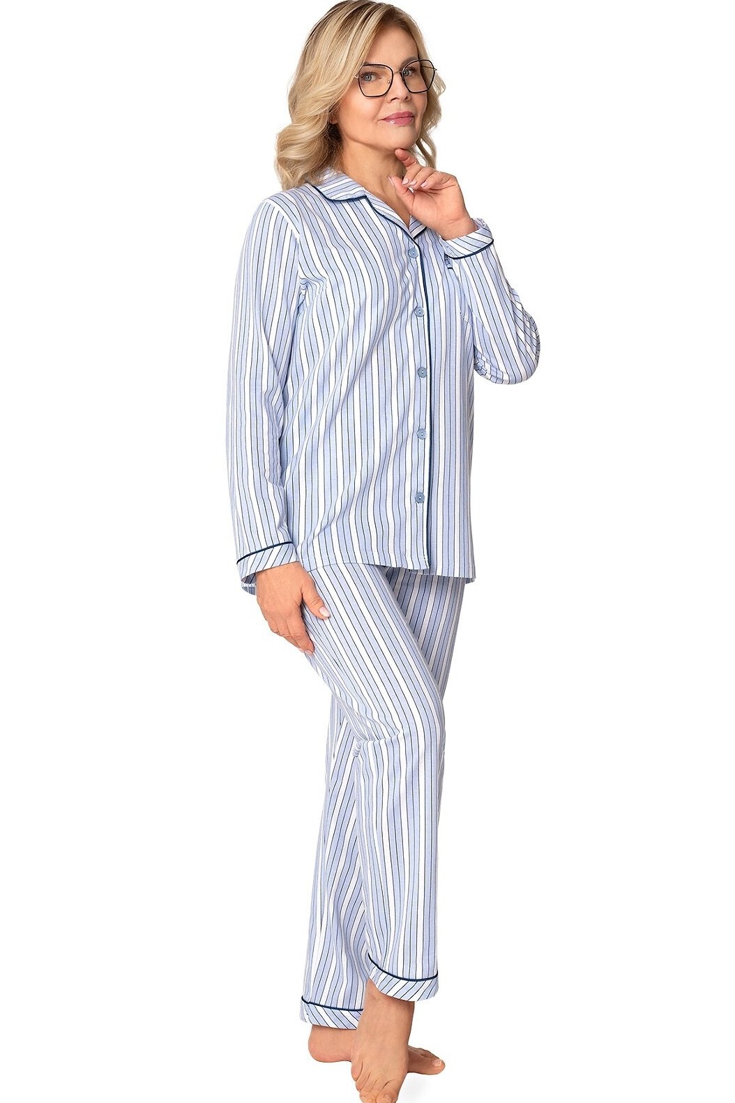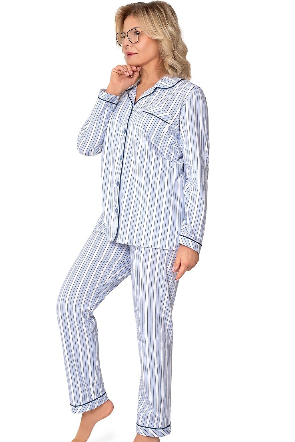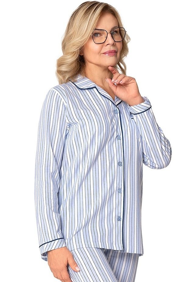 Košile s dlouhým rukávem má elegantní límeček, zapínání na knoflíky a decentní náprsní kapsu, zatímco kontrastní lemování dodává celku šmrnc. Dlouhé kalhoty s rovným střihem zajišťují volnost pohybu a komfort po celou noc. Stylový pruhovaný vzor v bílo-modrém tónu působí čistě, svěže a nadčasově – skvělá volba pro zralé dámy, které preferují klasiku v moderním provedení.