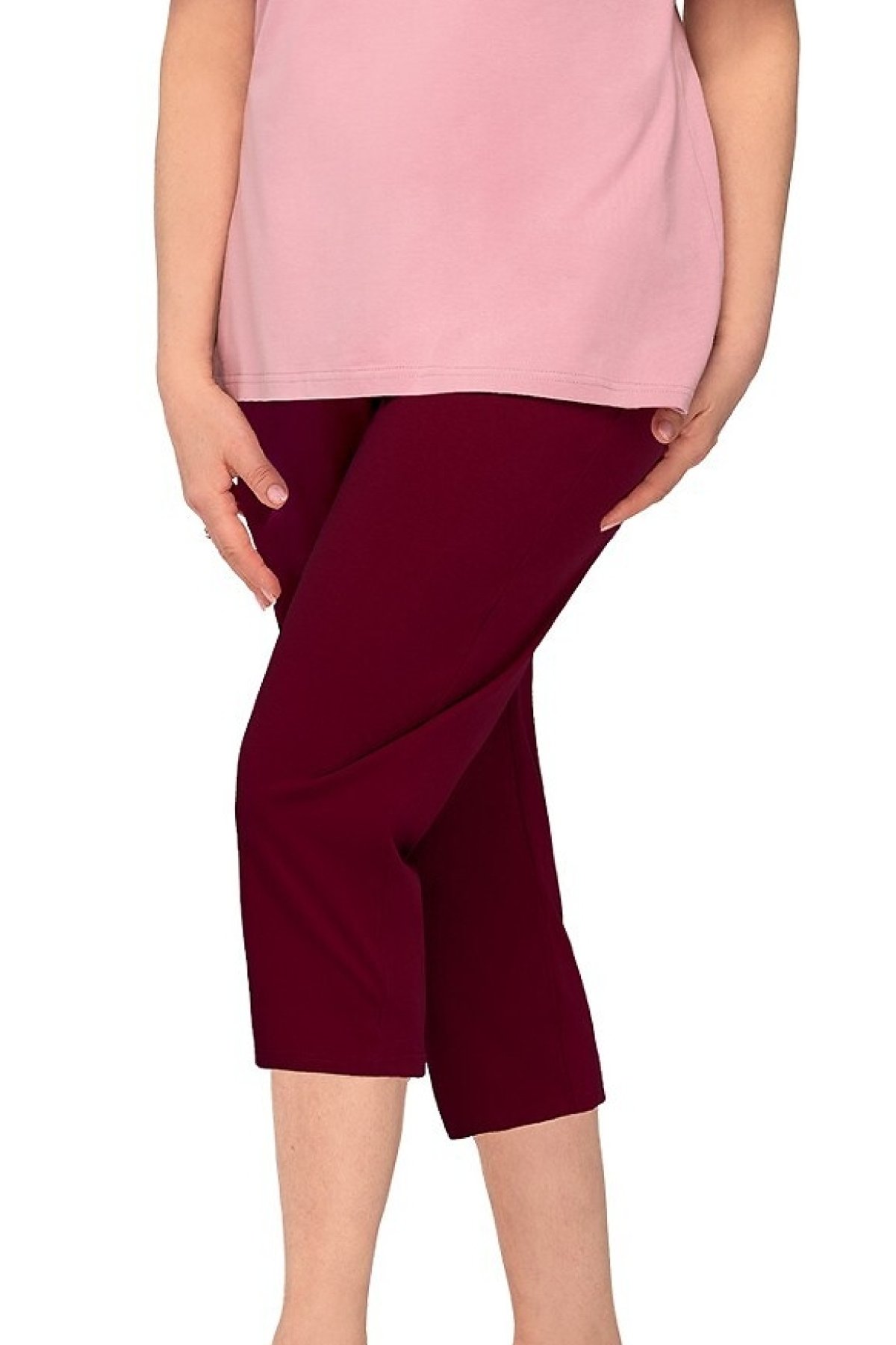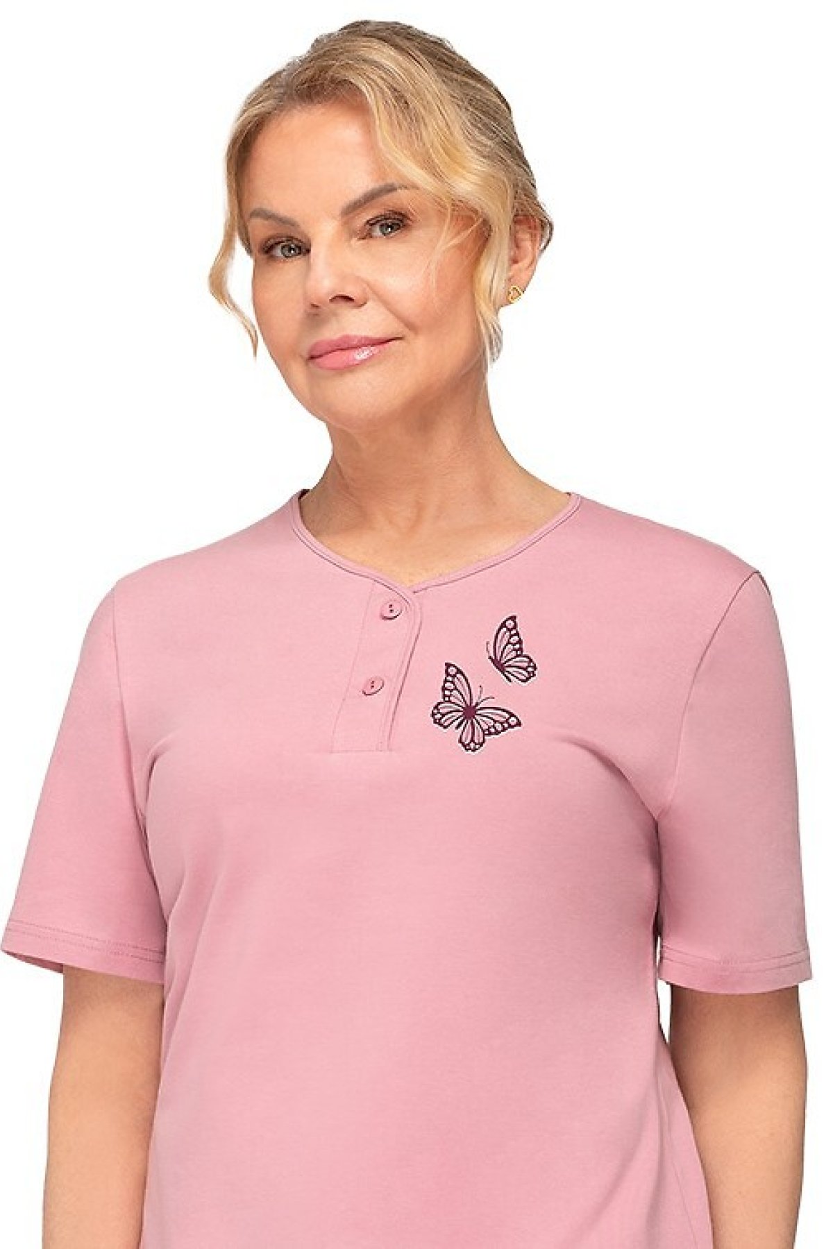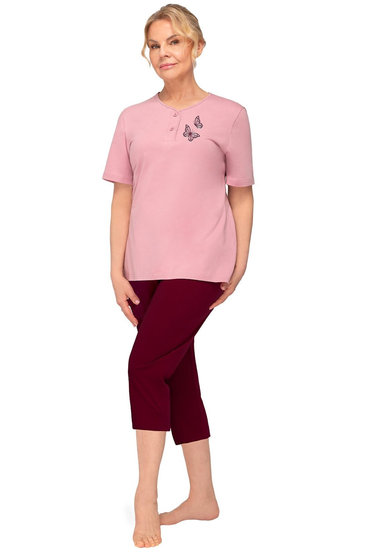 Dámské pyžamo Karina 275 spojuje pohodlný bavlněný materiál a čistý, upravený vzhled. Starorůžové tričko s krátkým rukávem doplňuje výstřih do V se dvěma knoflíčky a jemný motýlí motiv v oblasti hrudi, který působí něžně a nepřeplácaně. Kontrastní 3/4 kalhoty ve vínovém odstínu dodávají kompletu výraznější spodní část, zatímco pružný pas usnadňuje pohodlné nošení během večerního odpočinku i pomalejších rán. Materiál tvoří 100% bavlna.