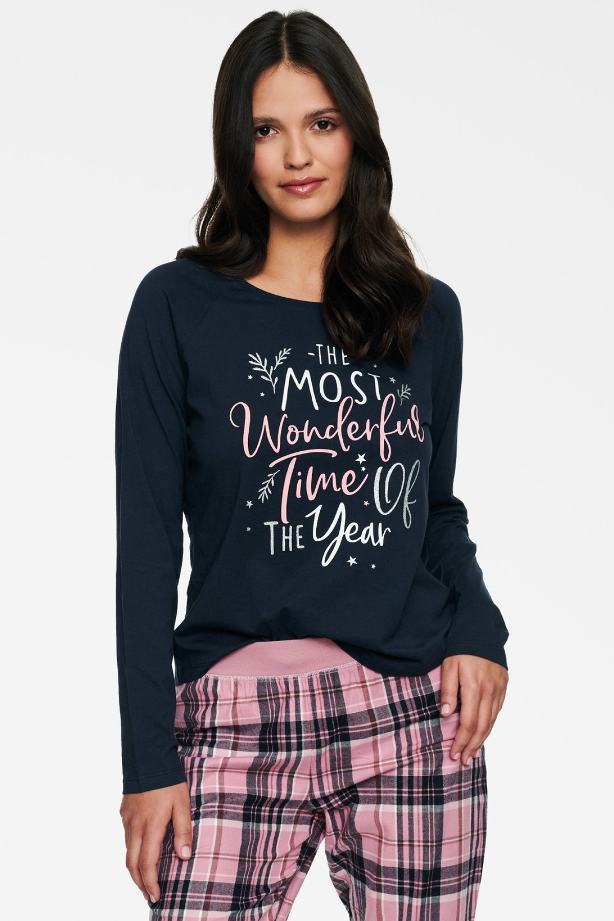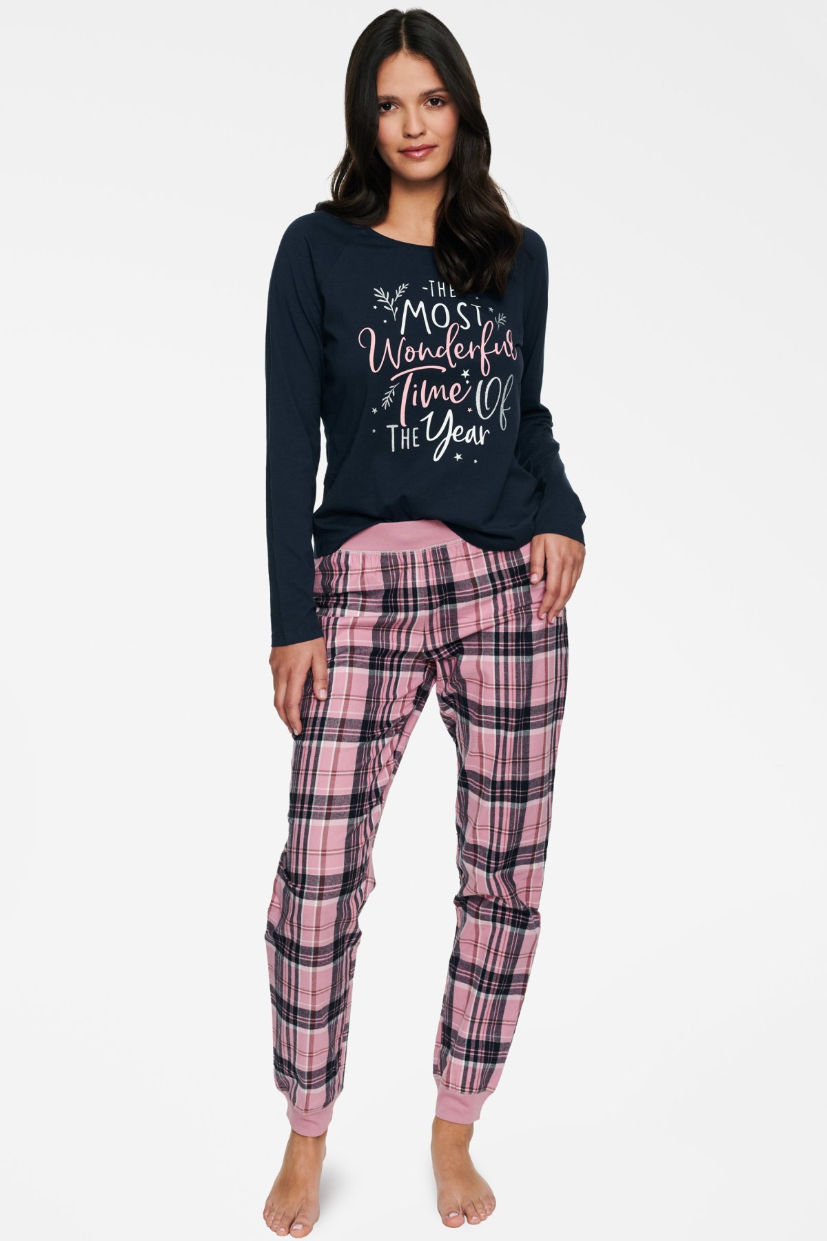 Atraktívne pyžamo v dlhom prevedení. Krásne kontrastné farby a vzory. Dekolt trička je okrúhly, nohavice sú flanelové a príjemné na tele. Pás aj nohavice sú doplnené elastanom. Na tričku navyše vyniká potlač.