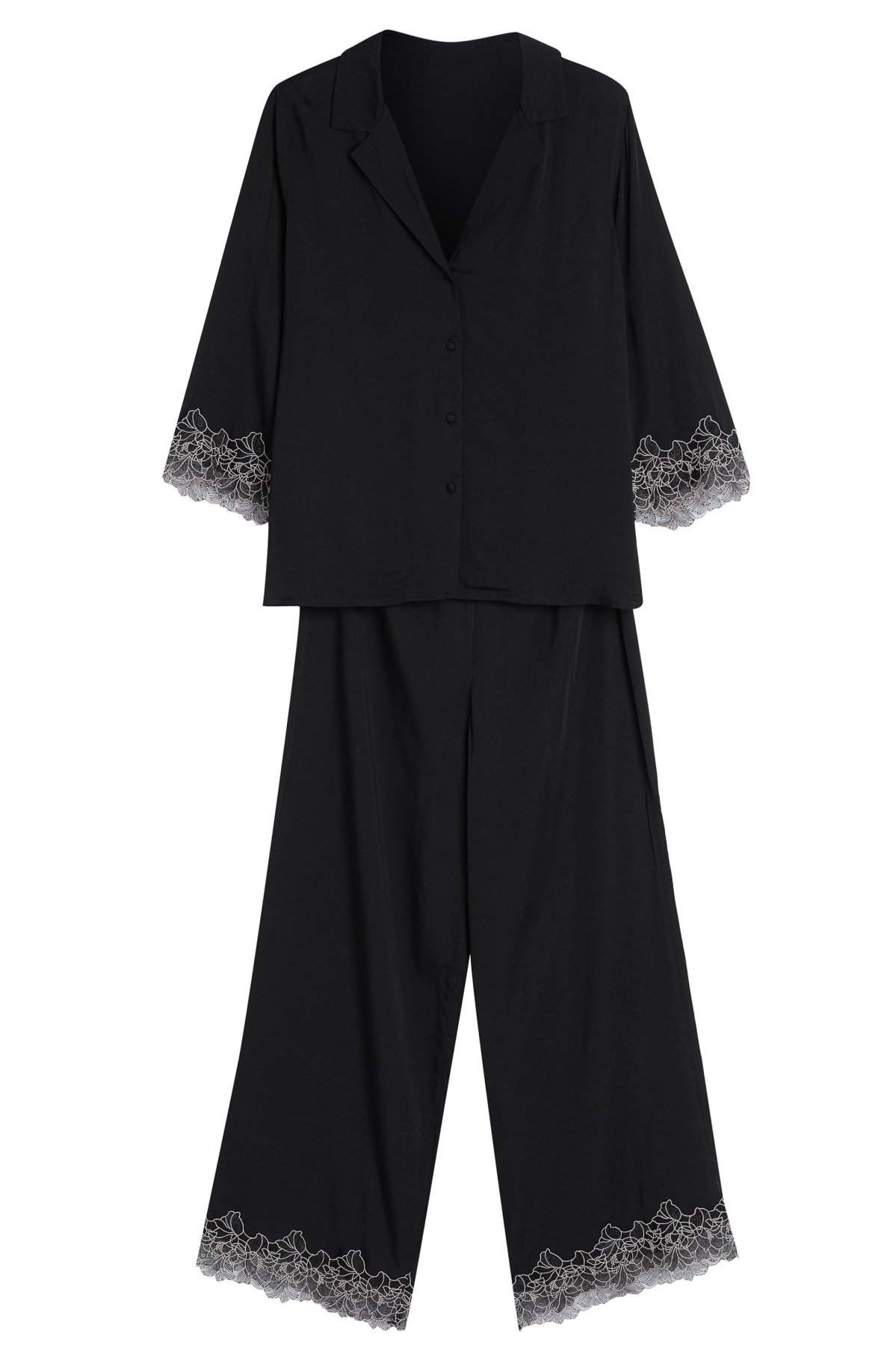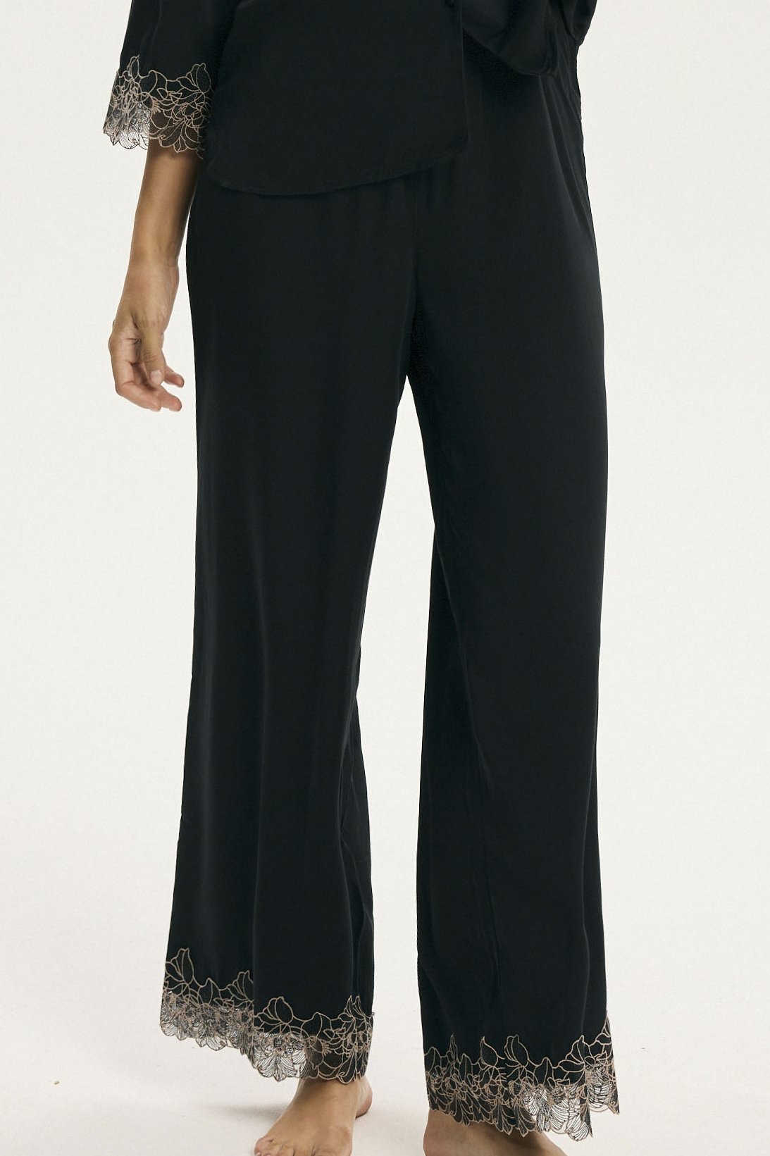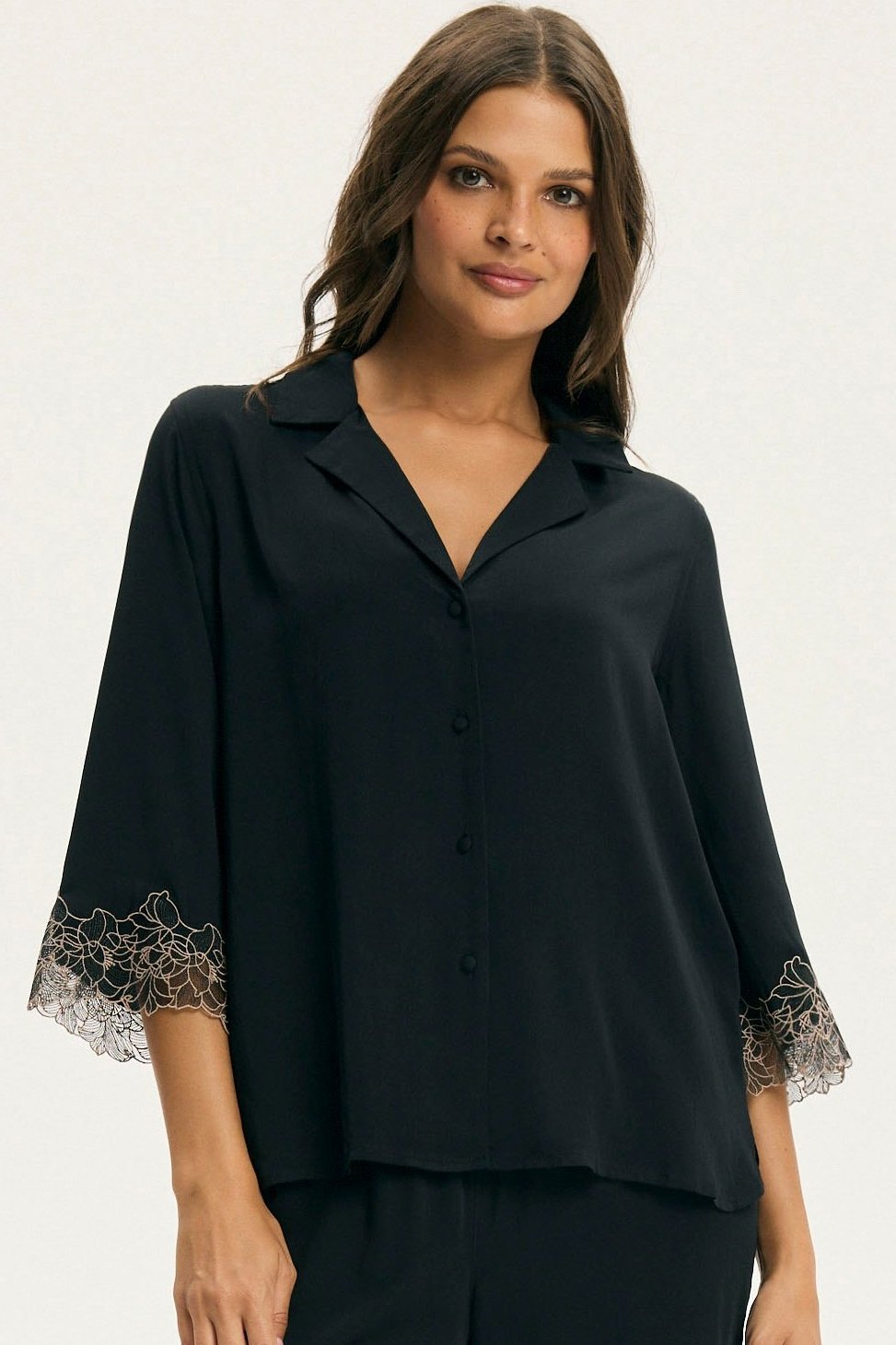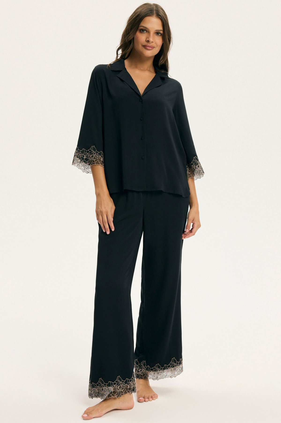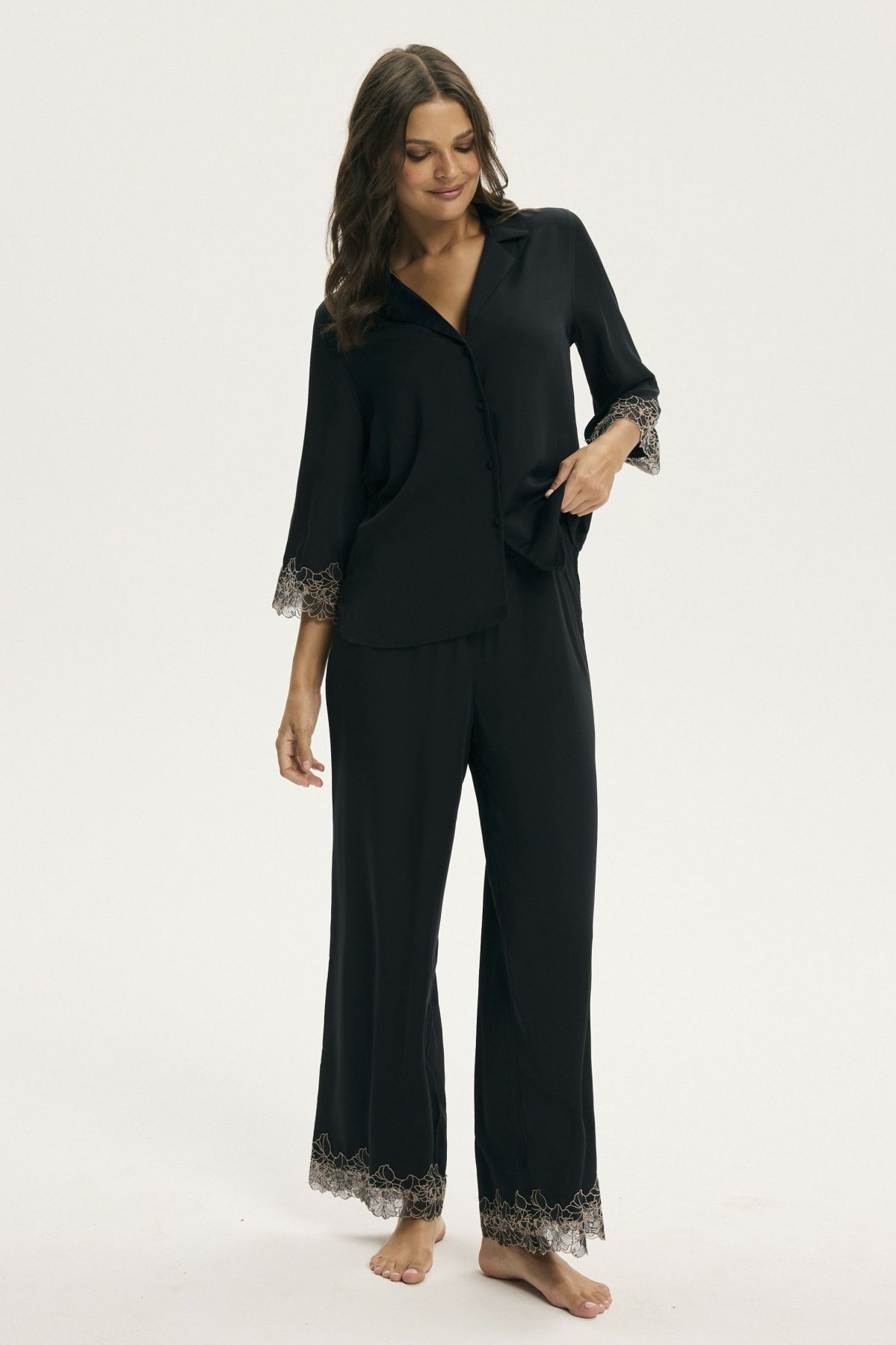 Dámské pyžamo Cotti je dokonalým spojením elegance a komfortu. Vyrobené z přírodní viskózy, je lehké, prodyšné a příjemné na dotek. Jemně splývá po těle a krásně se přizpůsobí postavě, aniž by ji omezovalo v pohybu. Horní díl tvoří lehká košile s límečkem a krajkou zakončenými rukávy. Do kompletu patří dlouhé kalhoty s téže působivým zakončením na nohavicích.
