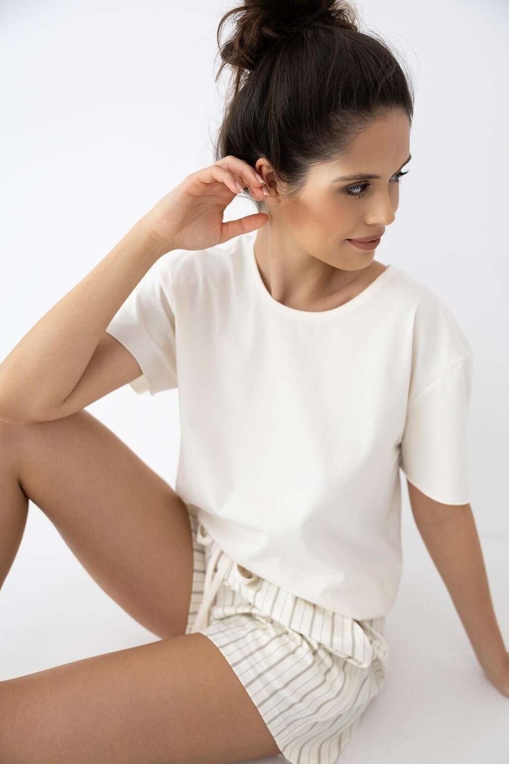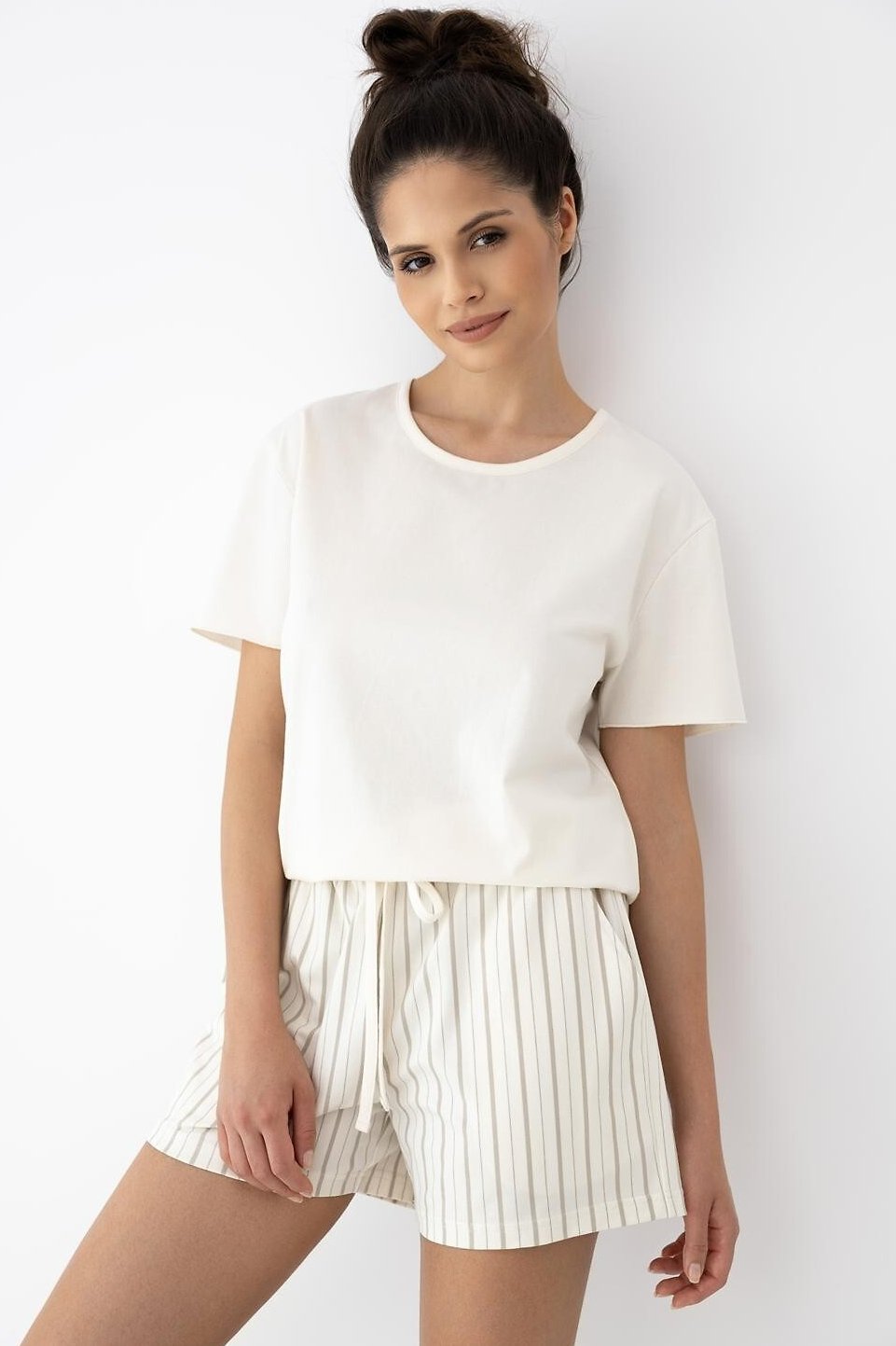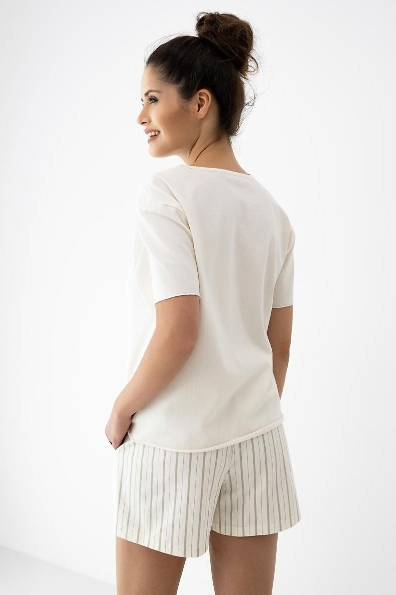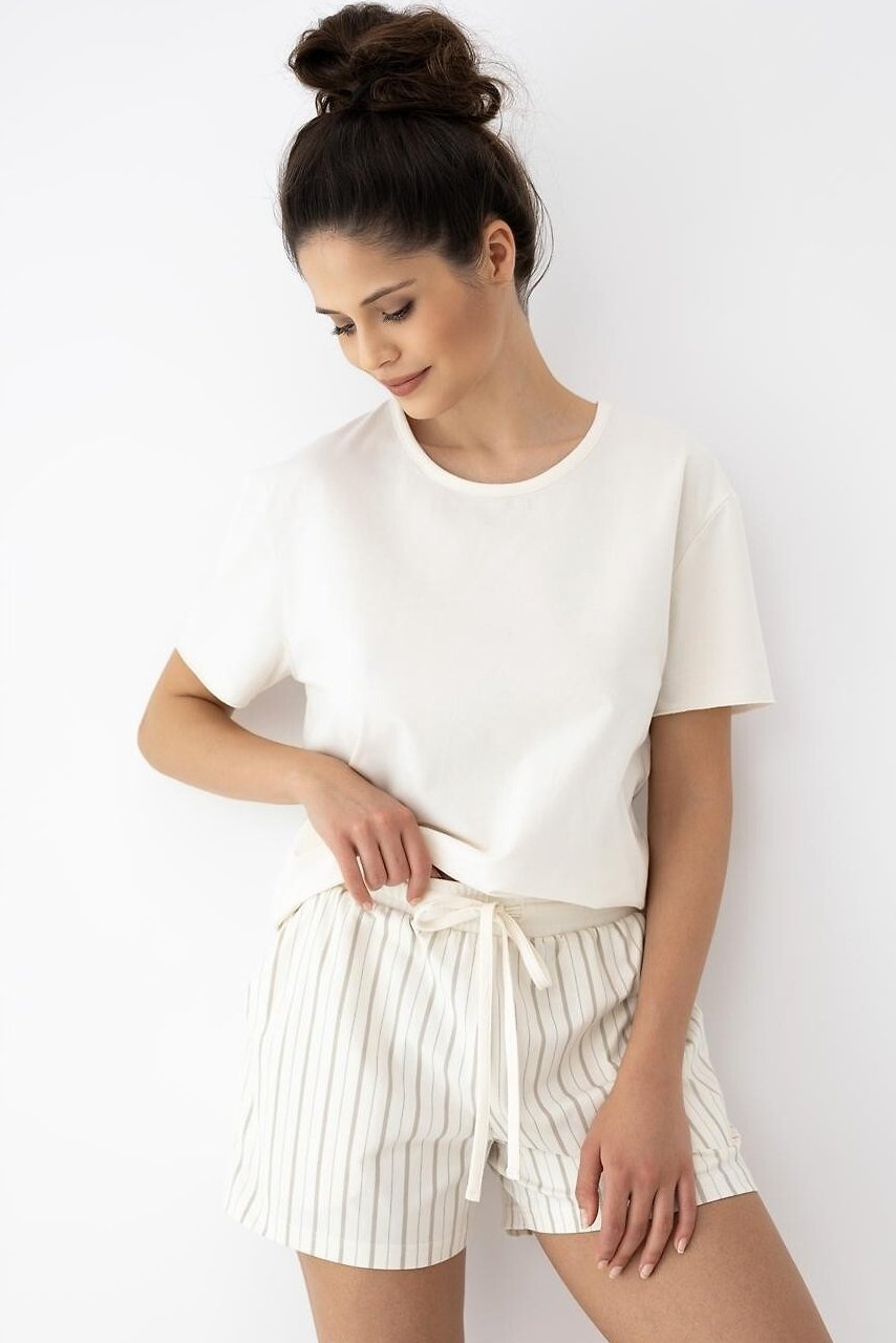 Dámské pyžamo z příjemné bavlněné směsi je skvělé na teplejší noci i domácí pohodu. Tričko s krátkým rukávem a půlkulatým výstřihem sedí přirozeně a nikde netlačí. Do kompletu patří šortky s proužkovaným printem, které dodají setu lehký, svěží vzhled. Pas je řešený gumou a doplněný šňůrkou – snadno si ho upravíte podle sebe a zavážete do mašličky. Díky příměsi elastanu látka jemně pruží, lépe drží tvar a příjemně se přizpůsobí pohybu. Výsledkem je jednoduchý, praktický komplet, po kterém sáhnete znovu a znovu.