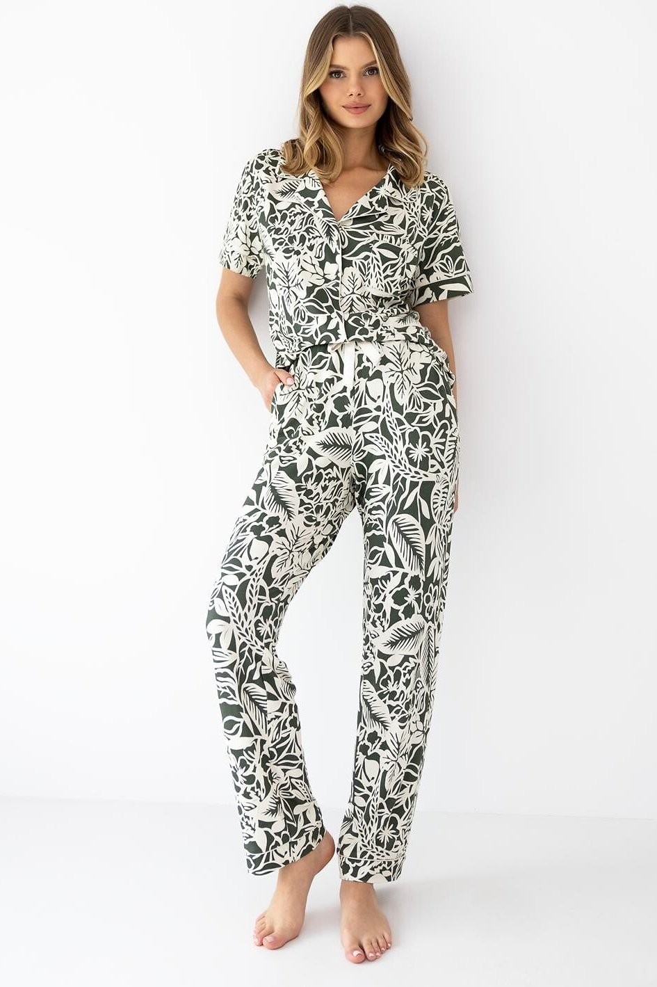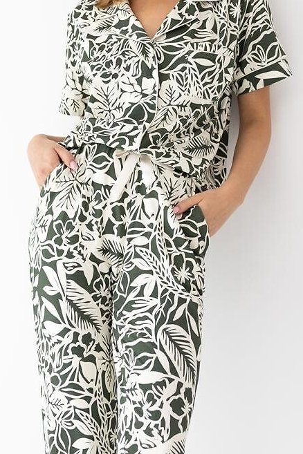 Tohle dámské pyžamo je jako stvořené pro chvíle, kdy chcete lehkost, jemnost a upravený vzhled i doma. Viskóza je příjemně chladivá, krásně splývá a díky elastanu se pohodlně přizpůsobí pohybu. Košilový střih s límečkem a zapínáním na knoflíky působí elegantně, zároveň je praktický na oblékání. Květinový print dodá modelu romantický nádech a kapsička na prsou podtrhne „pyžamový set“ styl. Dlouhé rovné kalhoty mají komfortní pas s měkkou gumou potaženou úpletem, doplněný saténovou mašličkou pro jemný detail. Ideální na klidné večery i pohodová rána.