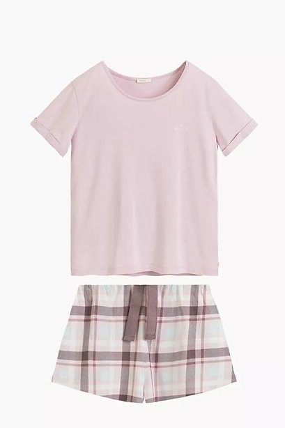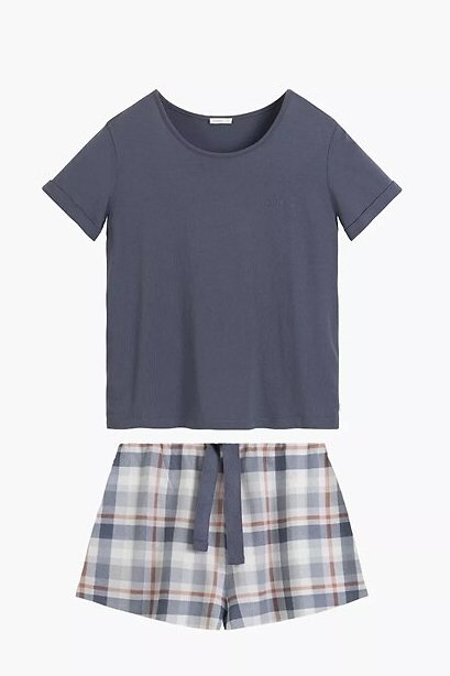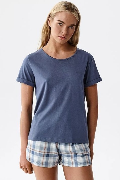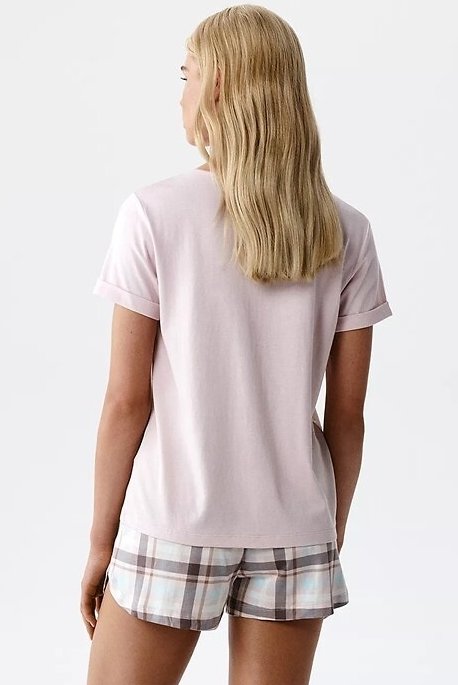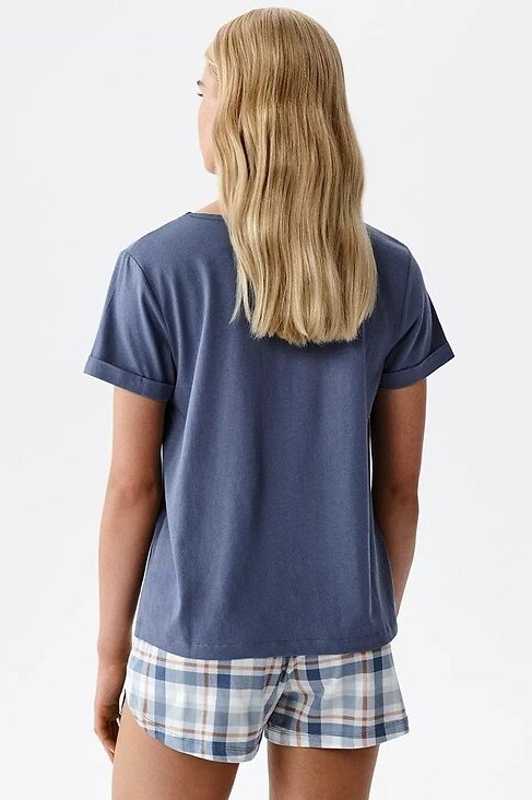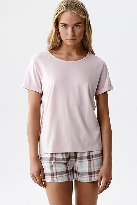 Lehké dámské pyžamo, které spojuje minimalistický styl s pohodlím. Hladké tričko s jednoduchým střihem se hezky přizpůsobí postavě a dopřeje volnost pohybu, zatímco šortky v klasické kostce dodají celku nadčasový vzhled. Měkká, prodyšná směs bavlny a modalu zajišťuje, že úplet působí příjemně „chladivě“ a skvěle se hodí na teplejší noci. Je to set, po kterém sáhnete automaticky: na spaní, na víkendové ráno i na domácí relax – všude tam, kde rozhoduje lehkost a komfort.